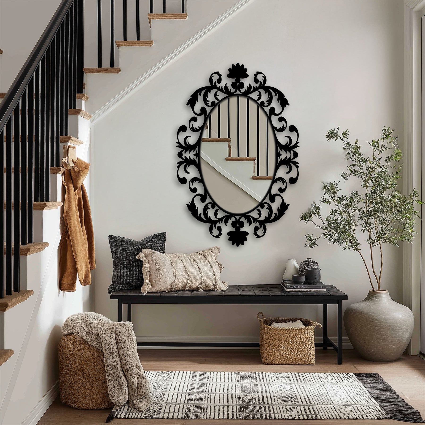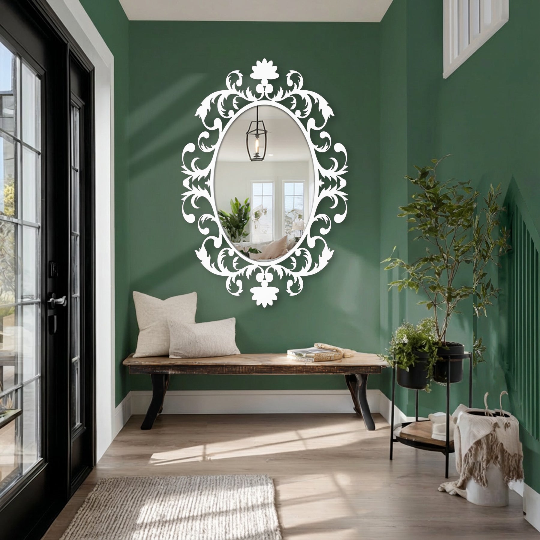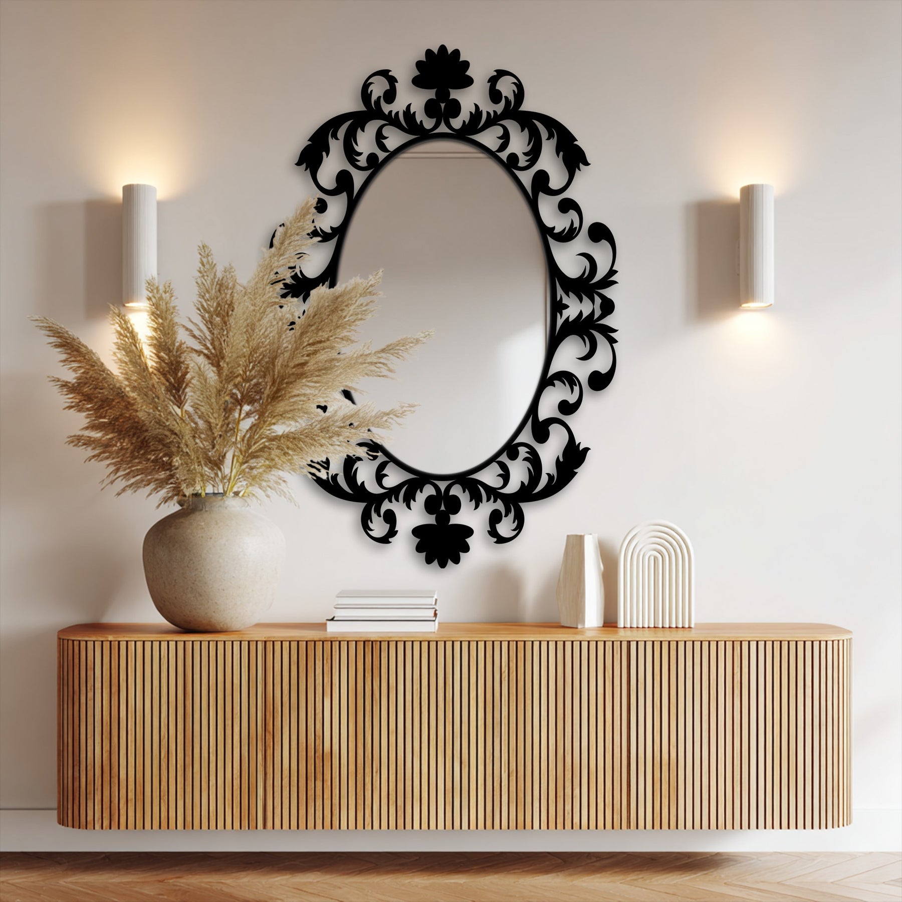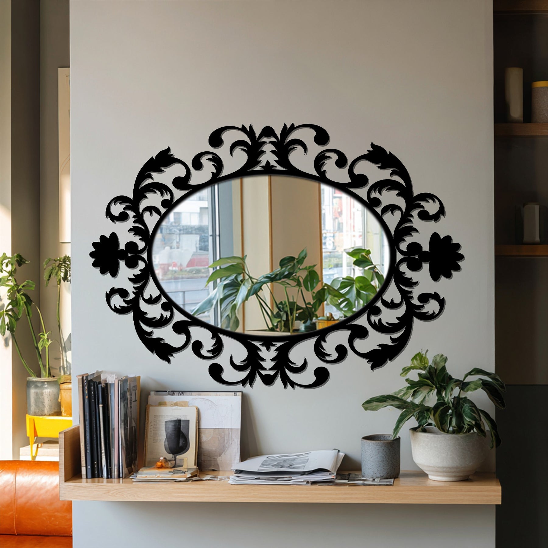 Displayed as standout mirror wall decor, this decorative wall mirror transforms everyday spaces into curated environments. The airy scrollwork maintains balance and visual lightness while still offering bold ornamental presence.