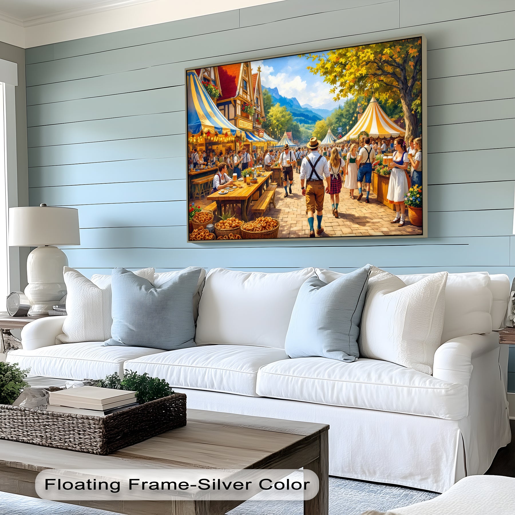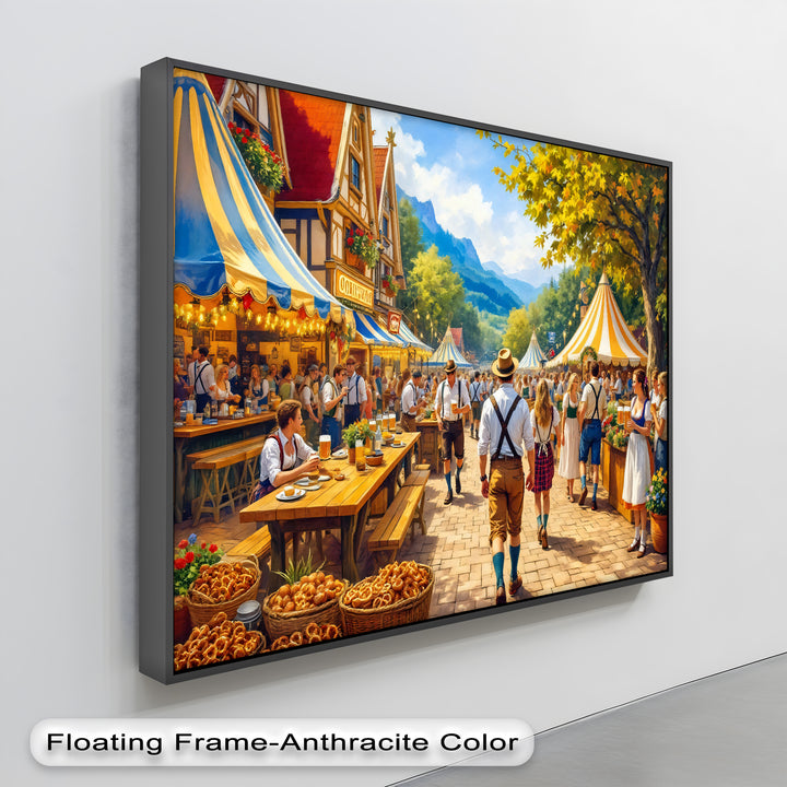 Bring the magic of Munich’s Oktoberfest into your space with this Bavarian beer festival canvas print. The artwork captures a festive village street alive with tradition — striped beer tents, timber-framed houses, overflowing baskets of pretzels, and crowds dressed in lederhosen and dirndls.