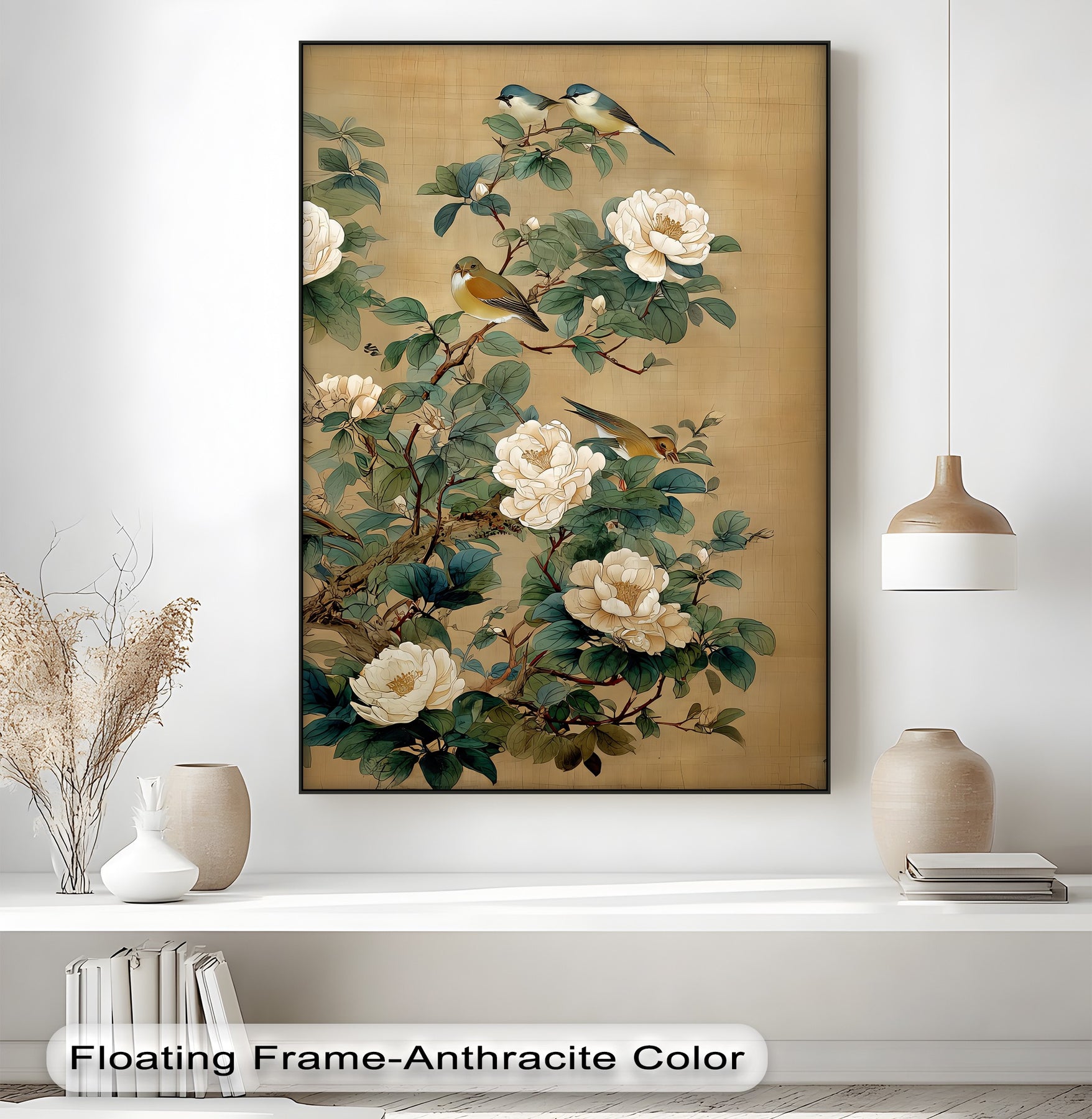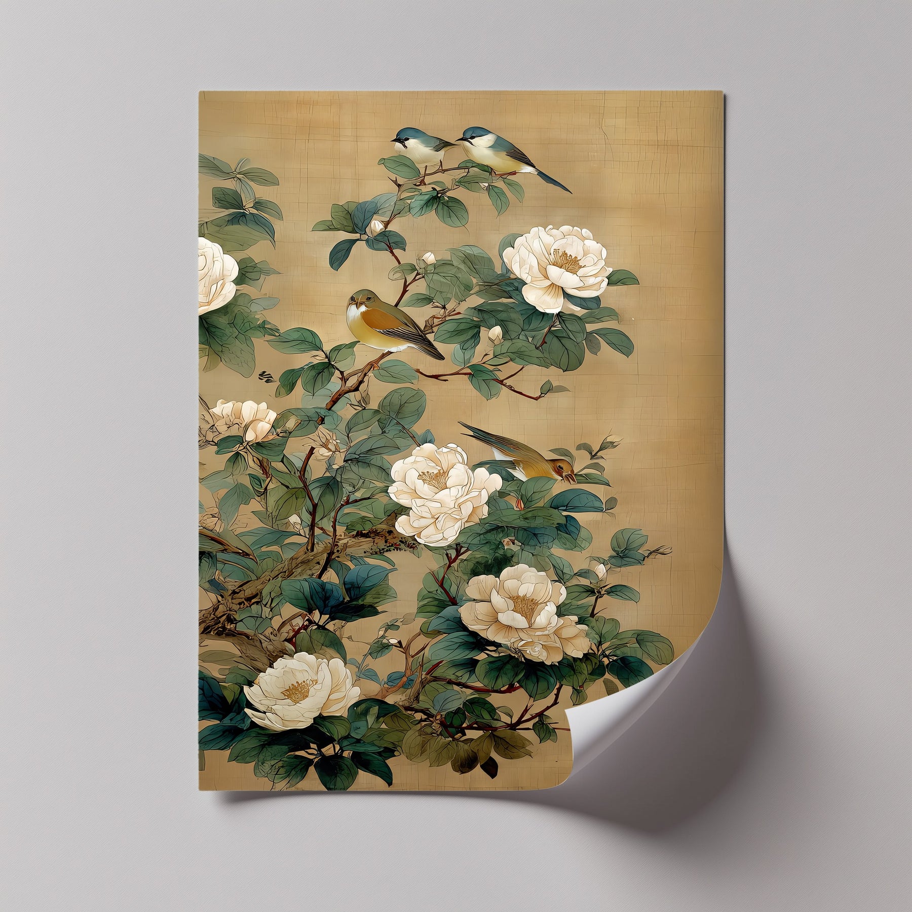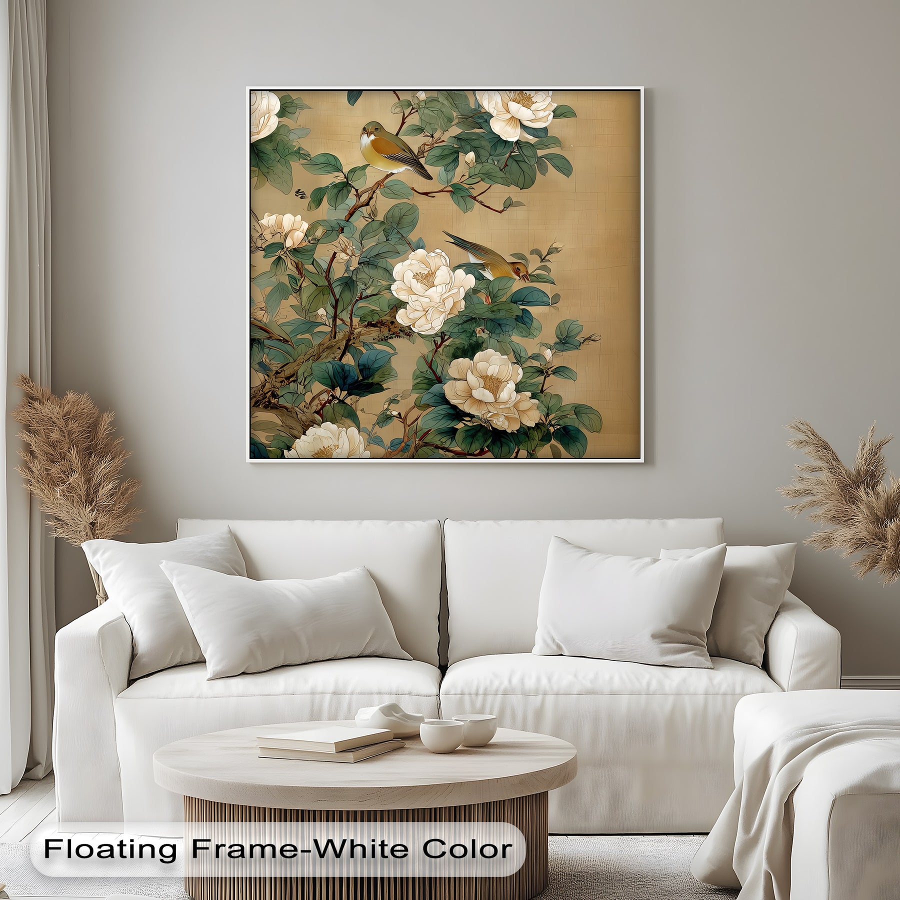 Celebrate the elegance of nature with Blossom Harmony, a serene canvas wall art featuring delicate white peonies intertwined with vibrant songbirds. The soft beige backdrop enhances the rich greens and gentle floral details, while the perched birds bring movement and life into the composition.