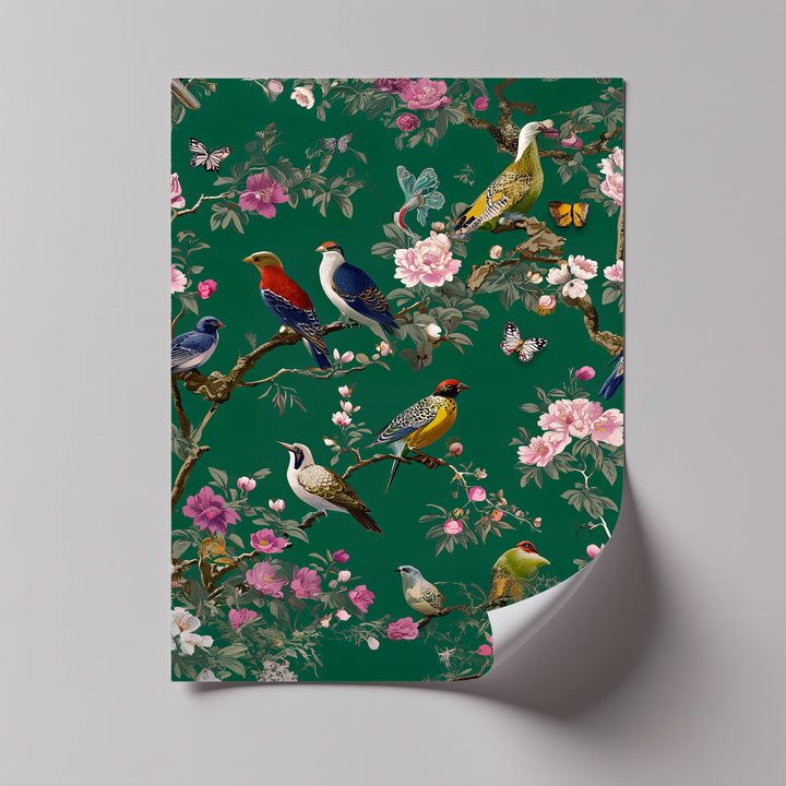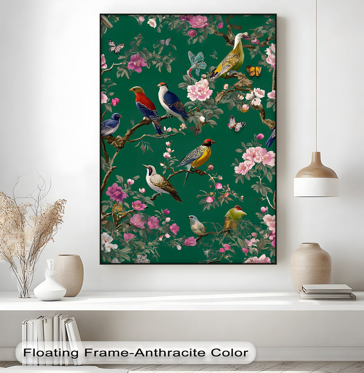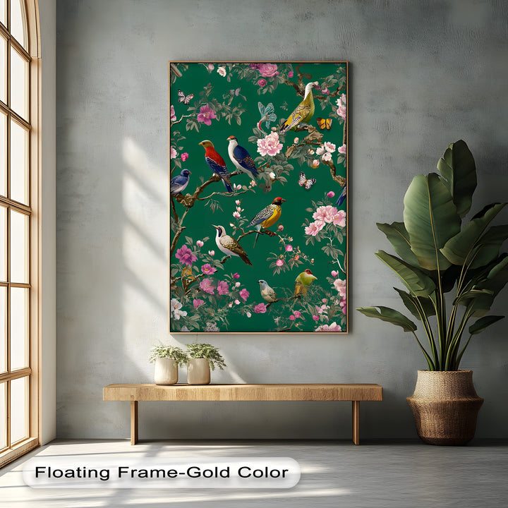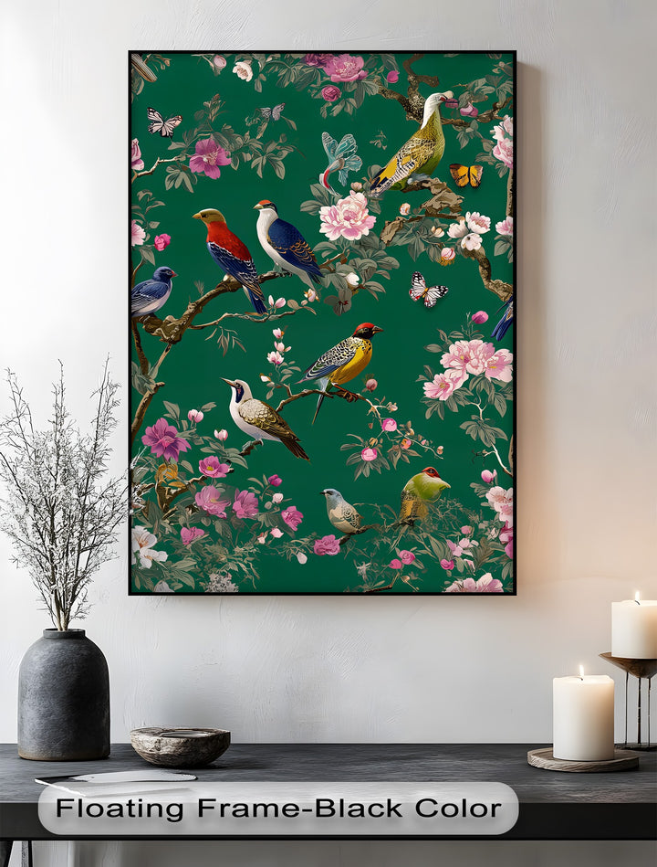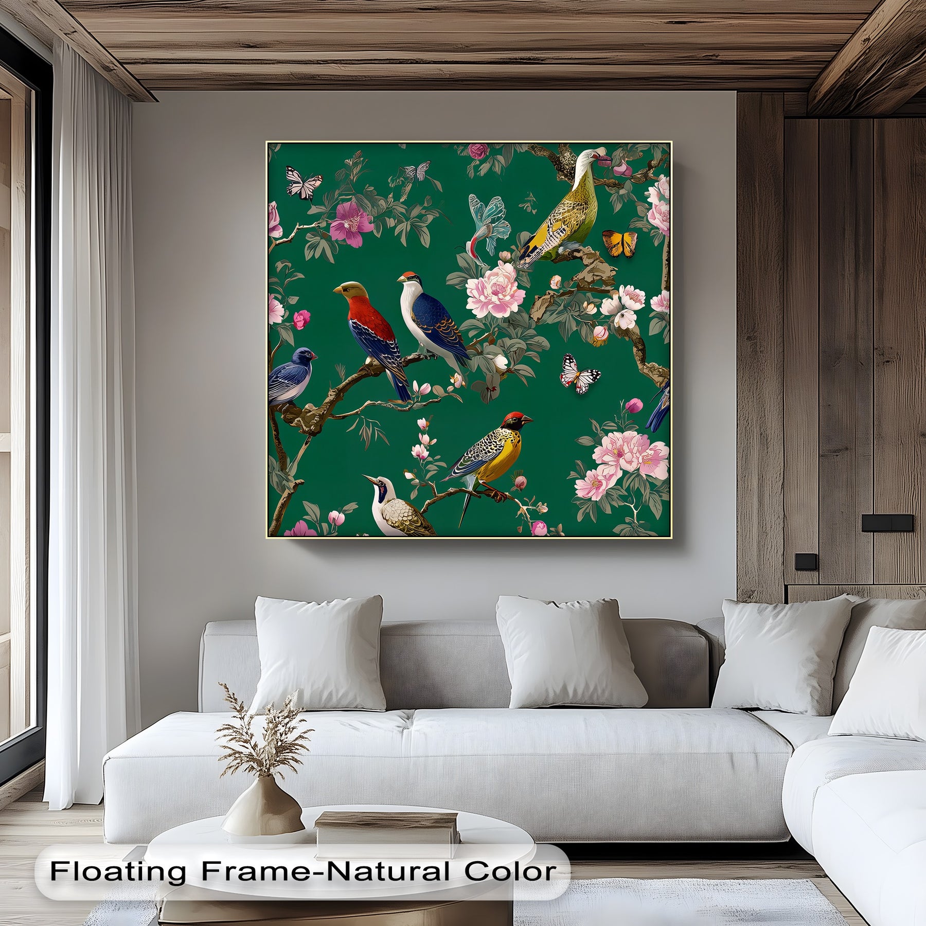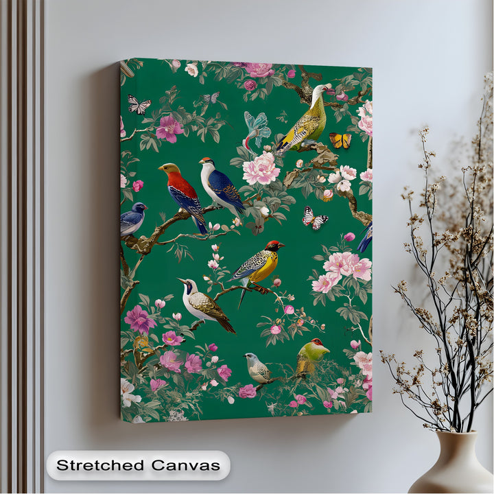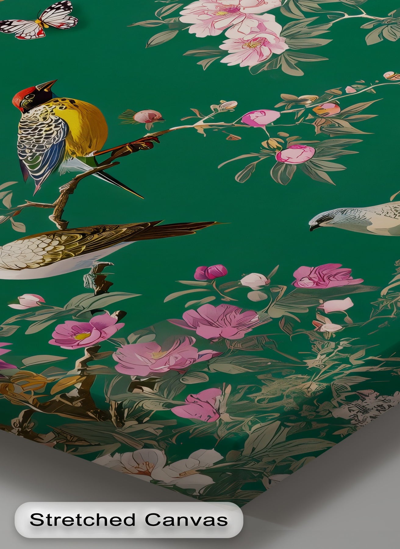 Perfect as framed canvas wall art, this piece captures the spirit of a flourishing garden, making it ideal for living rooms, bedrooms, or creative workspaces. The deep green backdrop enhances the contrast of the vivid bird feathers and delicate blossoms, transforming your walls into a botanical paradise.