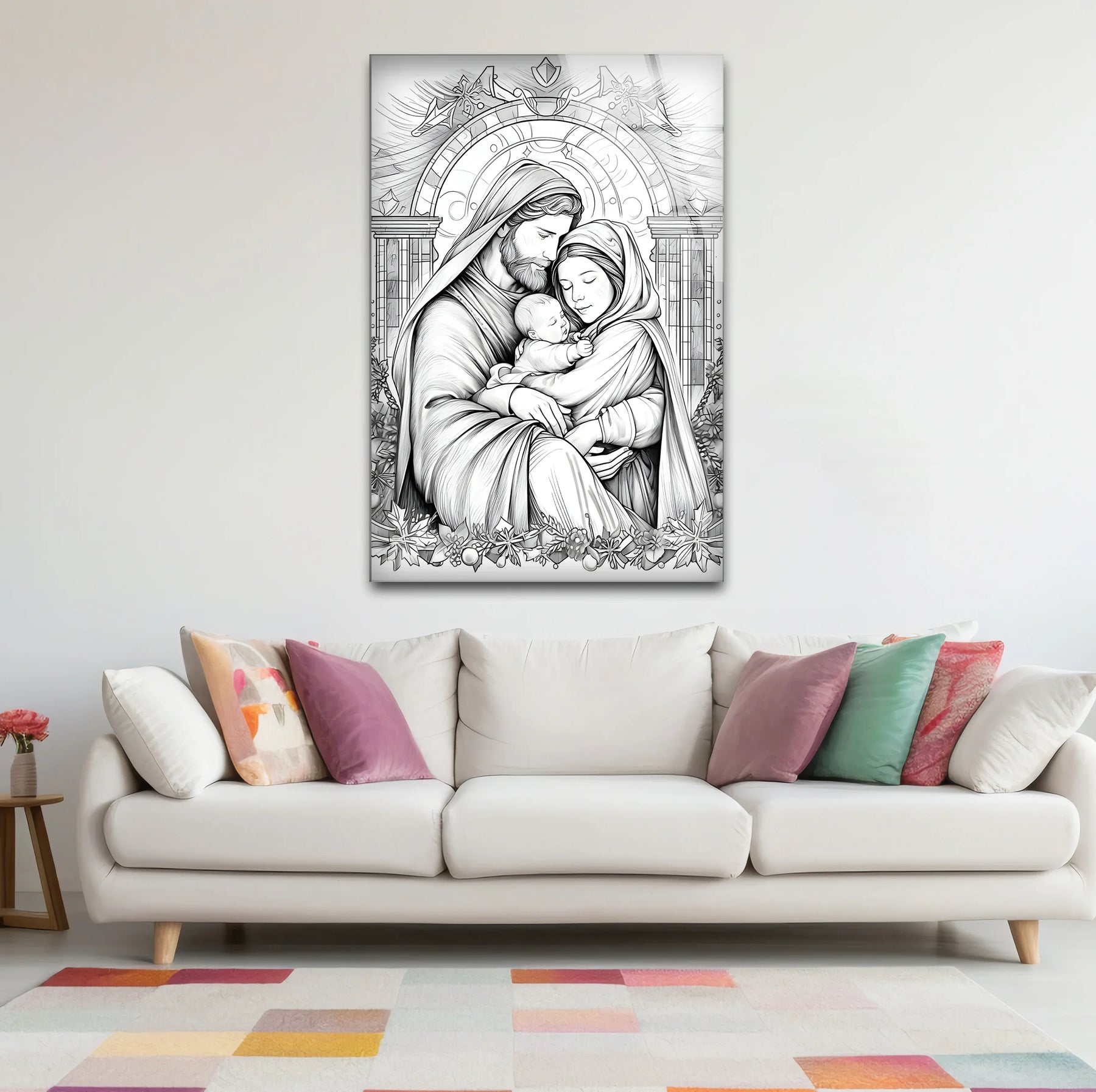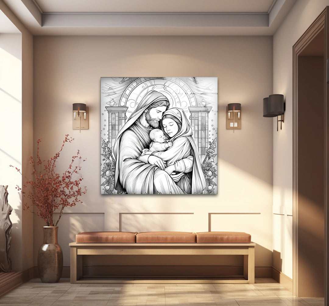 Embrace the warmth and love of the holiday season with this stunning Black & White Christmas Soul Glass Wall Art. Featuring a tender depiction of a holy family surrounded by intricate seasonal details, this black and white painting radiates serenity and joy. Perfect for living rooms, prayer spaces, or holiday décor, it adds an elegant and spiritual touch to any setting.