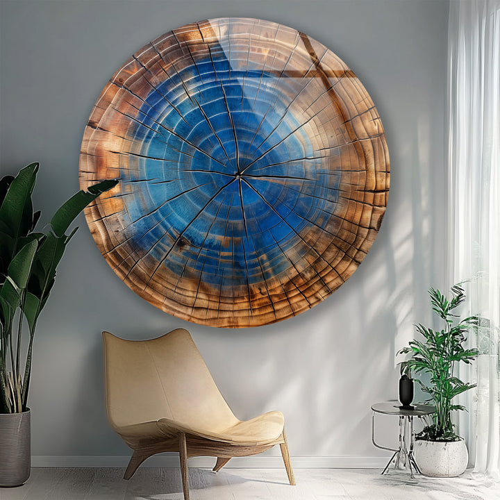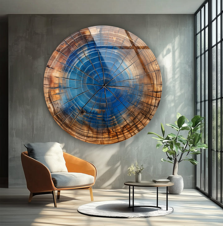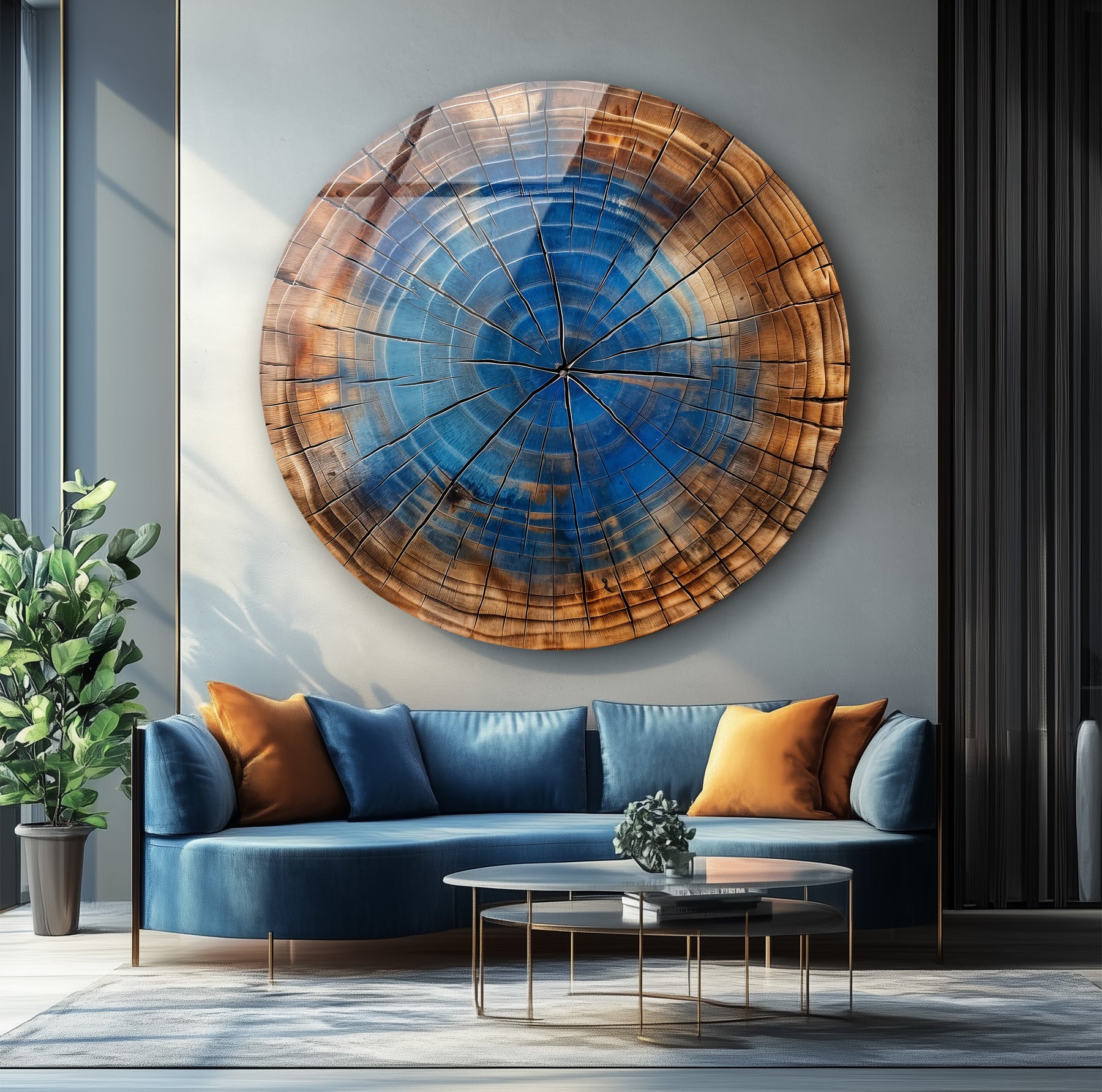 Blue Core Timber – Rustic Round Glass Wall Art captures the natural elegance of wood intertwined with the tranquil depth of ocean blue. The design resembles a tree’s life rings, blending warm earthy browns with soothing cobalt tones to create a perfect balance between nature and modern artistry. The reflective glass surface gives it a polished, contemporary finish that highlights both texture and color.
