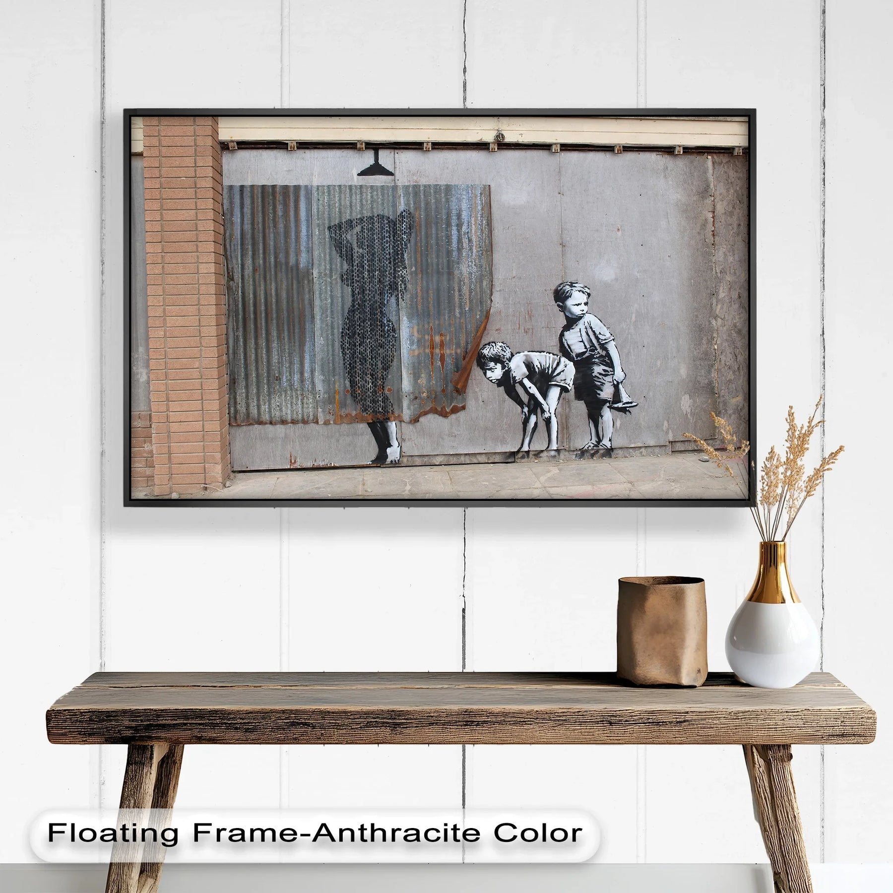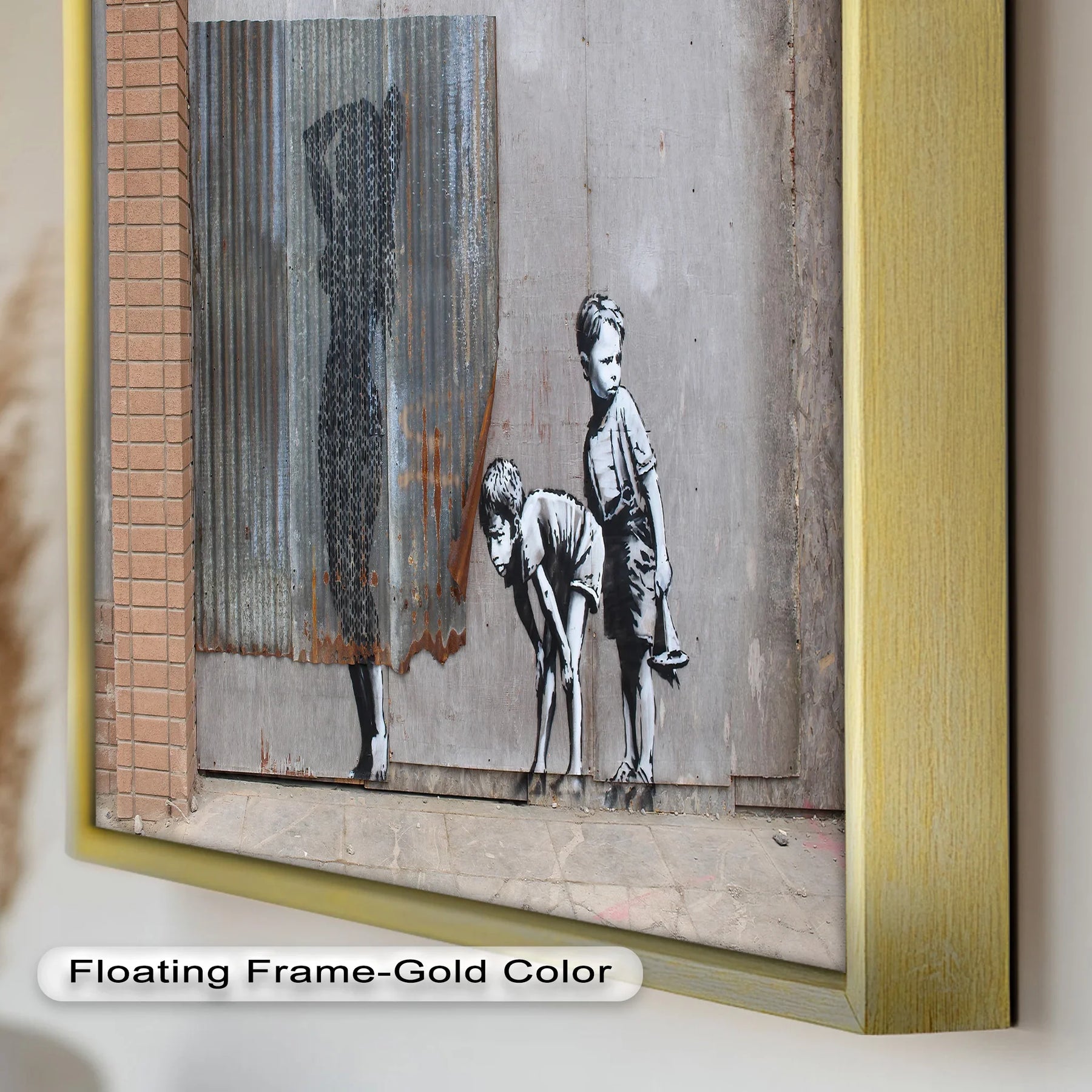 Set against a raw, graffitied city wall, this piece delivers Banksy’s trademark irony with a punch: innocence clashes with authority, and playtime becomes protest. The children, undeterred by their makeshift gear, represent a generation unafraid to take action.