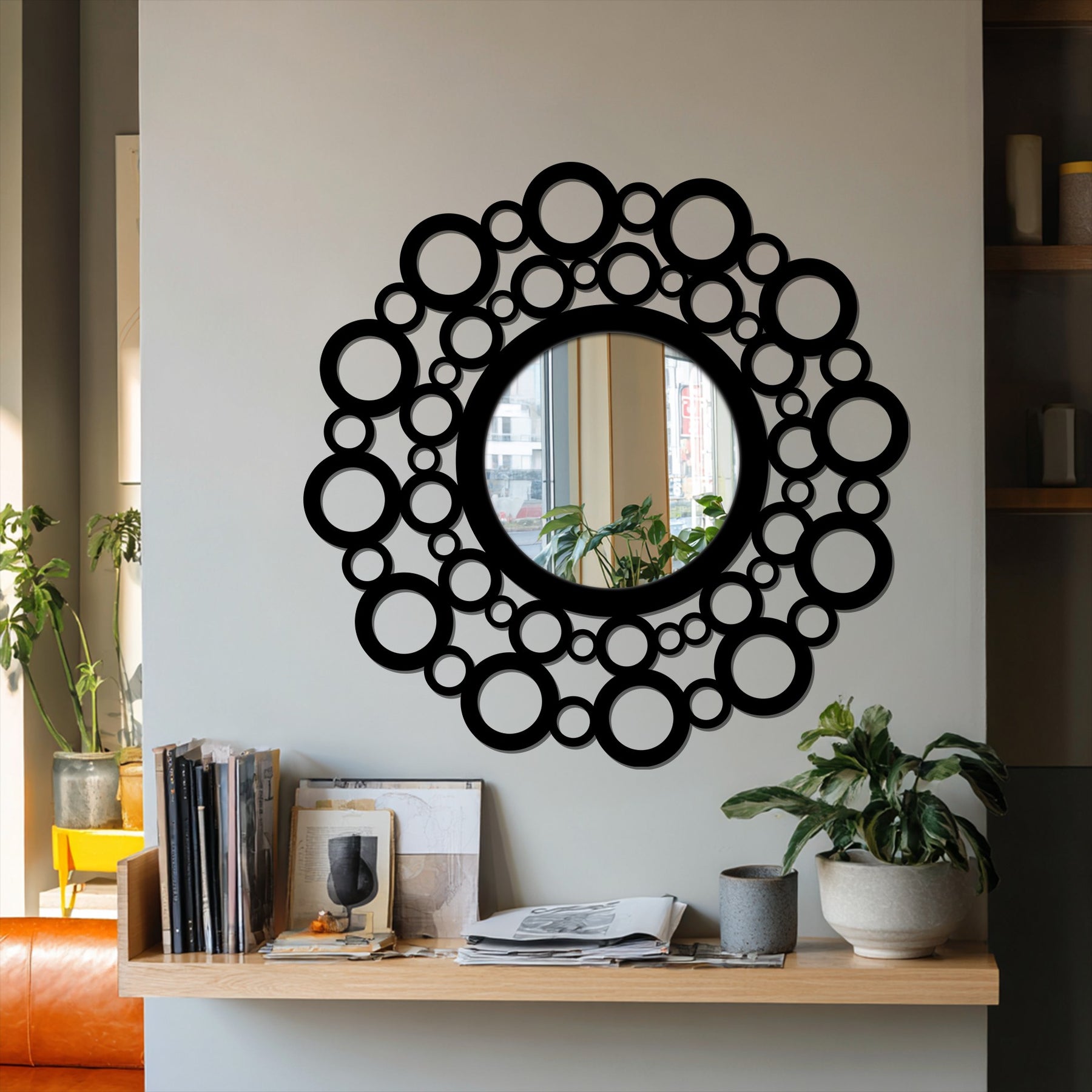 Add a playful yet sophisticated touch to your space with the Bubble Circle Frame Metal Wall Mirror – Modern Artistic Design. Featuring a composition of multiple circular forms in varying sizes, this mirror creates a dynamic and eye-catching pattern that surrounds the reflective center. The bold black metal frame enhances the visual contrast, turning simple shapes into a striking decorative piece.