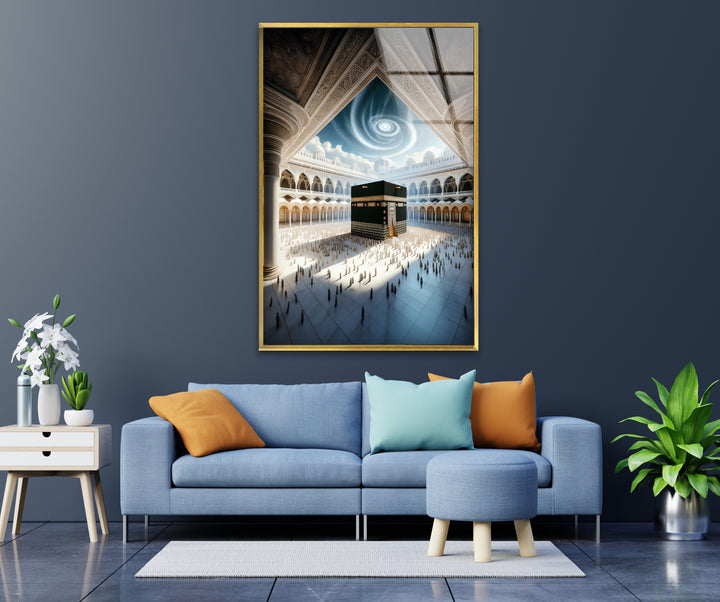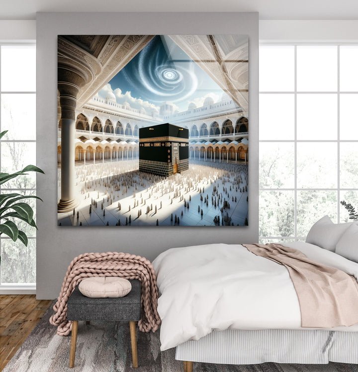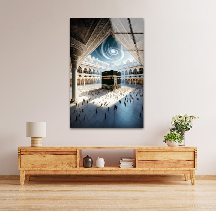 Islamic glass décor featuring Kaaba in Mecca under glowing clouds