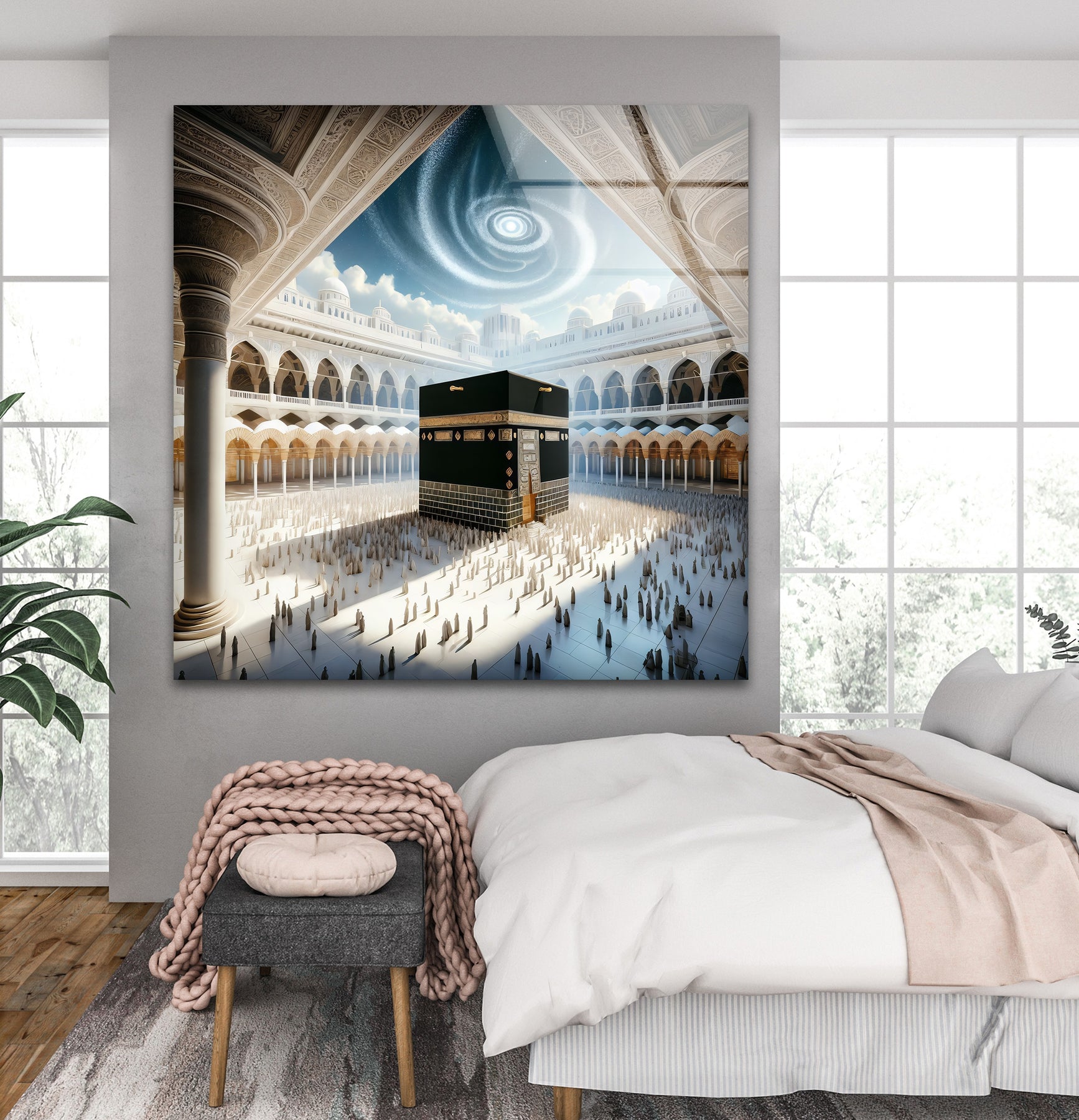 Experience the sacred beauty of Mecca with the Celestial Harmony – Kaaba Under Divine Light Glass Wall Art. This breathtaking artwork portrays the Kaaba illuminated beneath a swirling celestial sky, symbolizing unity, faith, and the eternal connection between heaven and earth. The divine light cascading from above captures the essence of peace and divine guidance, making it a perfect reminder of spiritual devotion.
