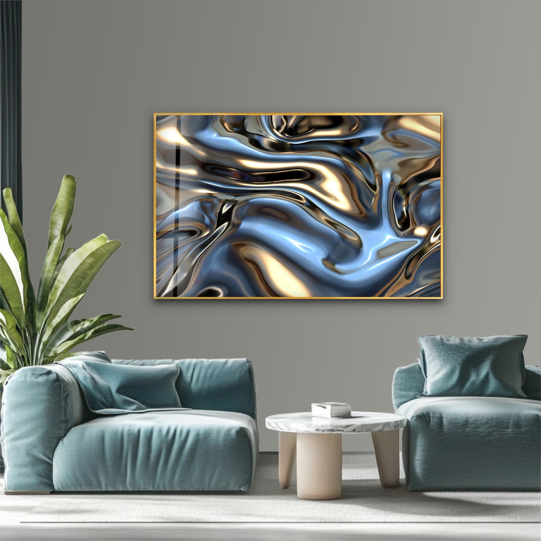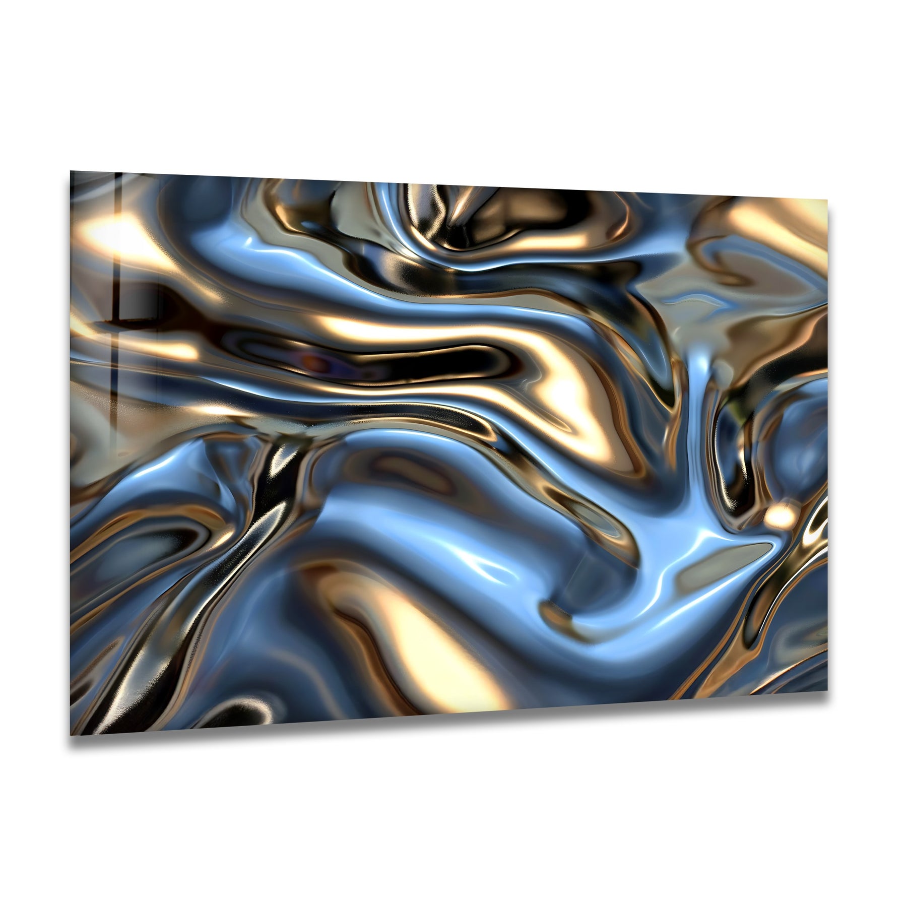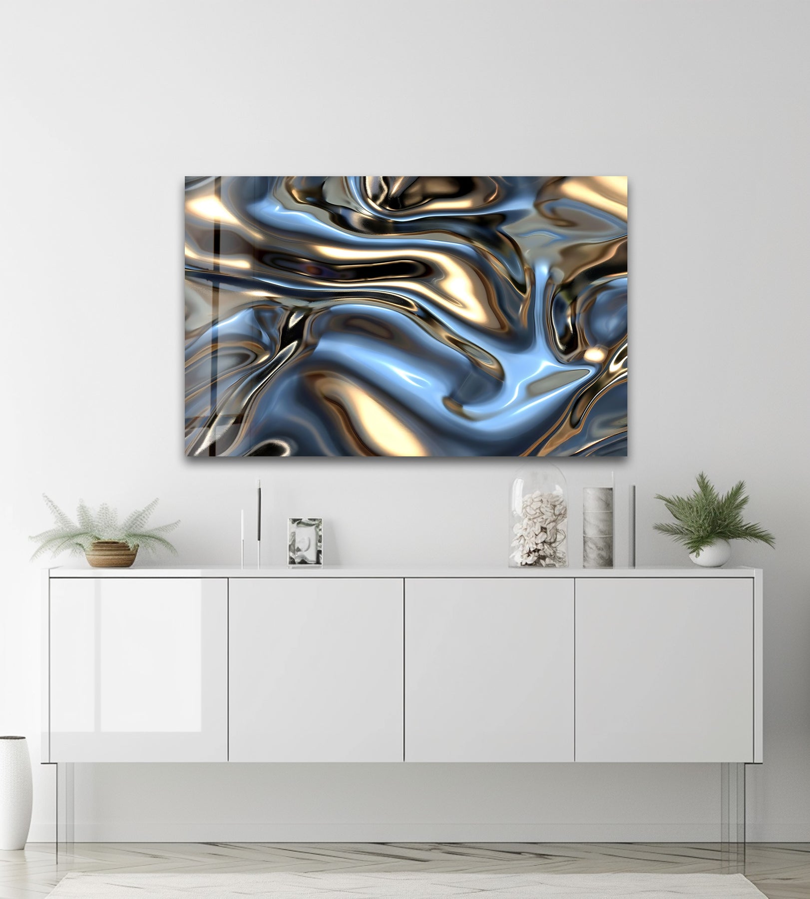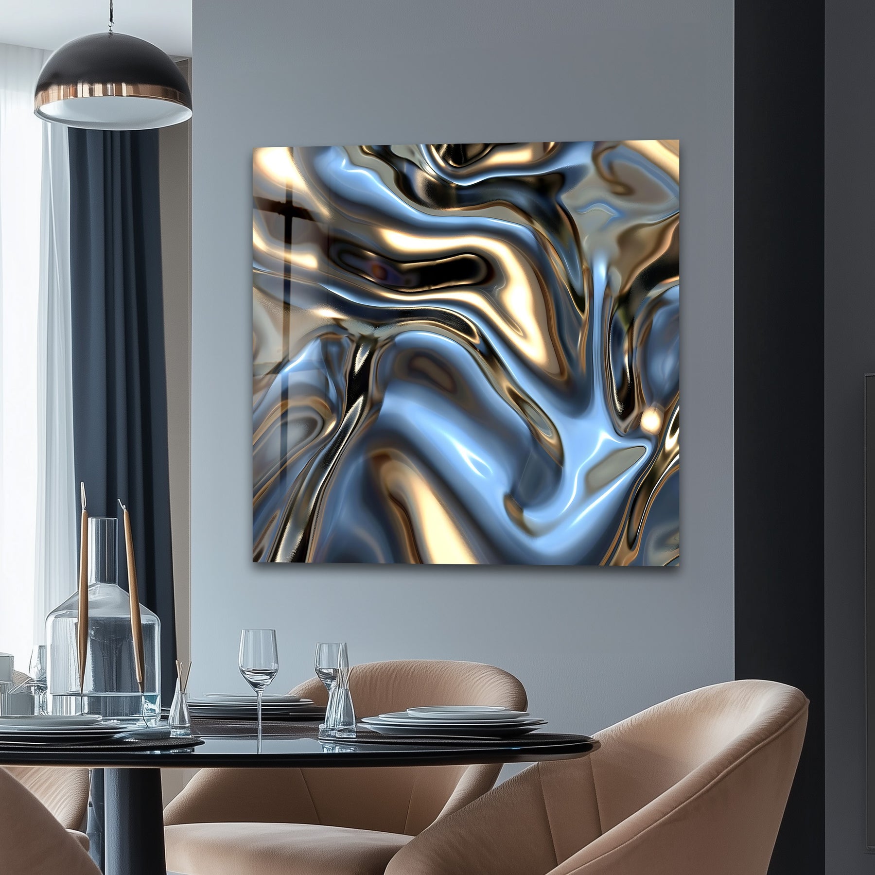 Enhance your interior with sleek metallic elegance through Celestial Metal Drift – Abstract Silver & Gold Fluid Glass Wall Art. This mesmerizing artwork blends flowing chrome-silver textures with warm gold reflections, creating the appearance of swirling liquid metal frozen in motion. The soft curvature and mirror-like glow make it perfect for luxurious, modern, and minimalist décor settings.