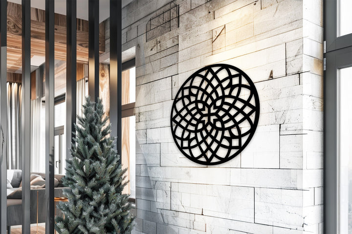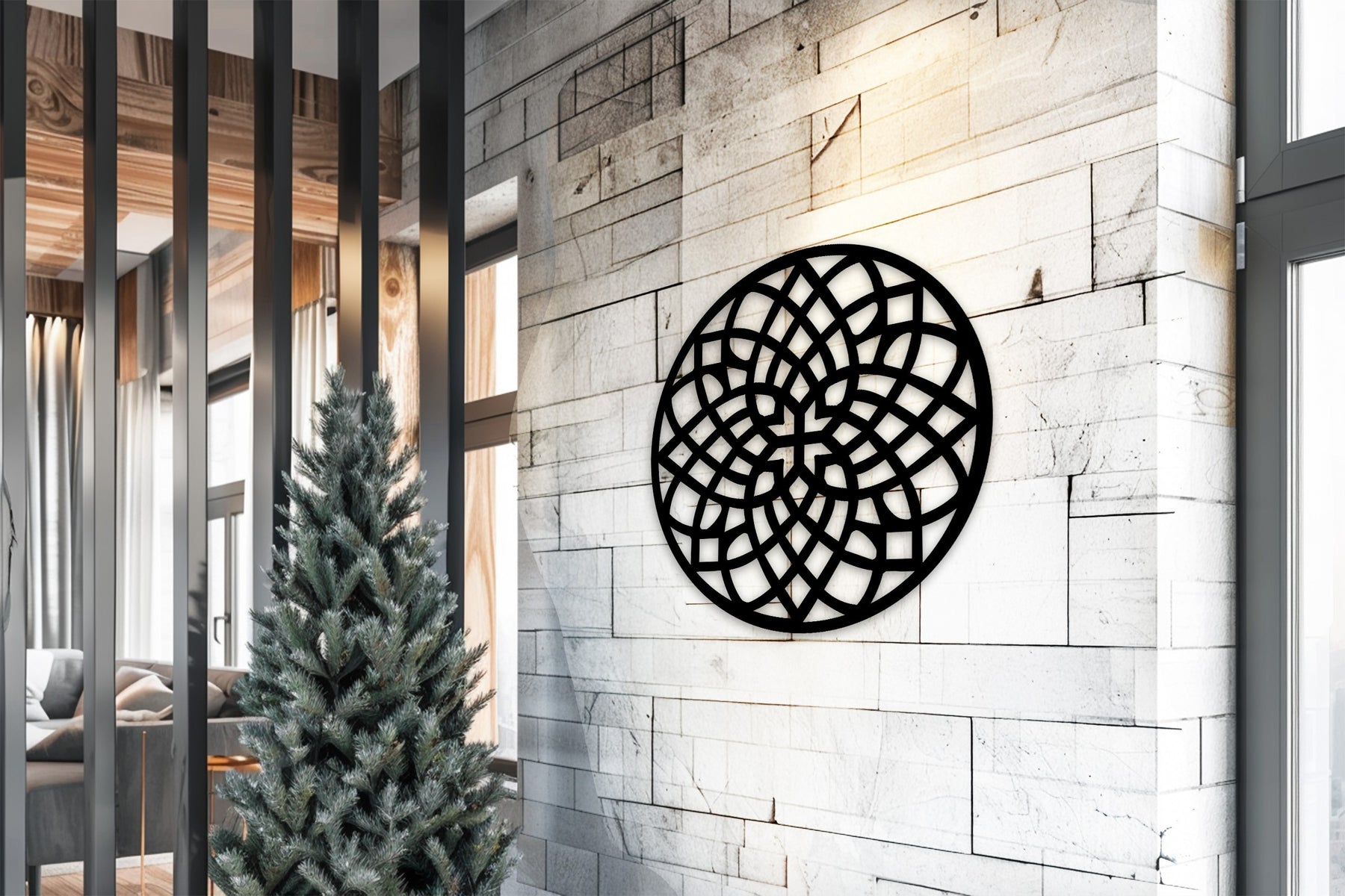 The detailed symmetry and circular structure create an atmosphere of peace and sophistication, making it an ideal statement for modern, bohemian, or cultural interiors. Its deep black metal silhouette contrasts beautifully with light walls, adding dimension and character to any room.