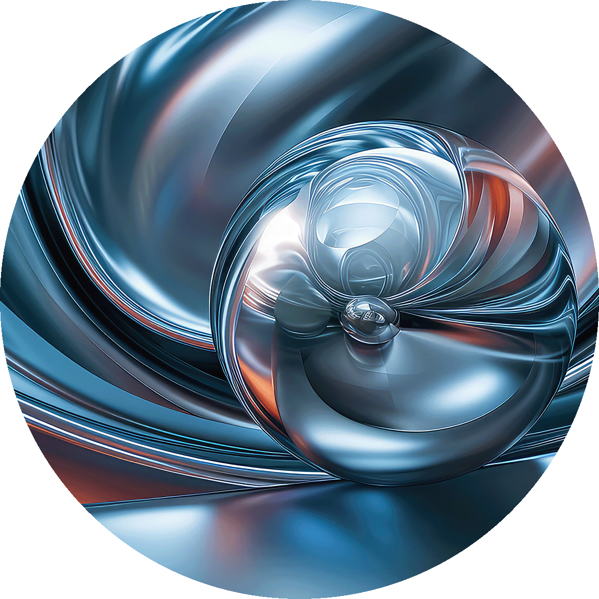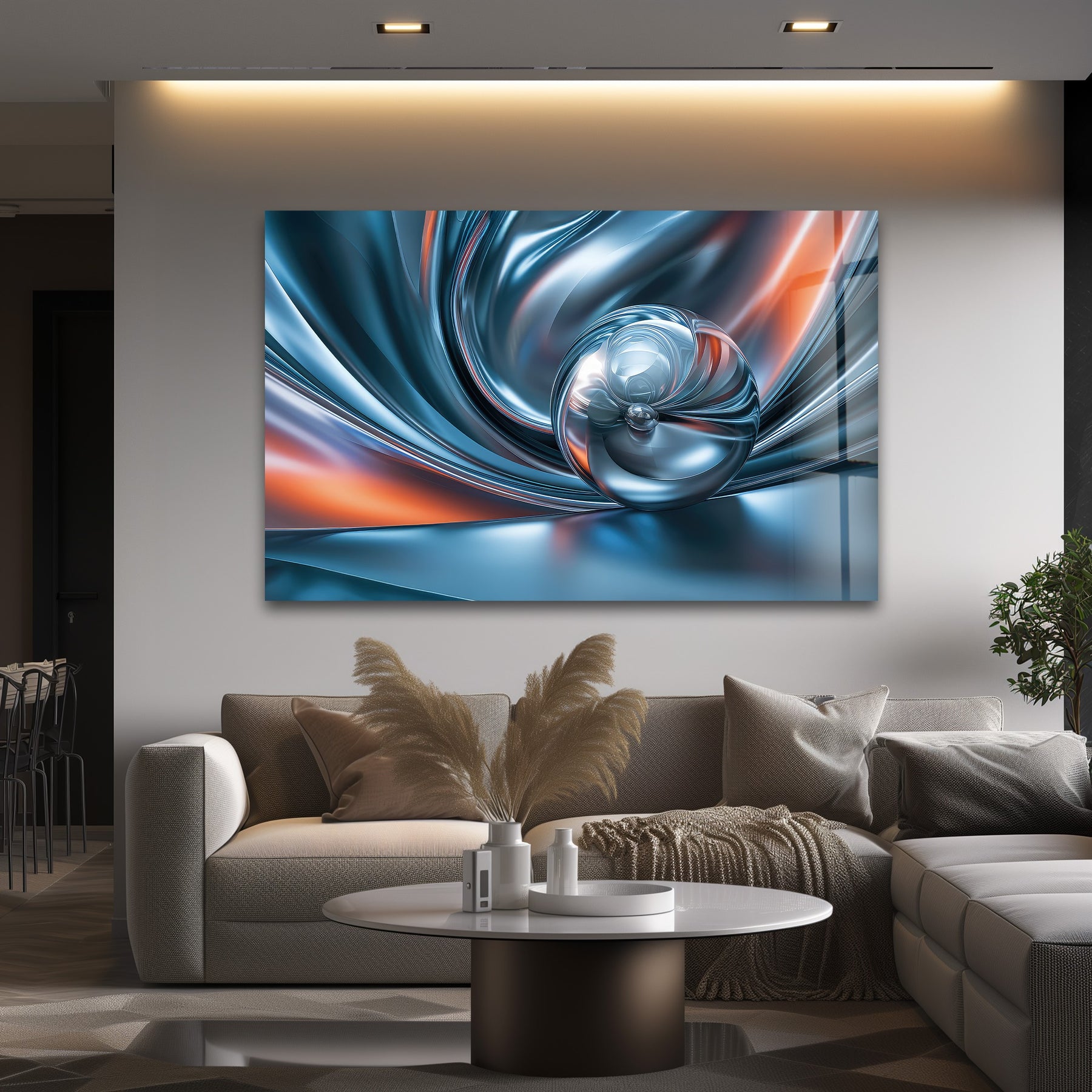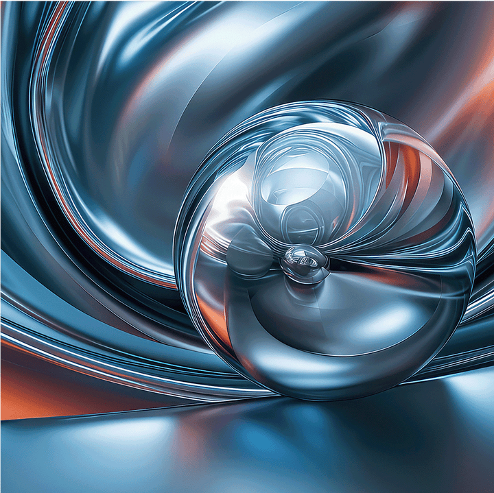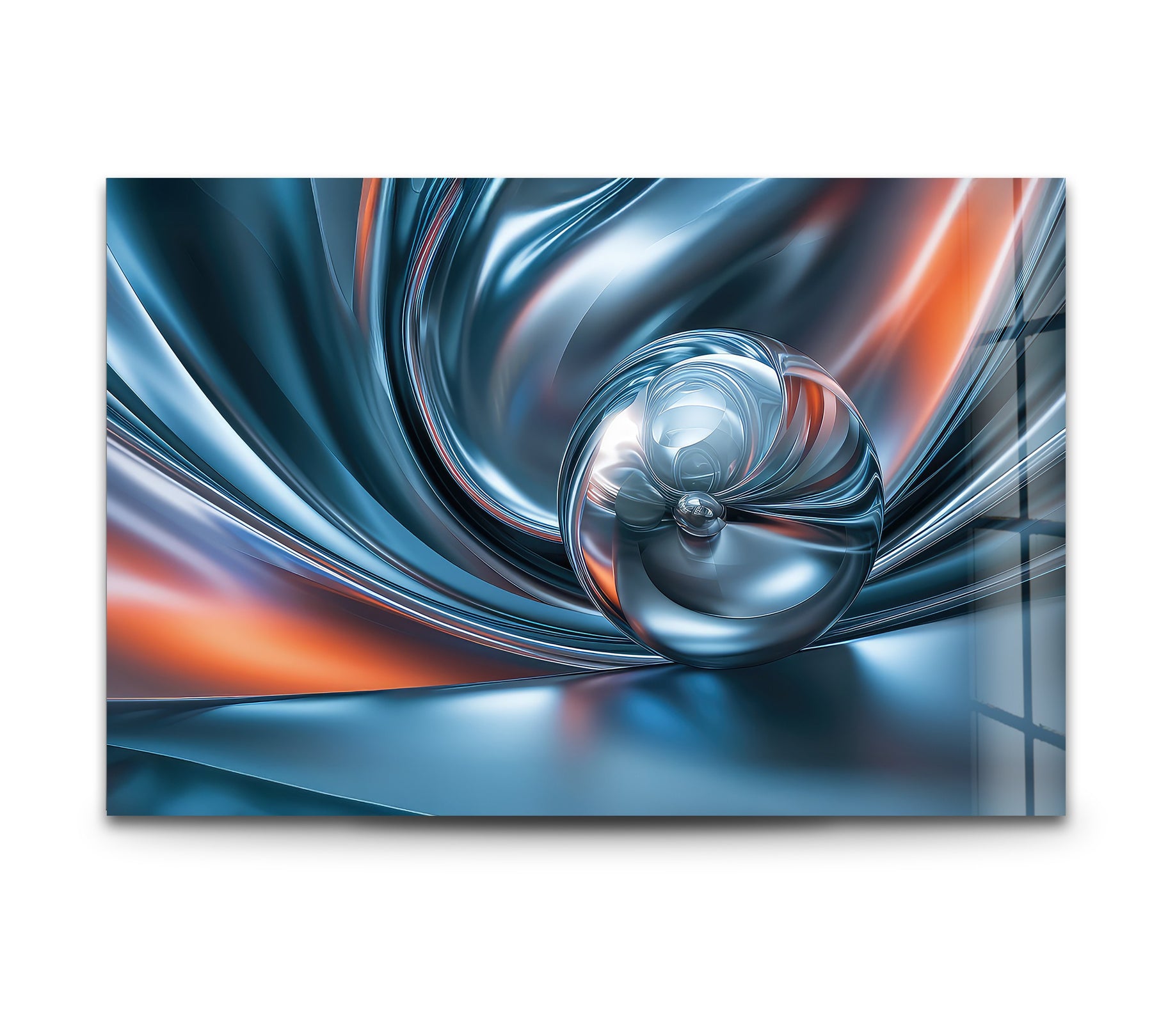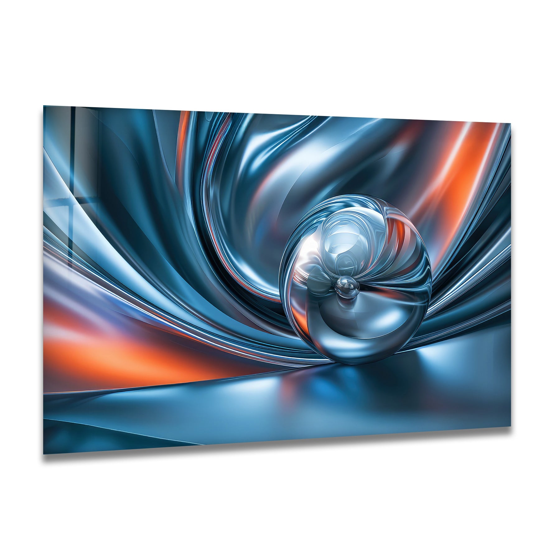 Introduce futuristic elegance and flowing metallic energy into your space with Chromatic Sphere Drift – Abstract Blue Silver Orb Glass Wall Art. This captivating artwork showcases a glossy chrome sphere surrounded by rippling silver-blue waves that radiate outward like liquid motion. Warm hints of ember orange add contrast and depth, creating a sleek, dynamic, and modern visual experience.