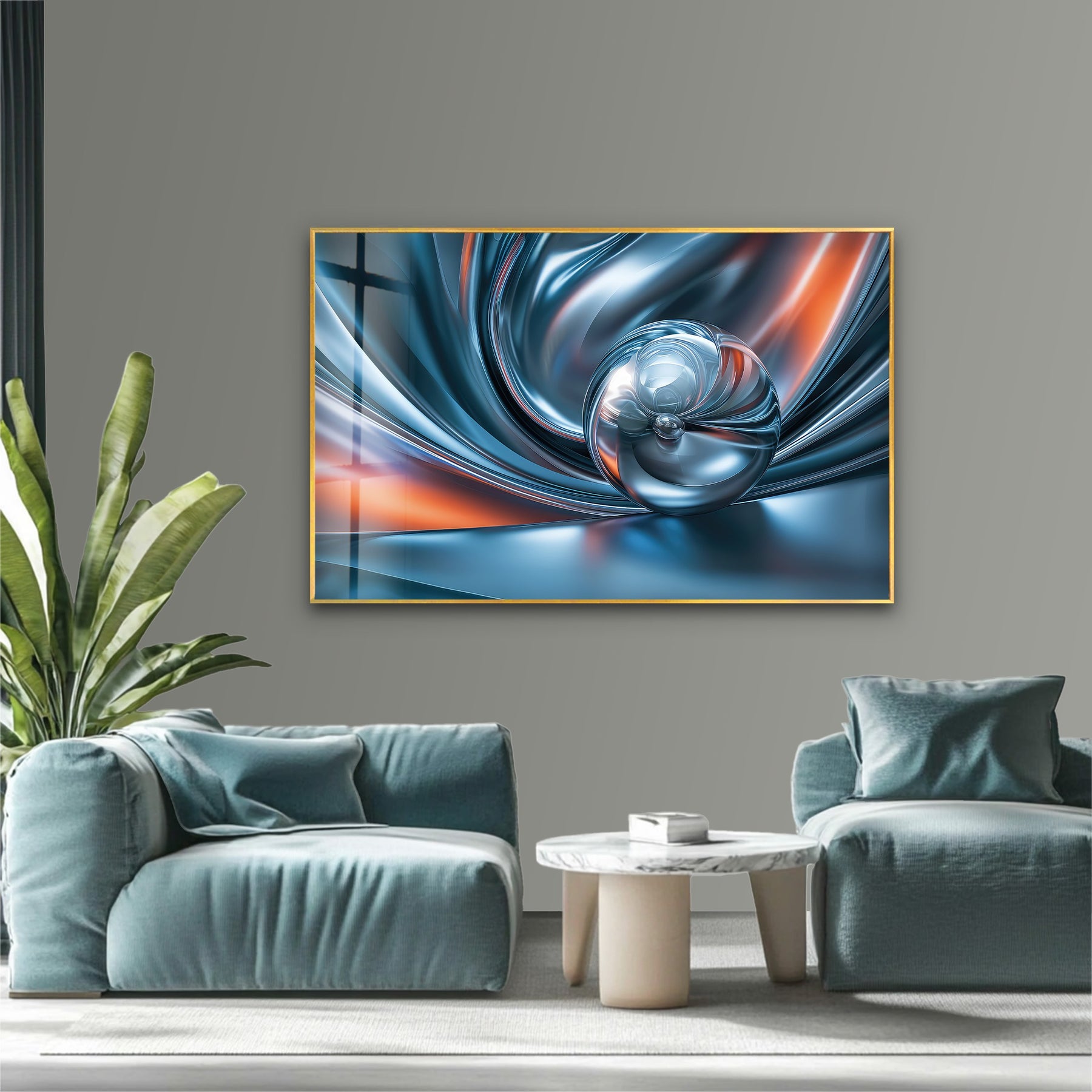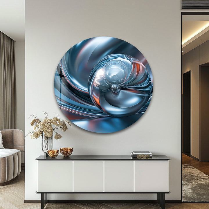 Chromatic Sphere Drift – Abstract Blue Silver Orb Glass Wall Art