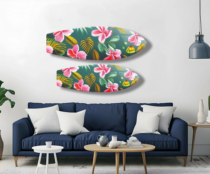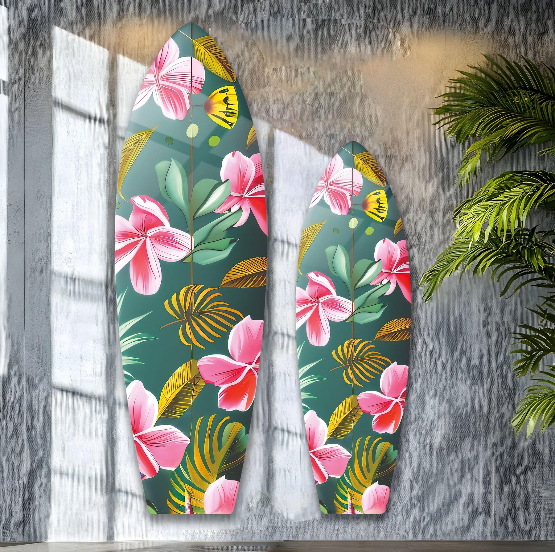 Brighten your space with the vibrant charm of the Colored Flowers Surfboard Glass Wall Art. Featuring stunning pink and red flowers paired with lush green and gold leaves, this tropical-inspired design radiates elegance and energy. The surfboard shape adds a unique coastal twist, making it perfect for modern, beach-themed, or tropical interiors.