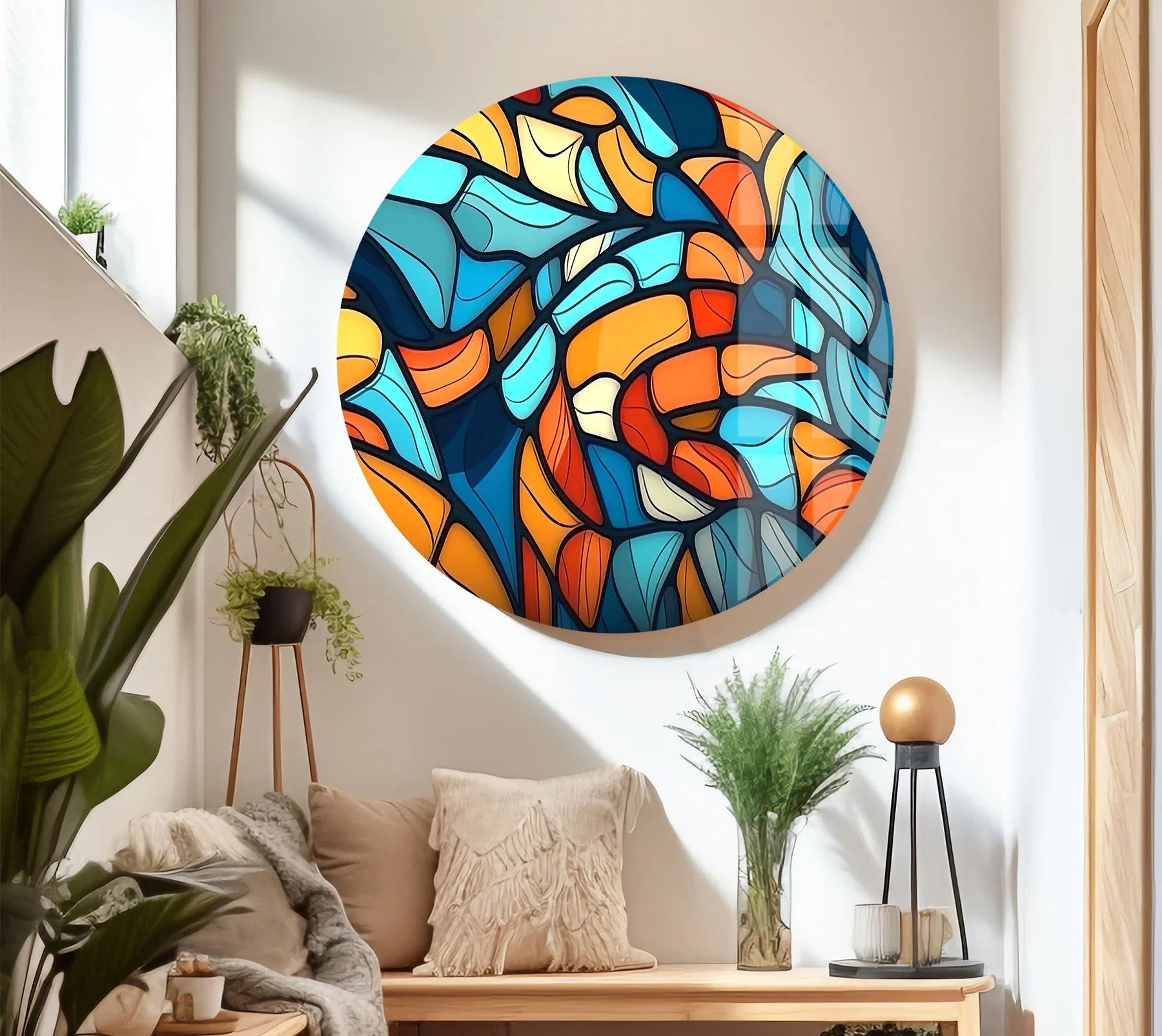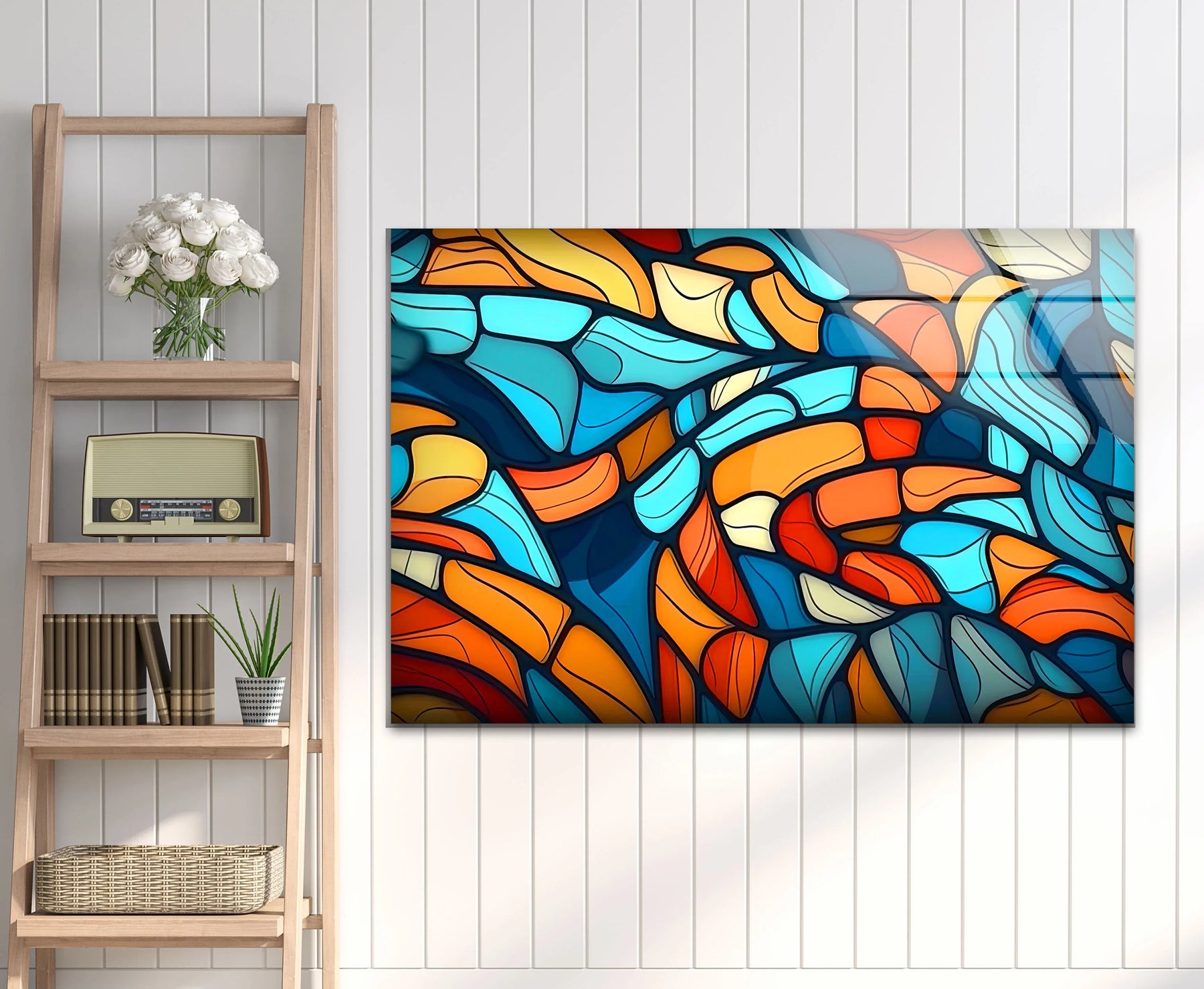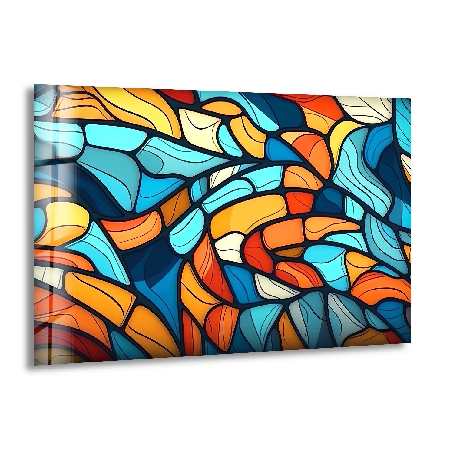 Add visual energy and modern sophistication to your walls with this Colorful Abstract Mosaic Wall Art, featuring a vibrant mosaic of swirling shapes in blue, orange, red, and gold tones. Inspired by stained glass and modernist compositions, this eye-catching artwork is ideal for creative studios, living rooms, or statement walls. The layered, flowing design evokes movement and imagination while the high-gloss tempered glass surface delivers exceptional shine, clarity, and durability. UV printed with premium inks, this piece makes a powerful and lasting impact.