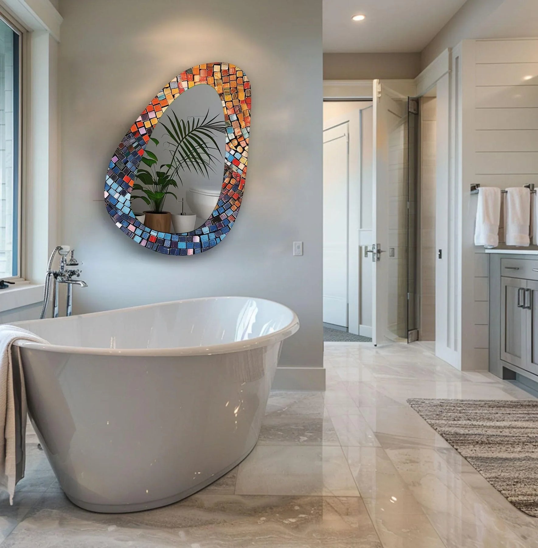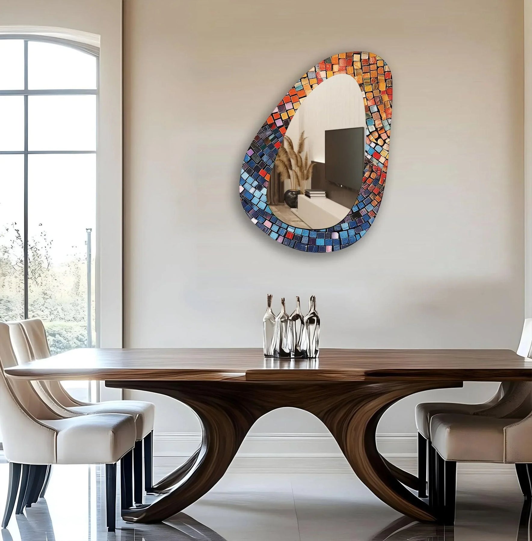 The Colorful Mosaic Wall Mirror adds vibrance and personality to your living space. Its asymmetrical design, adorned with a striking blend of blue, red, orange, and gold mosaic tiles, brings an artistic flair to any room. Perfect for living rooms, entryways, and bedrooms, this wall mirror serves as both functional décor and a statement piece.