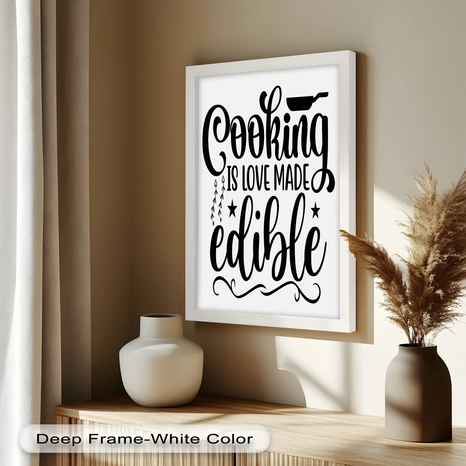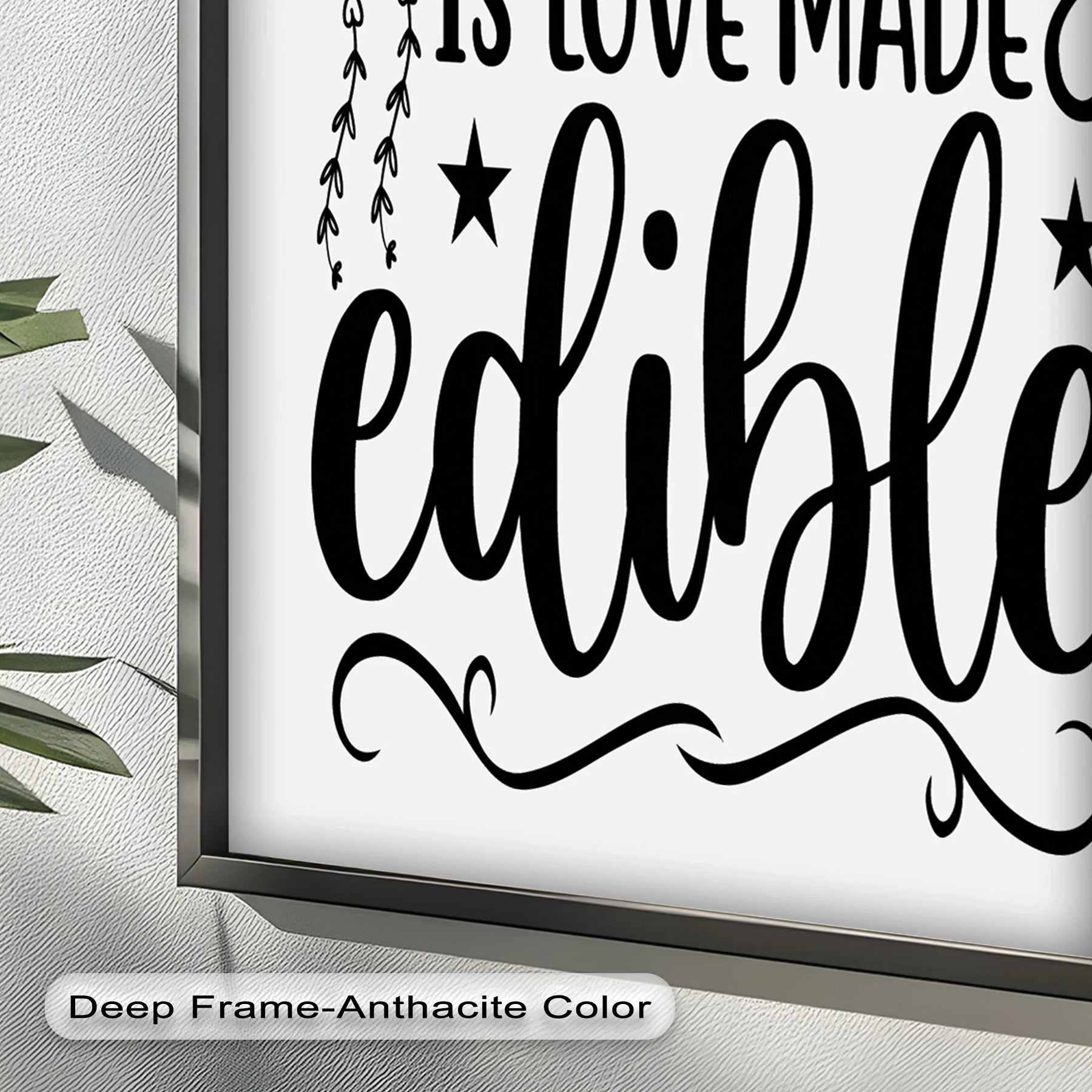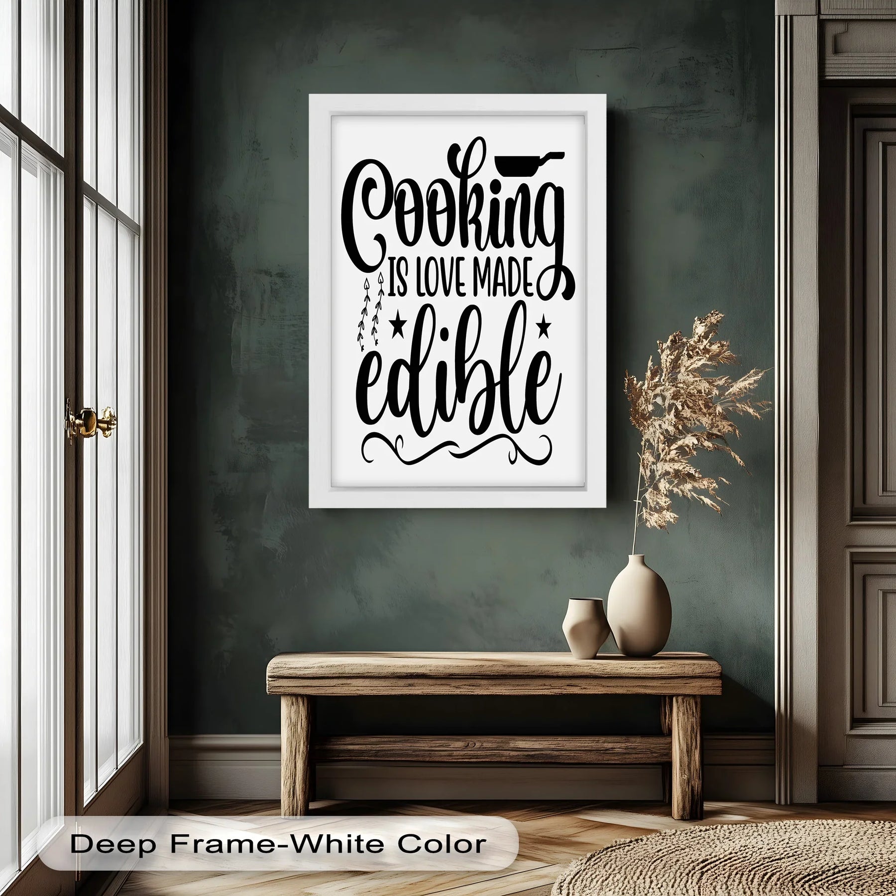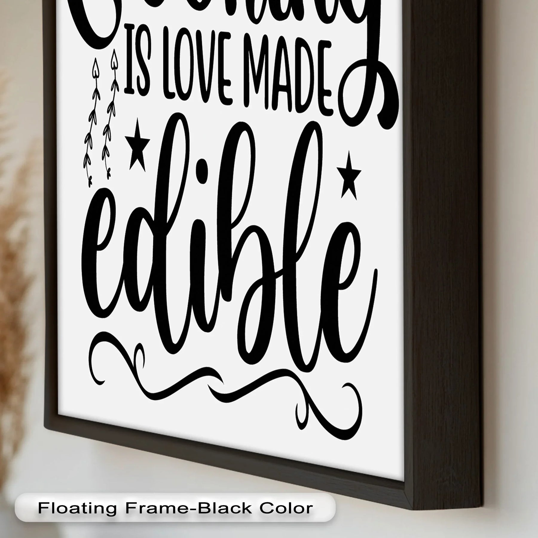 Add heartwarming charm to your kitchen with Cooking Is Love Made Edible, a black and white wall art piece that blends heartfelt sentiment with rustic kitchen style. Featuring playful script typography and illustrated kitchen accents, this artwork celebrates the joy of cooking and the love behind every homemade meal.