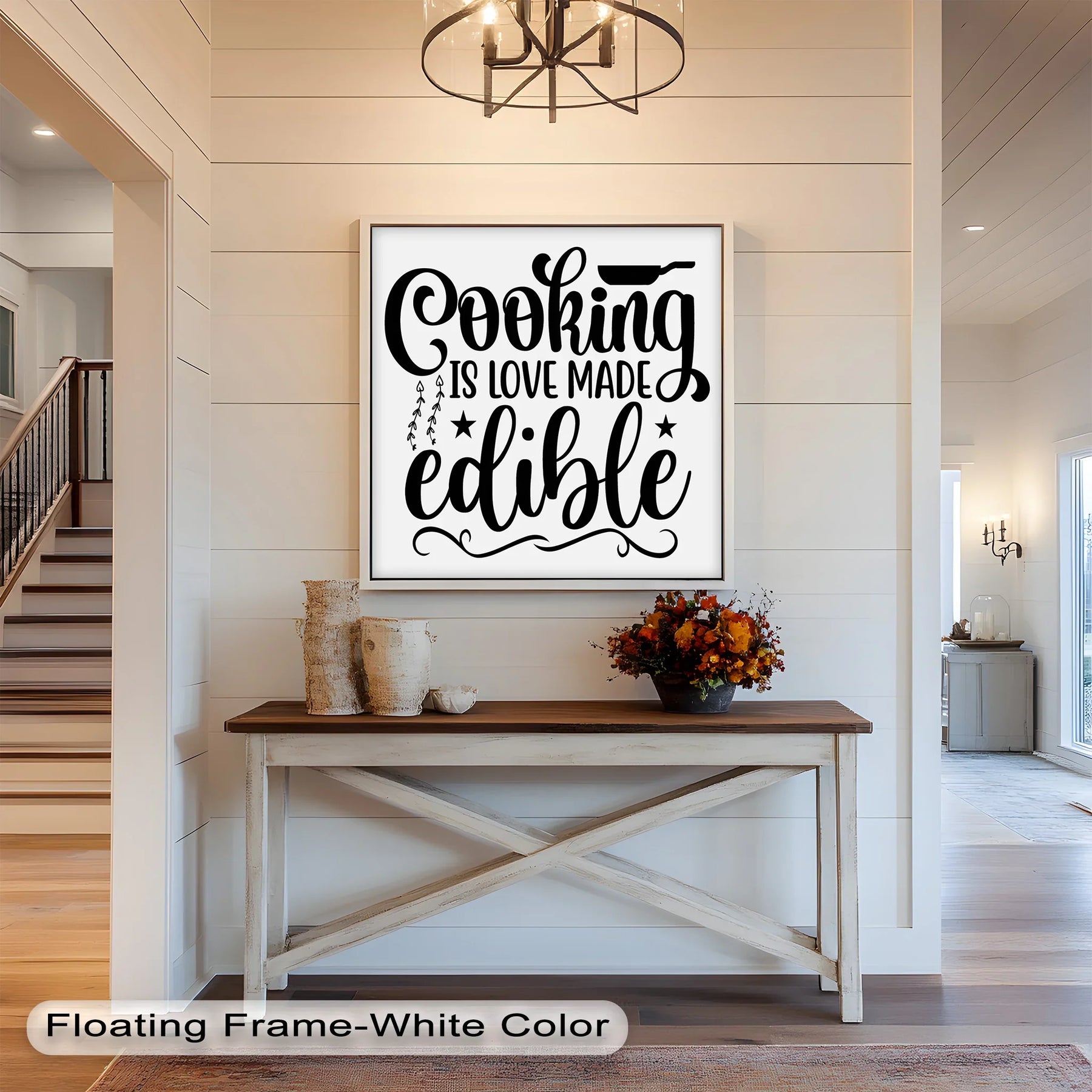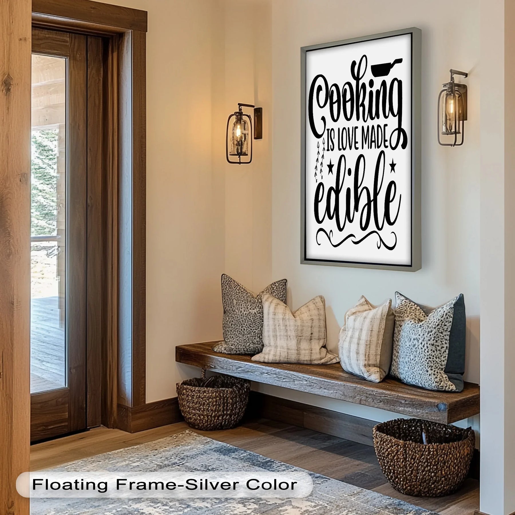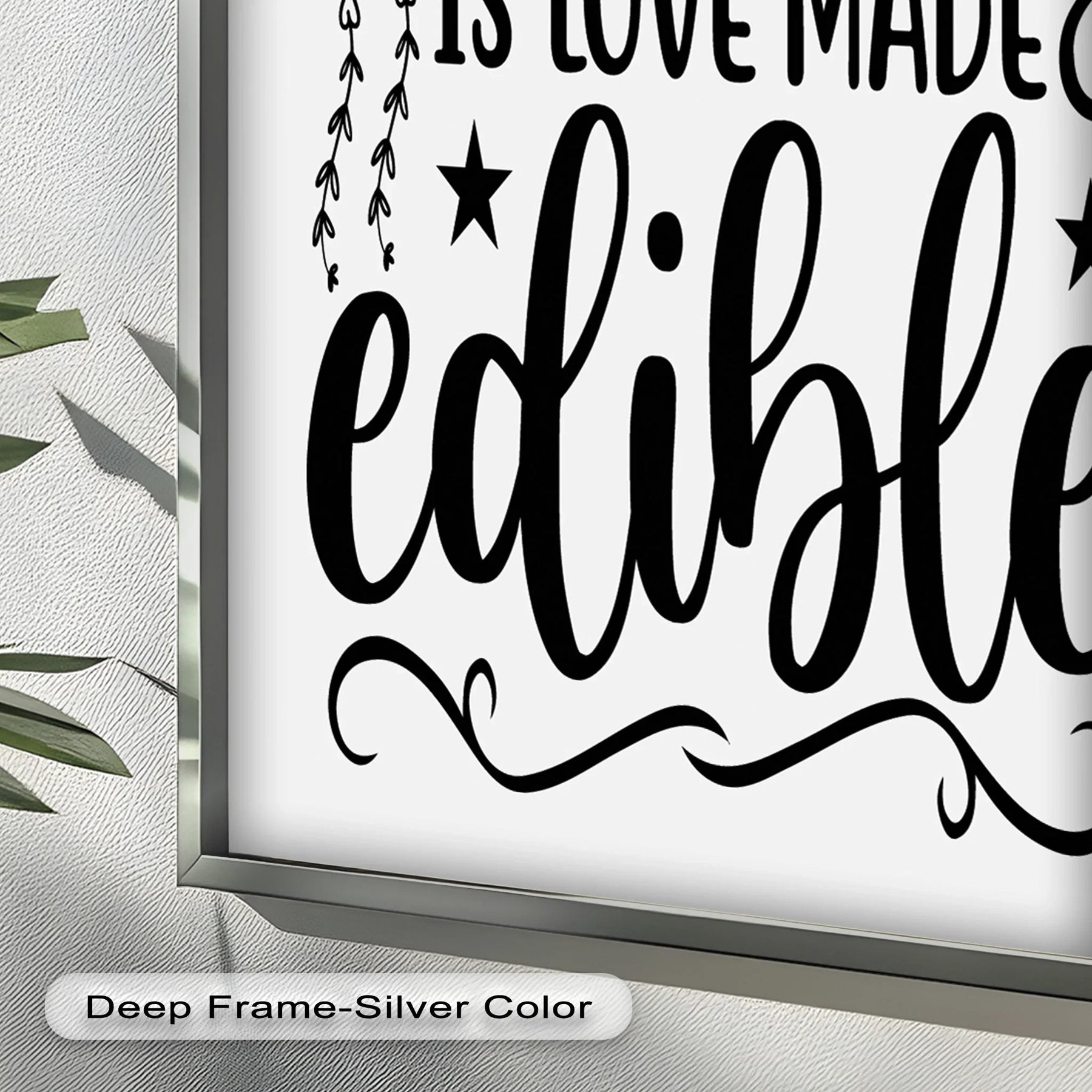 Add heartwarming charm to your kitchen with Cooking Is Love Made Edible, a black and white wall art piece that blends heartfelt sentiment with rustic kitchen style. Featuring playful script typography and illustrated kitchen accents, this artwork celebrates the joy of cooking and the love behind every homemade meal.