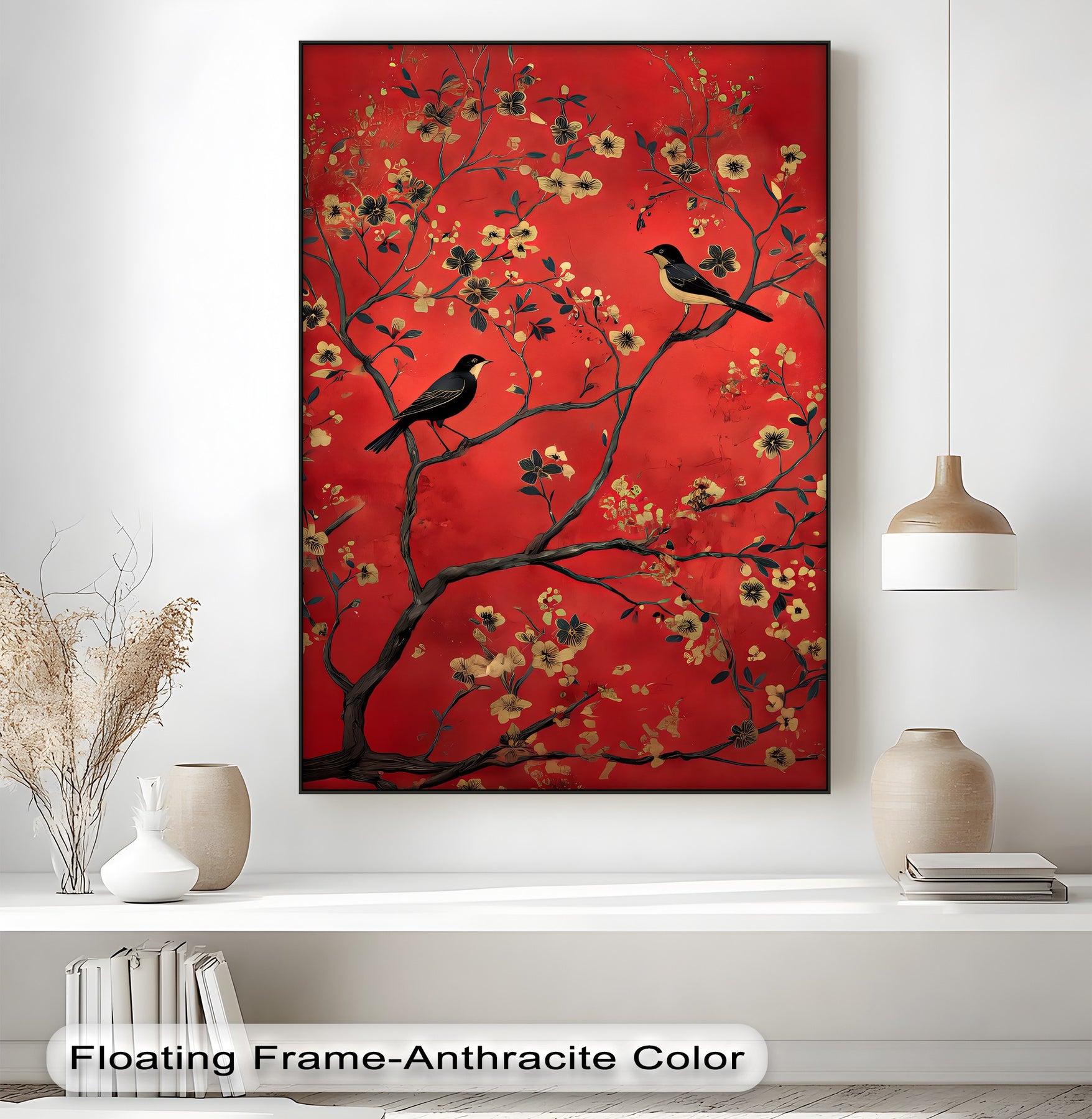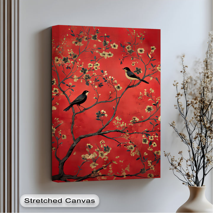 Crimson Melody – Golden Blossom Birds Canvas Wall Art | Framed Art