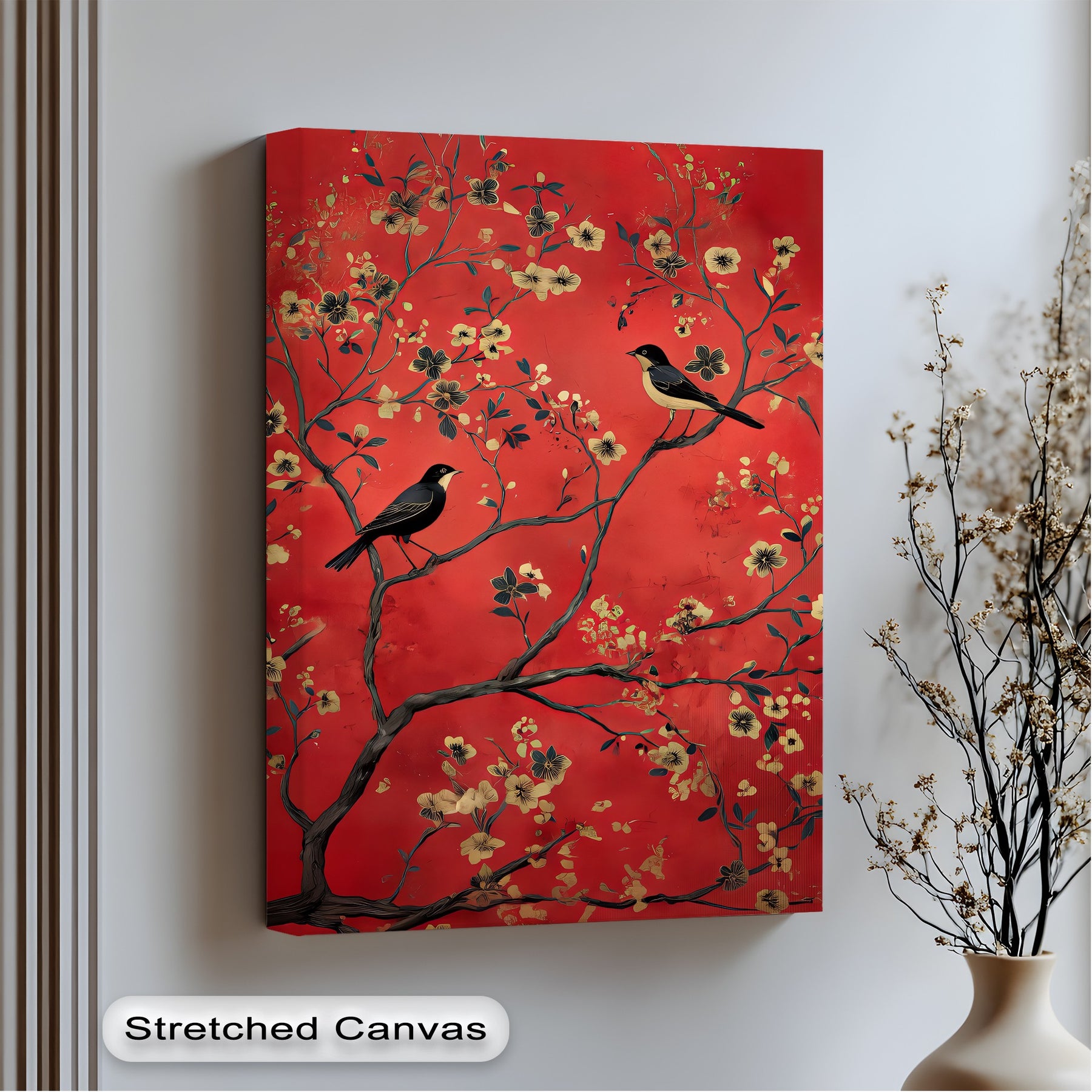 Infuse your home with passion and elegance through Crimson Melody, a breathtaking canvas wall art that captures the harmony of two songbirds resting among golden blossoms on a vivid crimson background. The rich red tones symbolize vitality and energy, while the delicate gilded flowers add a luxurious touch of refinement.