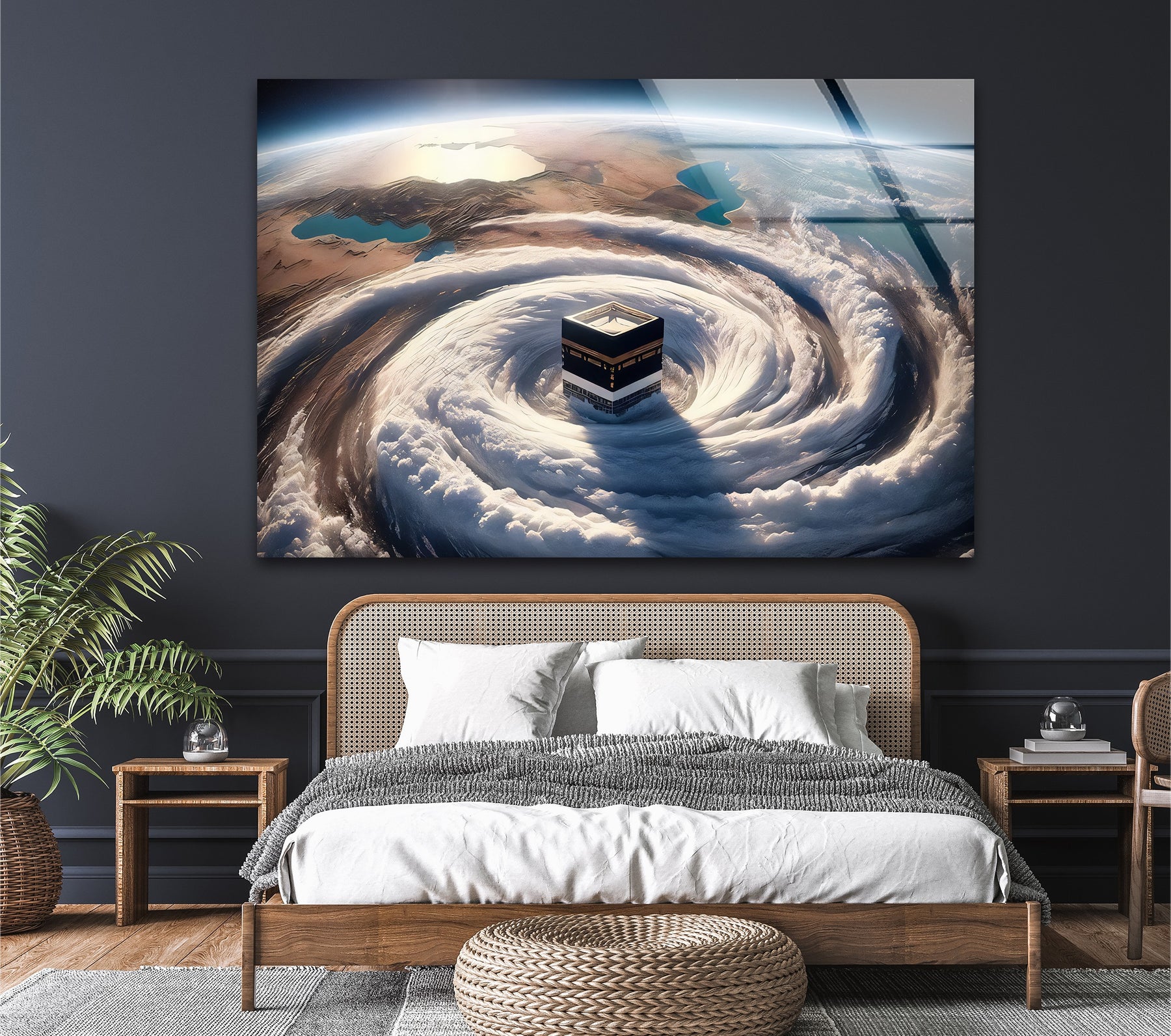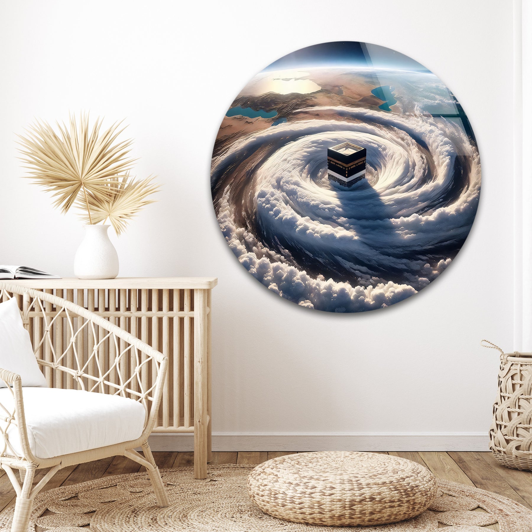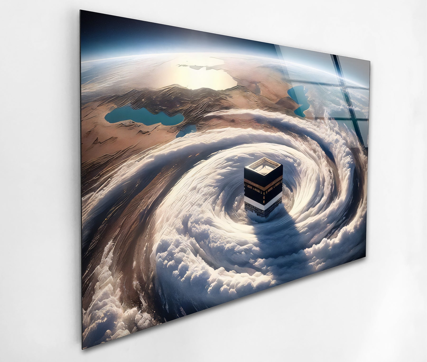 Elevate your spiritual space with the Divine Orbit – Kaaba Surrounded by Celestial Clouds Glass Wall Art. This mesmerizing artwork envisions the Holy Kaaba encircled by swirling clouds from a heavenly perspective, symbolizing the unity of Earth and the divine. The breathtaking composition combines the grandeur of the sacred site with the majesty of the skies, representing faith’s boundless connection to creation.