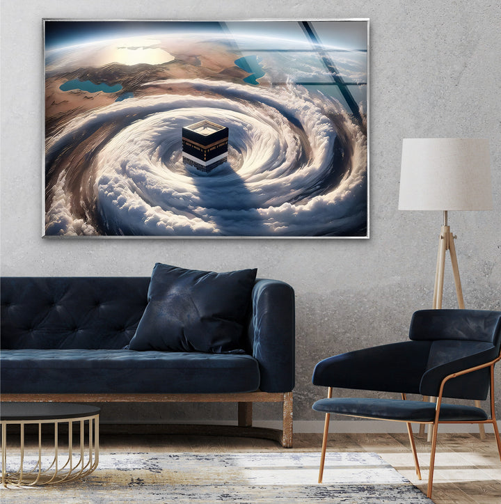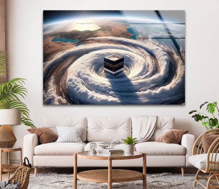 Divine Orbit – Kaaba Surrounded by Celestial Clouds Glass Wall Art