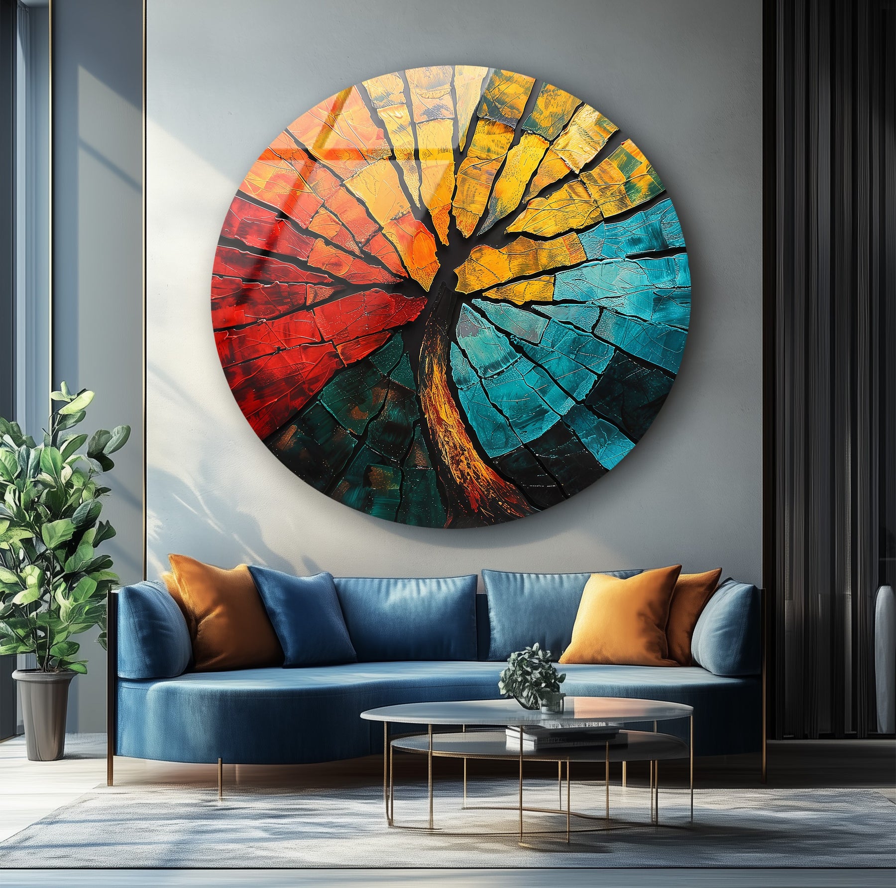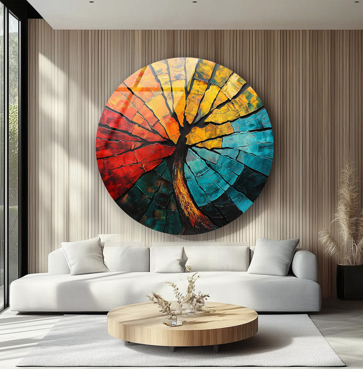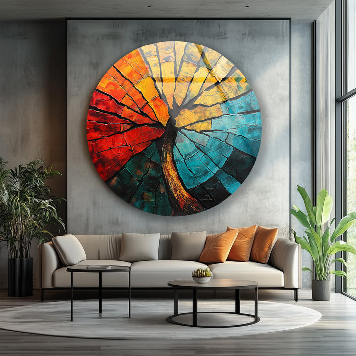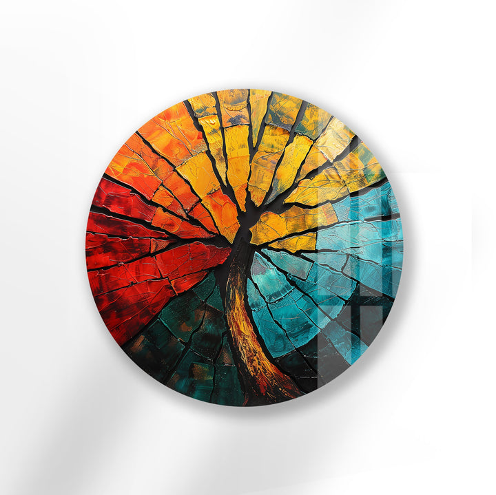 Ignite your walls with passion and balance through the Elemental Fusion – Fiery Abstract Tree Round Glass Wall Art. This mesmerizing piece combines the energy of fire and the calm of water, captured through a bold interplay of molten reds, golden yellows, and cool turquoise tones. The fractured glass design mimics cracked earth and flowing lava — a poetic symbol of strength, renewal, and transformation.