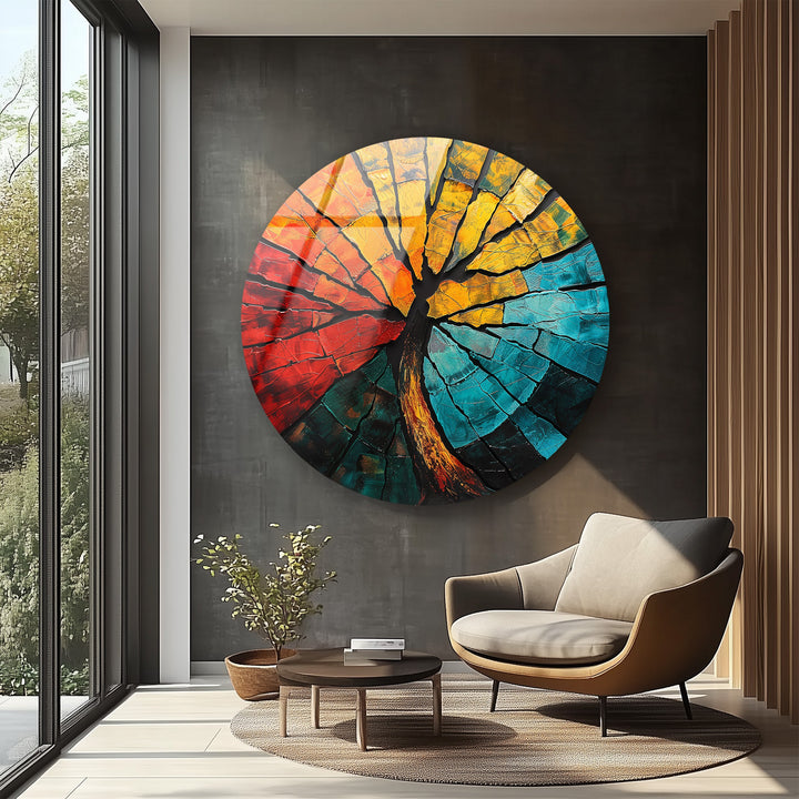 Elemental Fusion – Fiery Abstract Tree Round Glass Wall Art