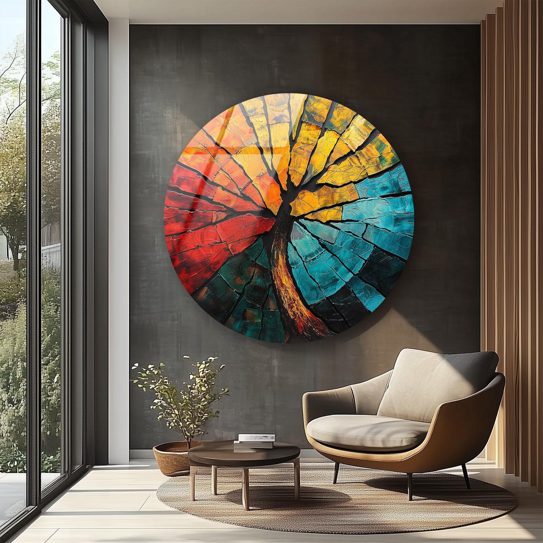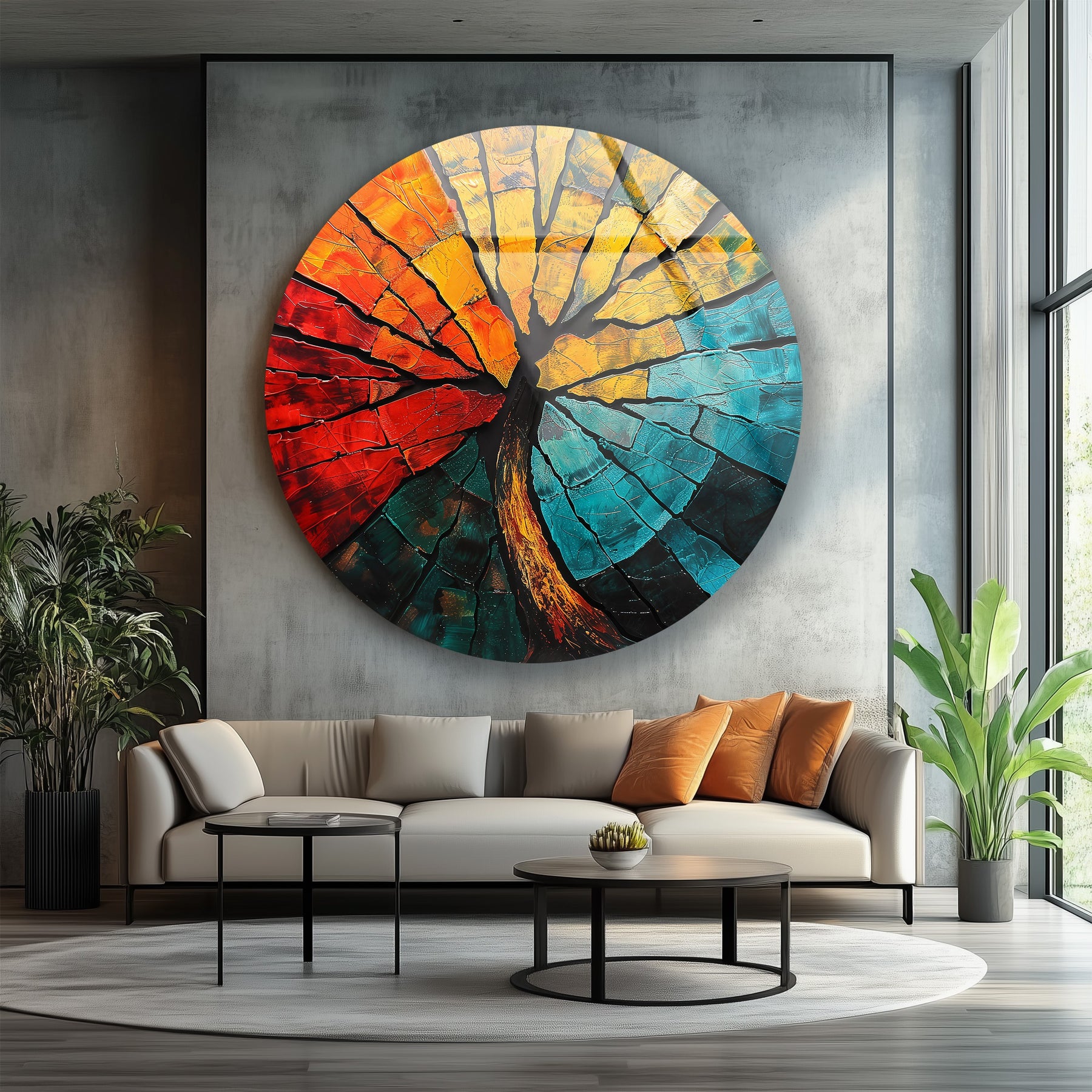 Crafted for modern homes, art lovers, and statement interiors, this round glass wall art embodies both raw nature and refined design. The reflective surface enhances each hue, creating a dynamic and ever-changing appearance with the movement of light. Whether displayed in a living room, hallway, or creative space, it radiates warmth, power, and harmony.