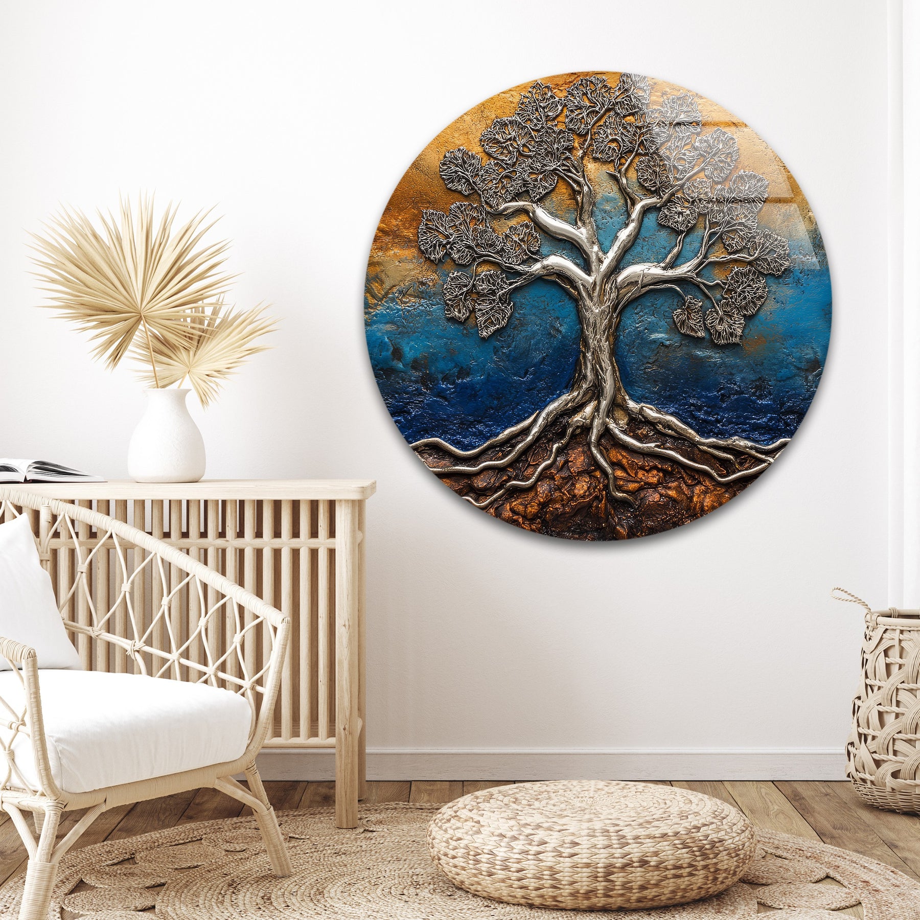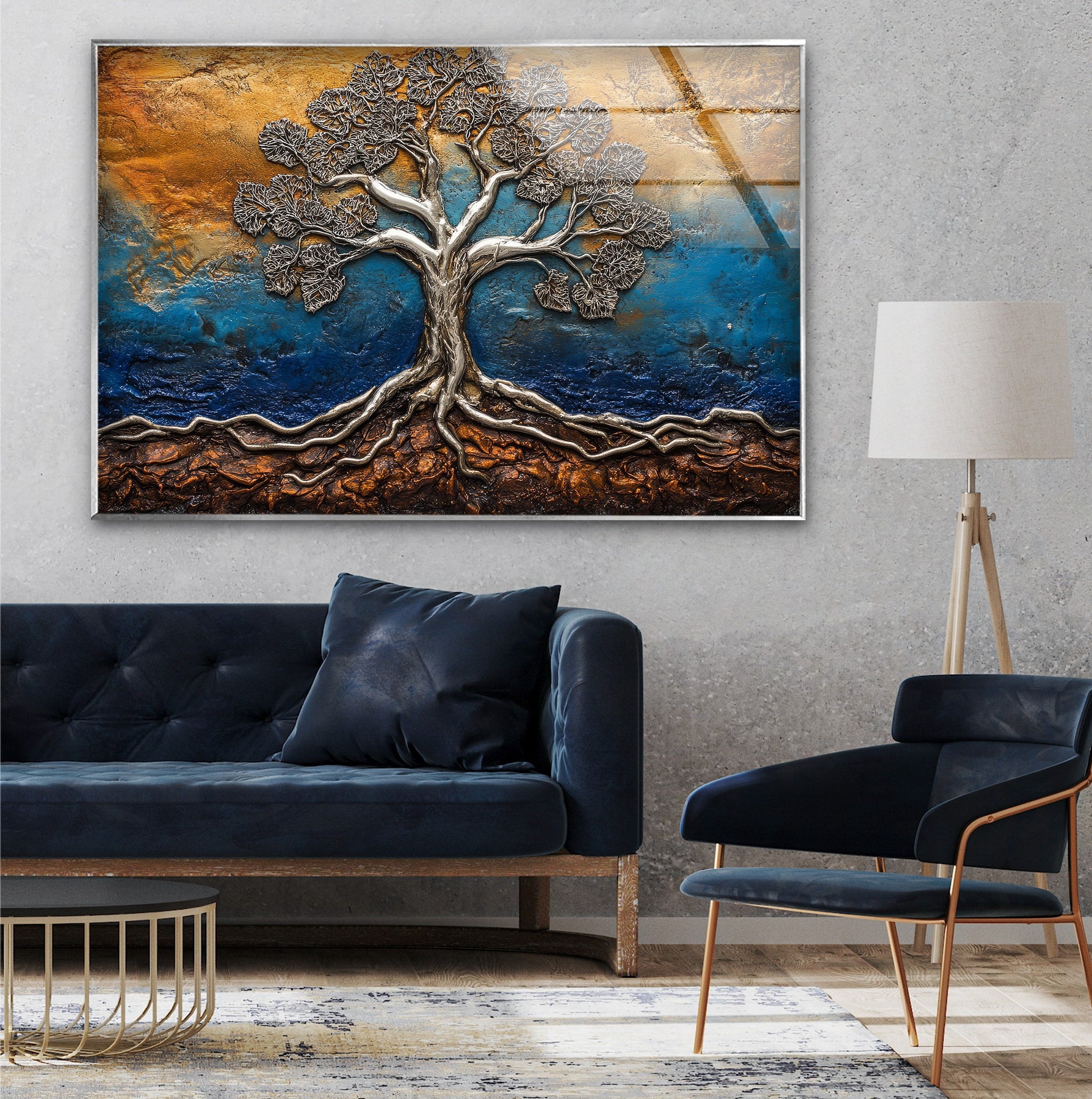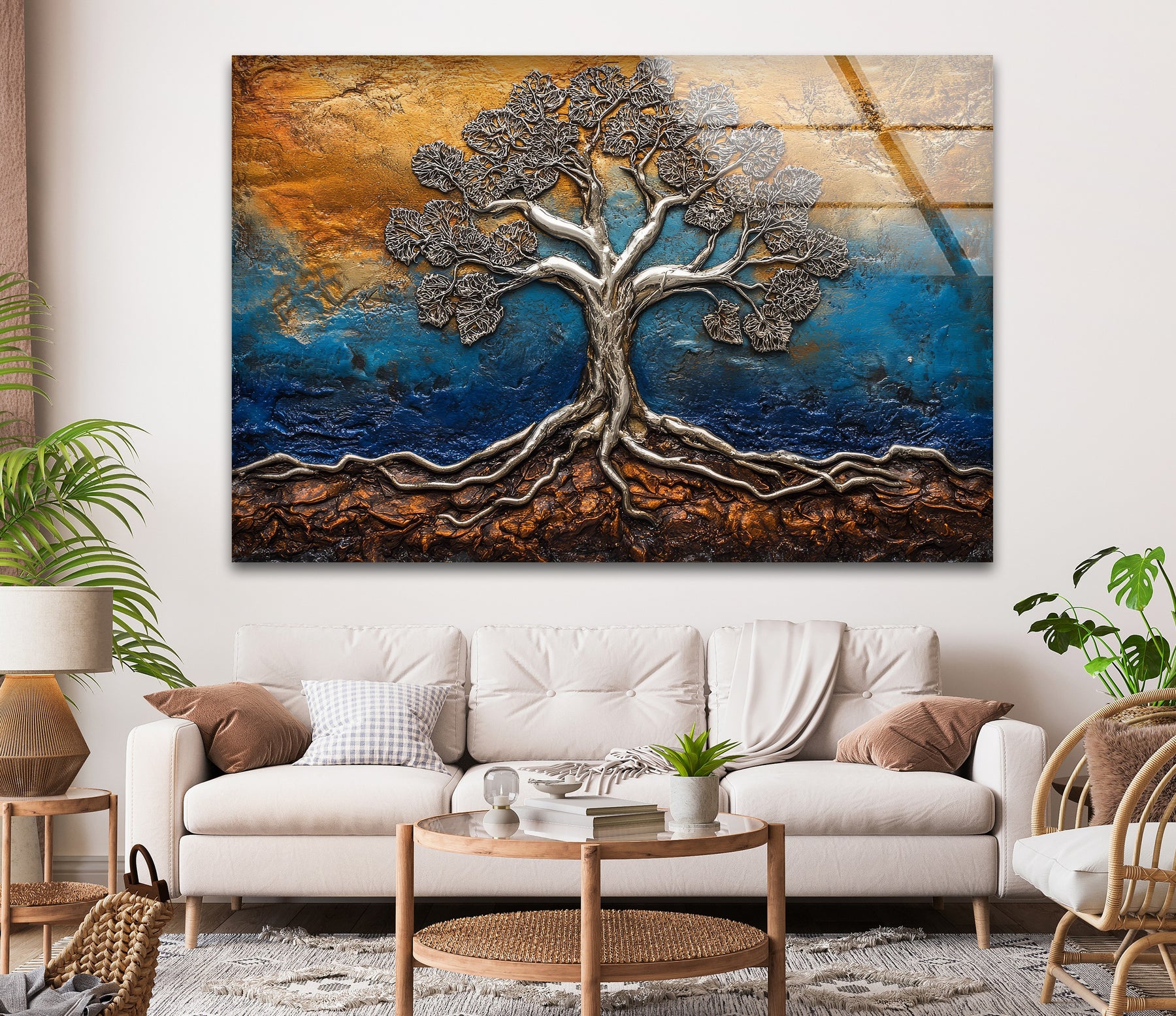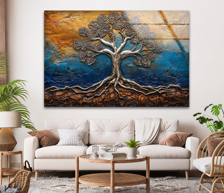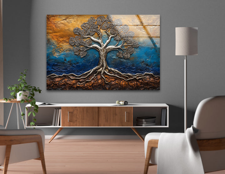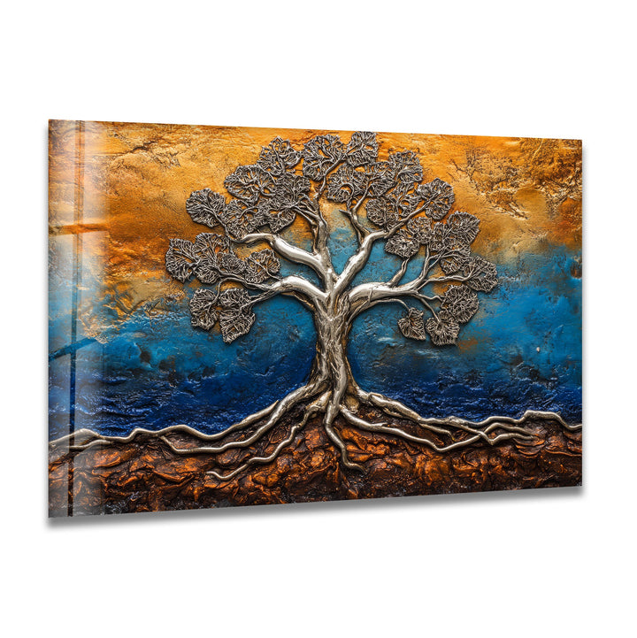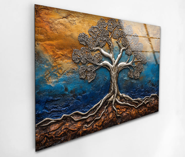 Bring depth, symbolism, and artistic richness into your space with Eternal Roots Bronze – Sculpted Metallic Tree Glass Wall Art. This stunning artwork features a beautifully textured tree crafted in silver and bronze tones, with intricate branches and deeply sculpted roots spreading across a layered background of earth-brown, ocean-blue, and burnished gold. The design radiates strength, growth, and timeless elegance—perfect for décor styles inspired by nature, heritage, and artistic craftsmanship.