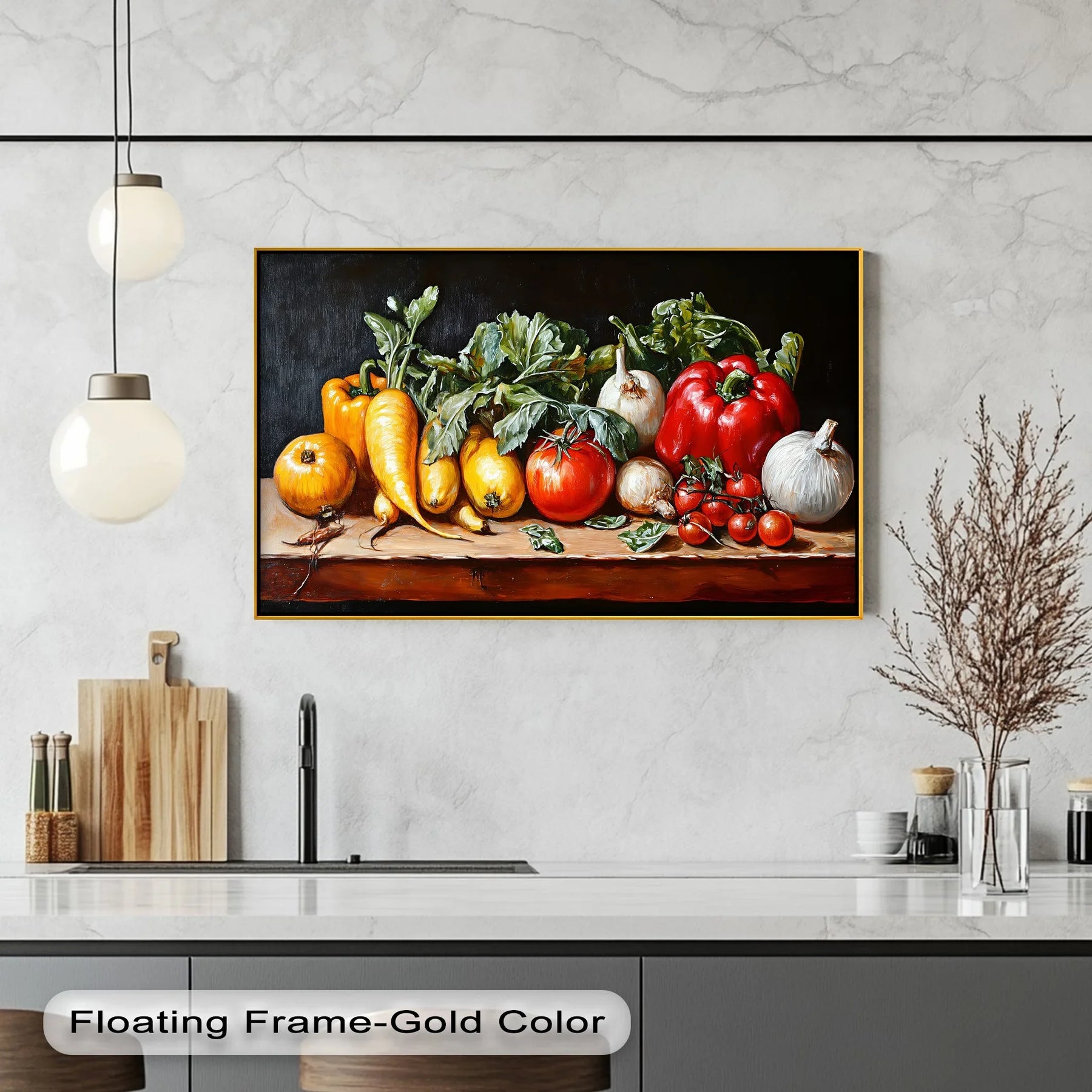 Bring the wholesome beauty of fresh produce into your home with this vibrant still life canvas print, featuring a rustic wooden table piled high with colorful vegetables like tomatoes, garlic, bell peppers, and yellow carrots. The rich oil painting style and deep contrast create a farm-to-table warmth perfect for farmhouse kitchens, cozy dining rooms, or country-style cafés.