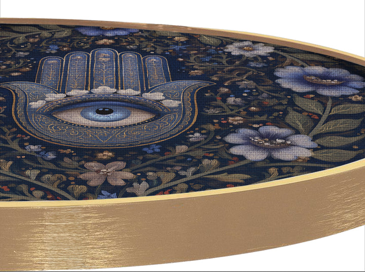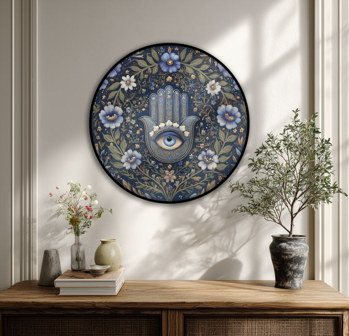 Warm light enhances the navy hues in this round Floral Hamsa Eye canvas art prints, creating an elegant and inviting spiritual botanical wall art piece.