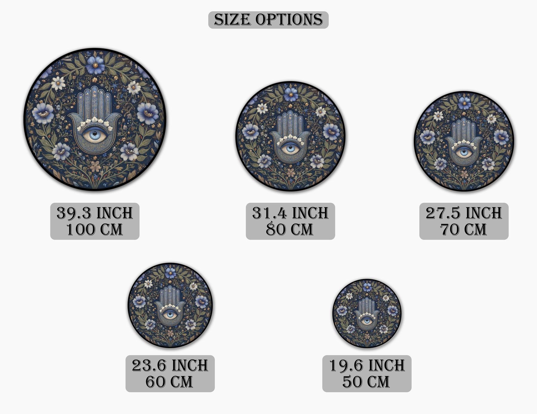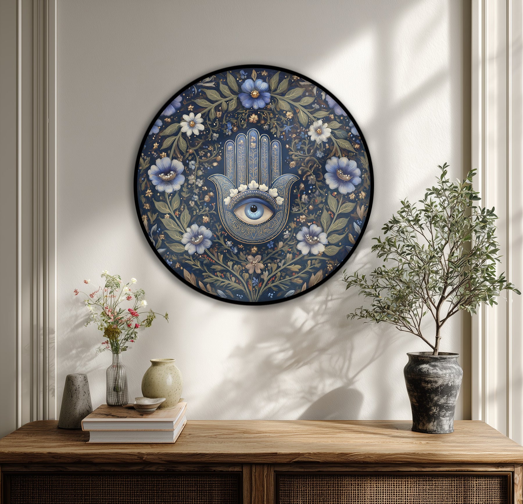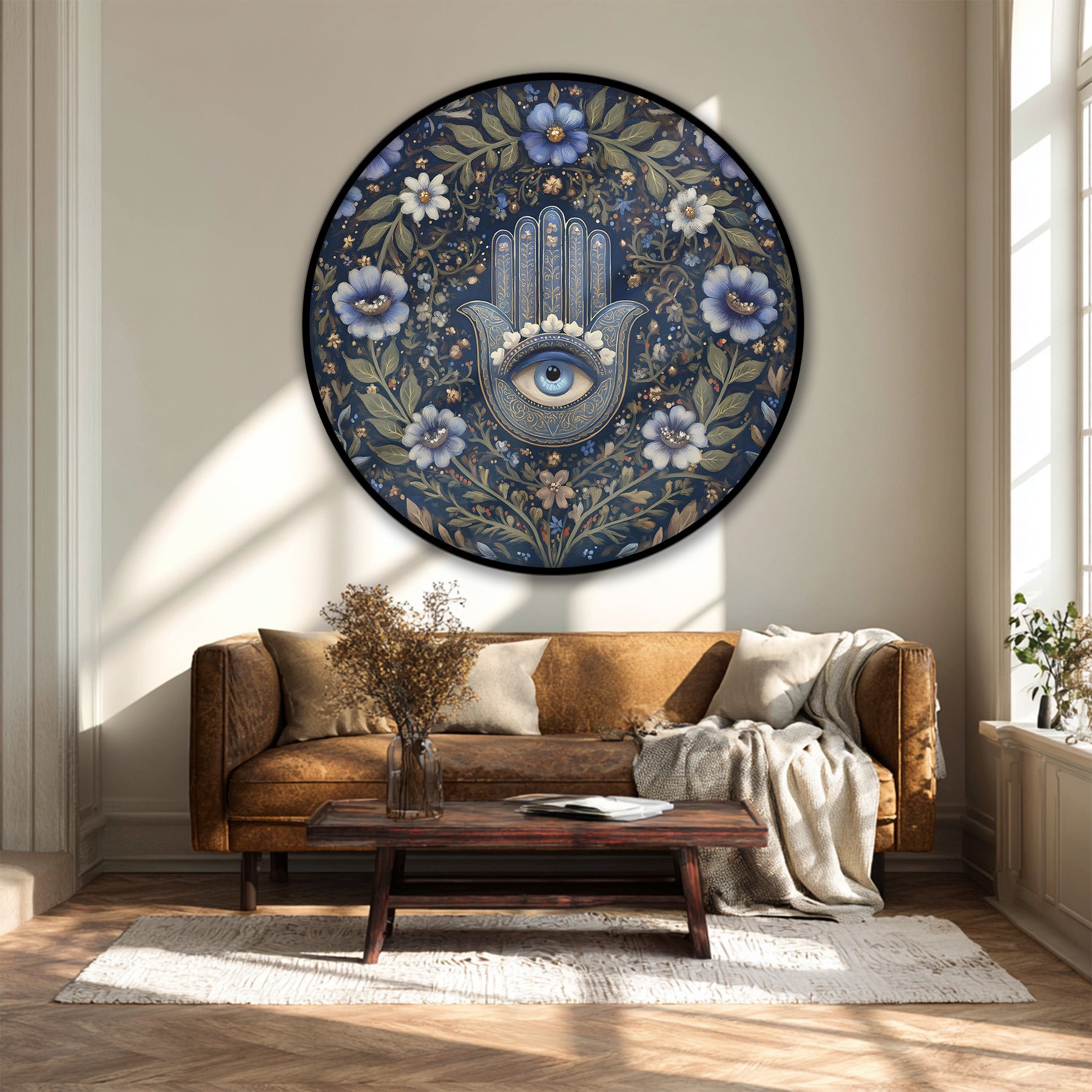 Circular canvas wall art featuring a central Hamsa hand and eye design, surrounded by a geometric arrangement of blue and white floral elements.