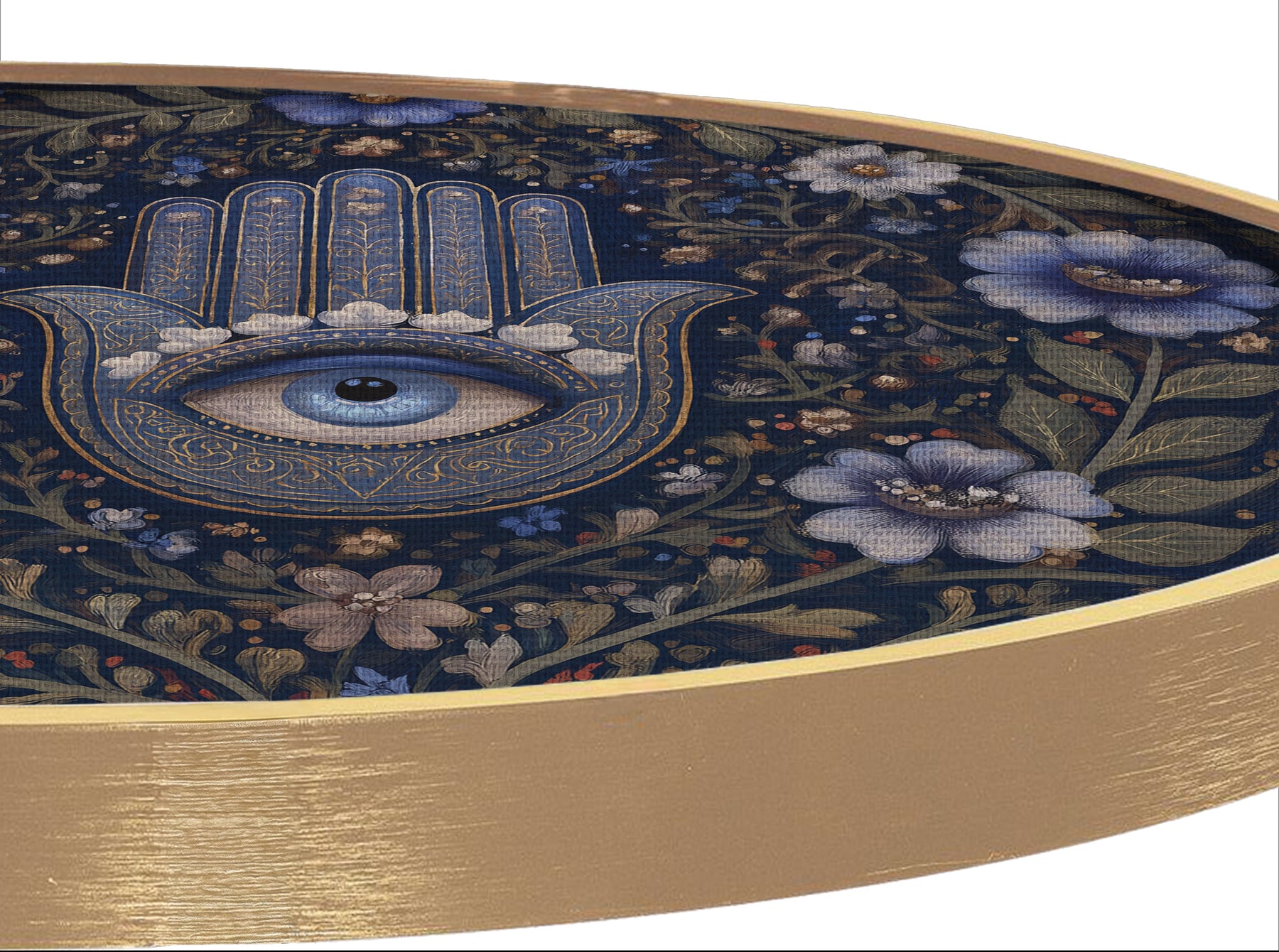 Infuse your space with beauty, symbolism, and refined artistry through this captivating round canvas print. At its center, a delicately detailed hand motif with a serene eye is surrounded by an intricate arrangement of soft blue and ivory flowers, intertwined with graceful foliage. The deep navy background enhances the gold-accented details, creating a luxurious and timeless visual harmony.