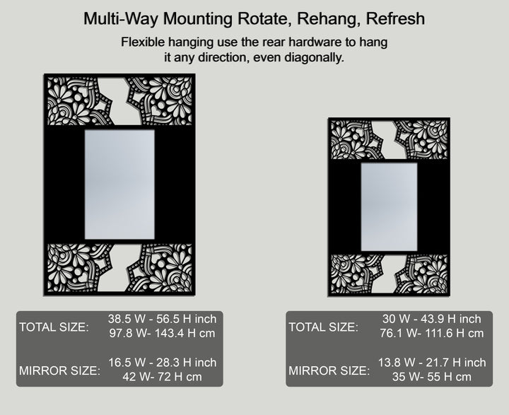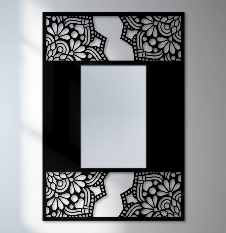 This floral mandala frame metal floor mirror blends soft ornamental motifs with bold modern structure. The central rectangular mirror is surrounded by a deep black metal frame, while the top and bottom sections reveal intricate floral mandala patterns that add elegance and visual texture.