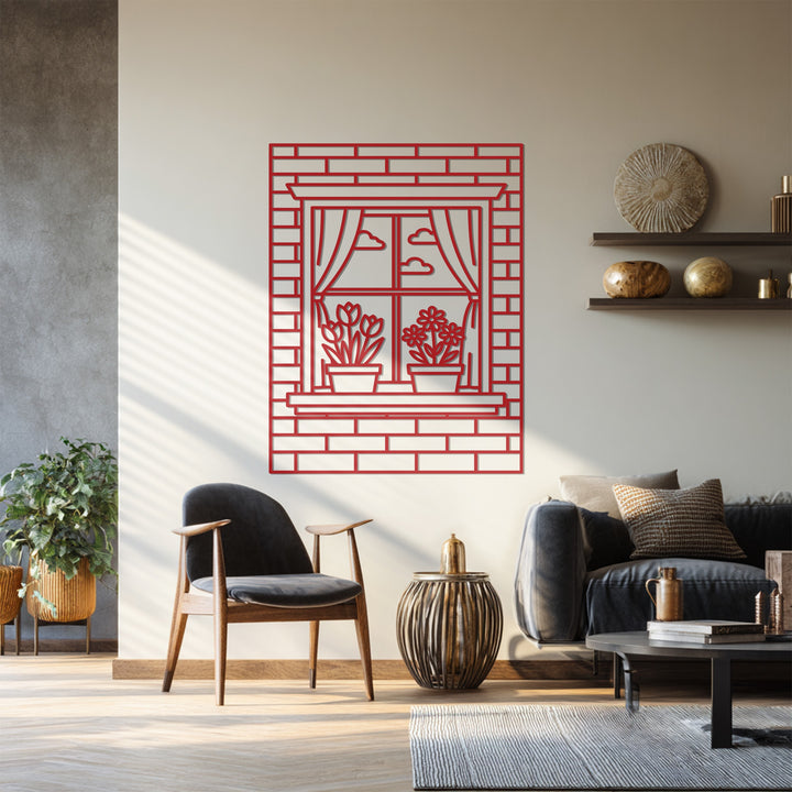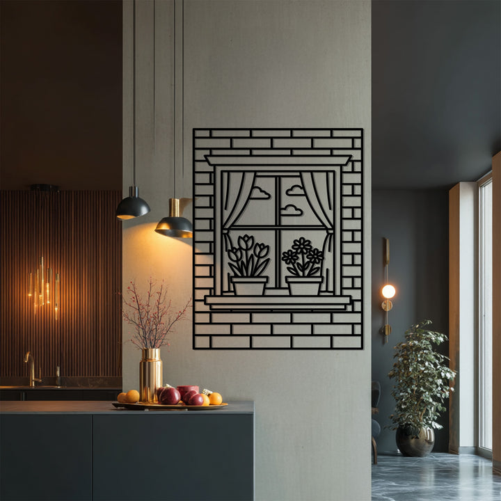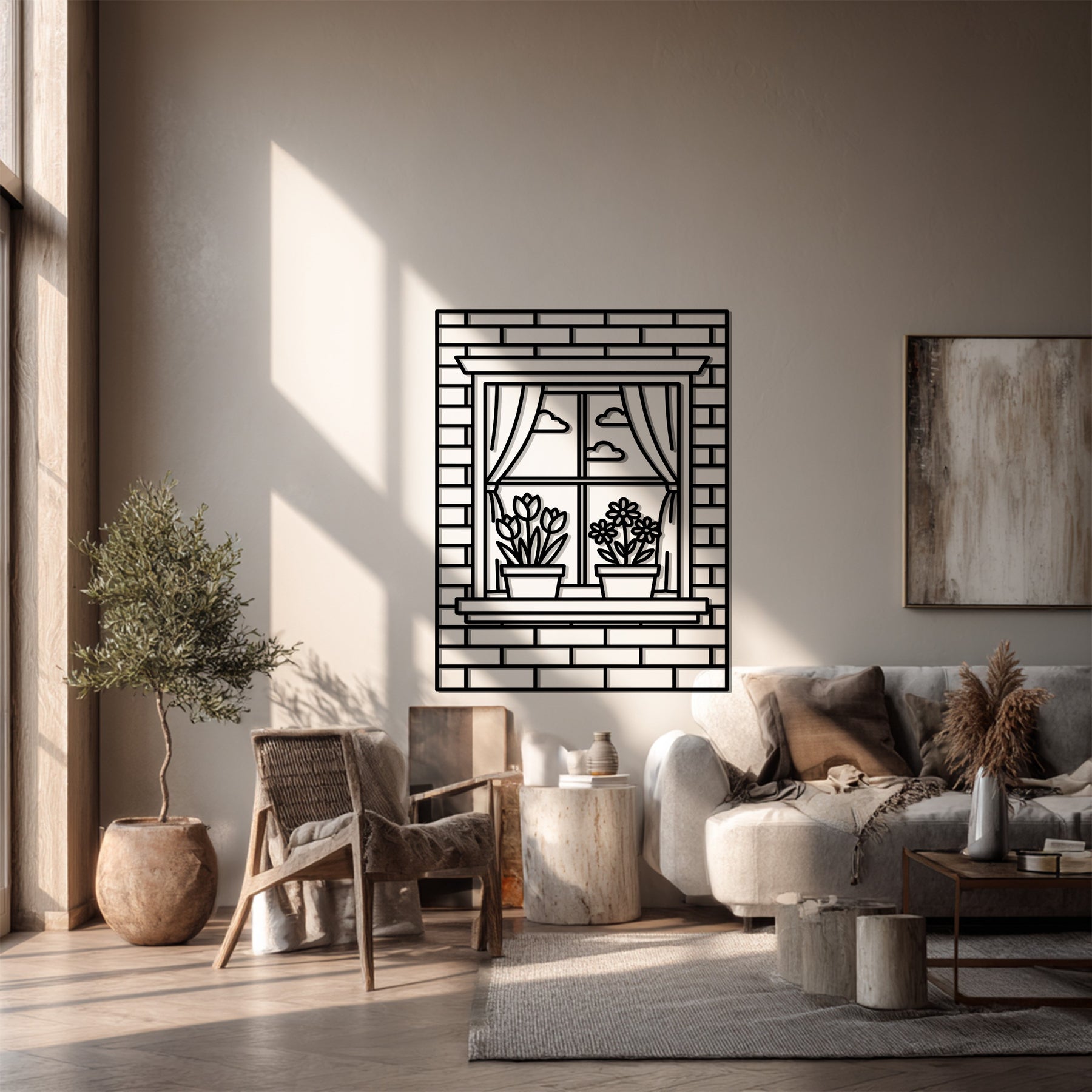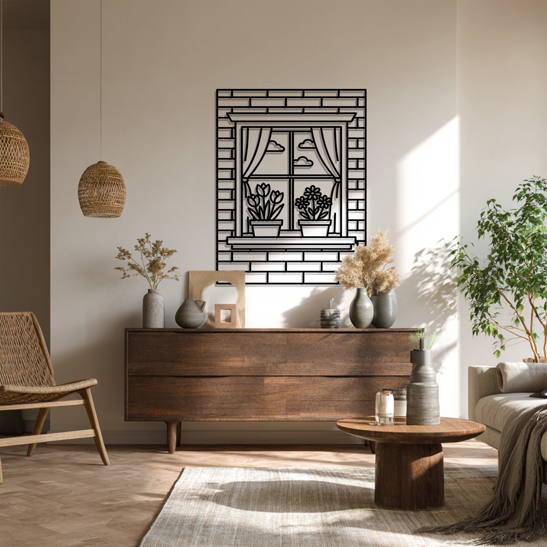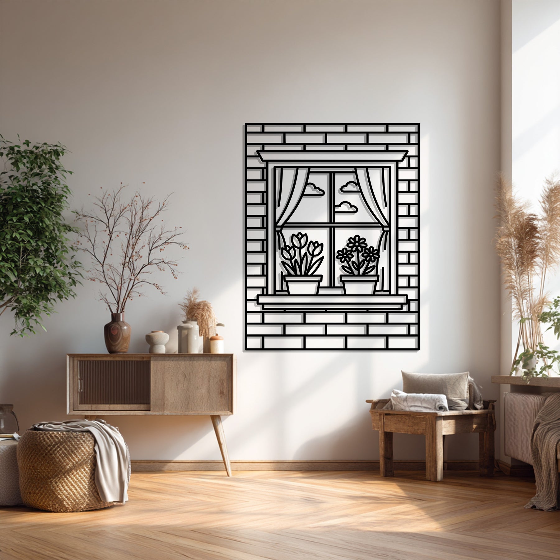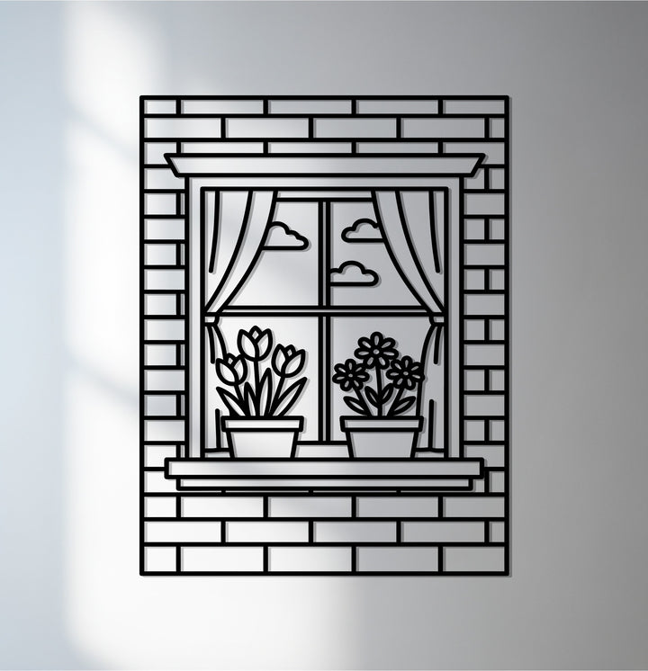 Bring timeless charm and cozy elegance into your home with this floral window scene metal wall art. Designed to resemble a brick-framed window, it features detailed curtains, blooming potted tulips and daisies, and a serene backdrop of clouds drifting across the sky. This intricate silhouette captures the beauty of looking out through a peaceful window view, making it an inviting accent for any interior.