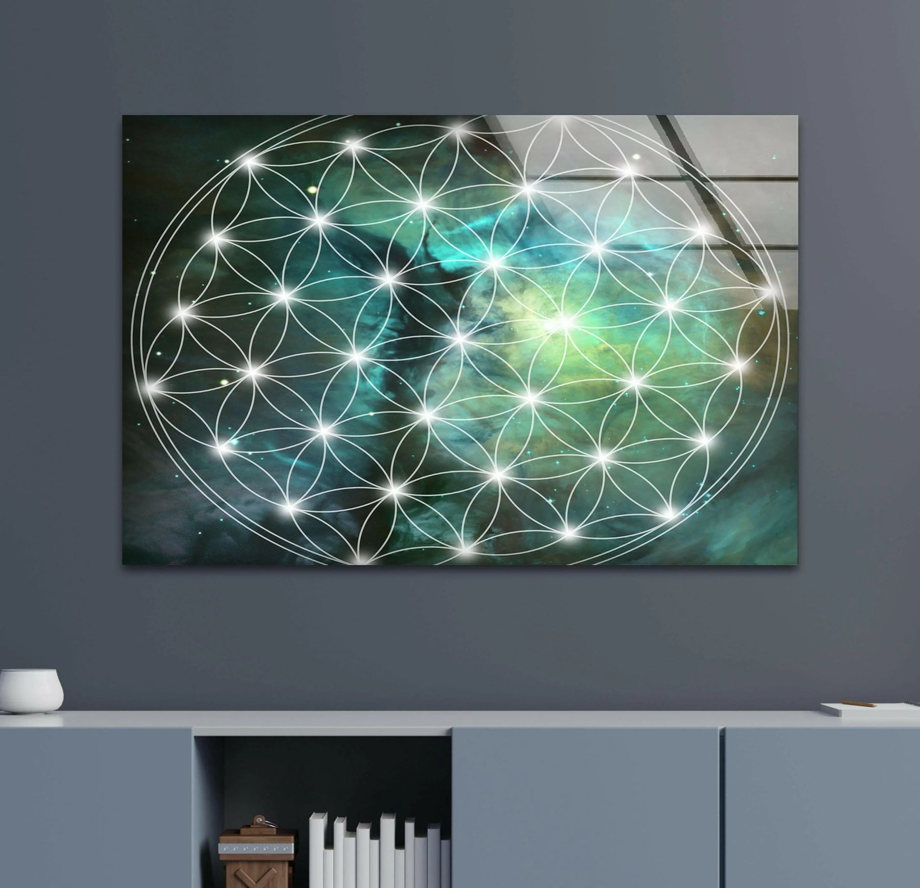 Printed on reinforced tempered glass, this Glass Wall Art radiates a serene aura while enhancing your decor with its intricate geometry and soothing colors. It's perfect for those who cherish sacred symbols and contemporary elegance.