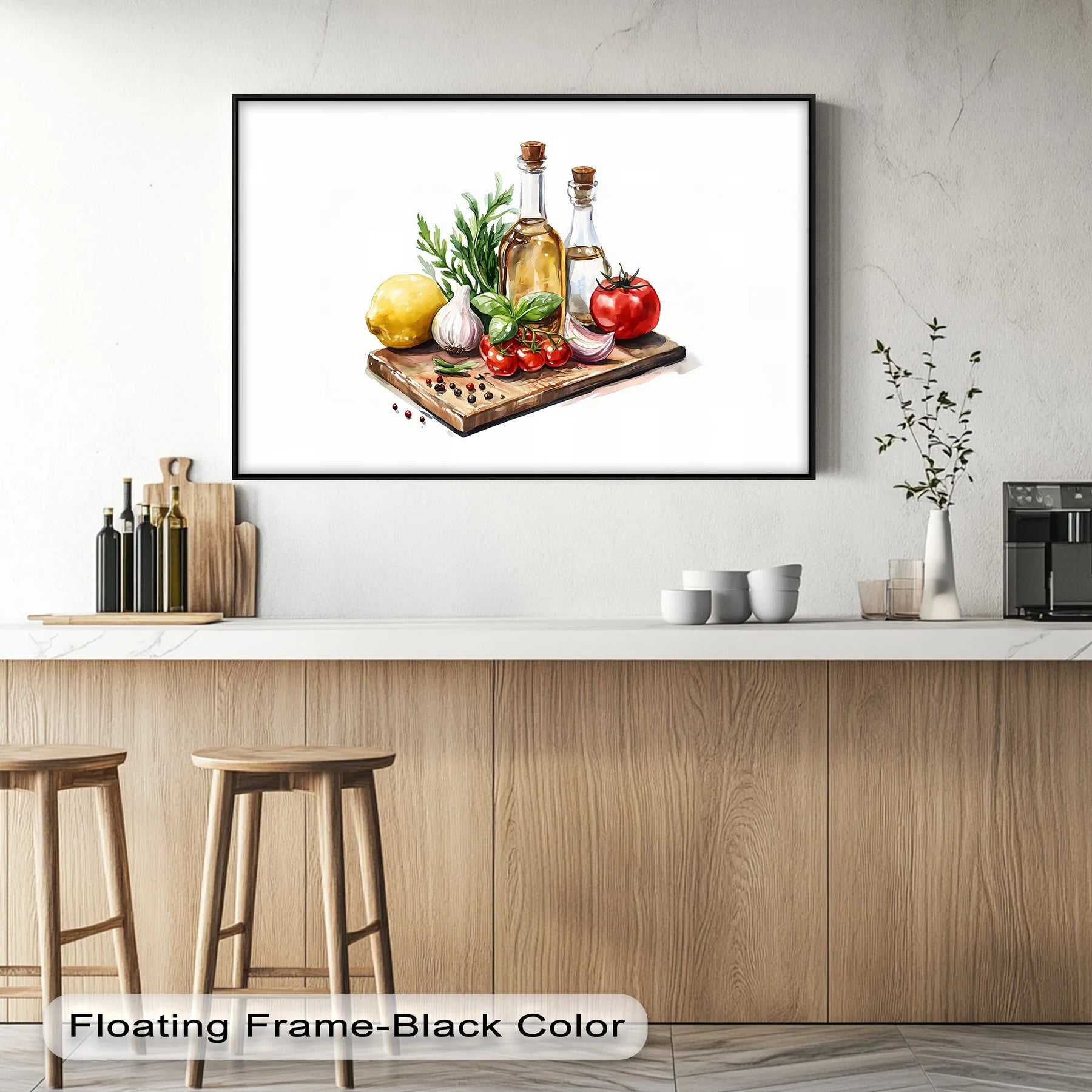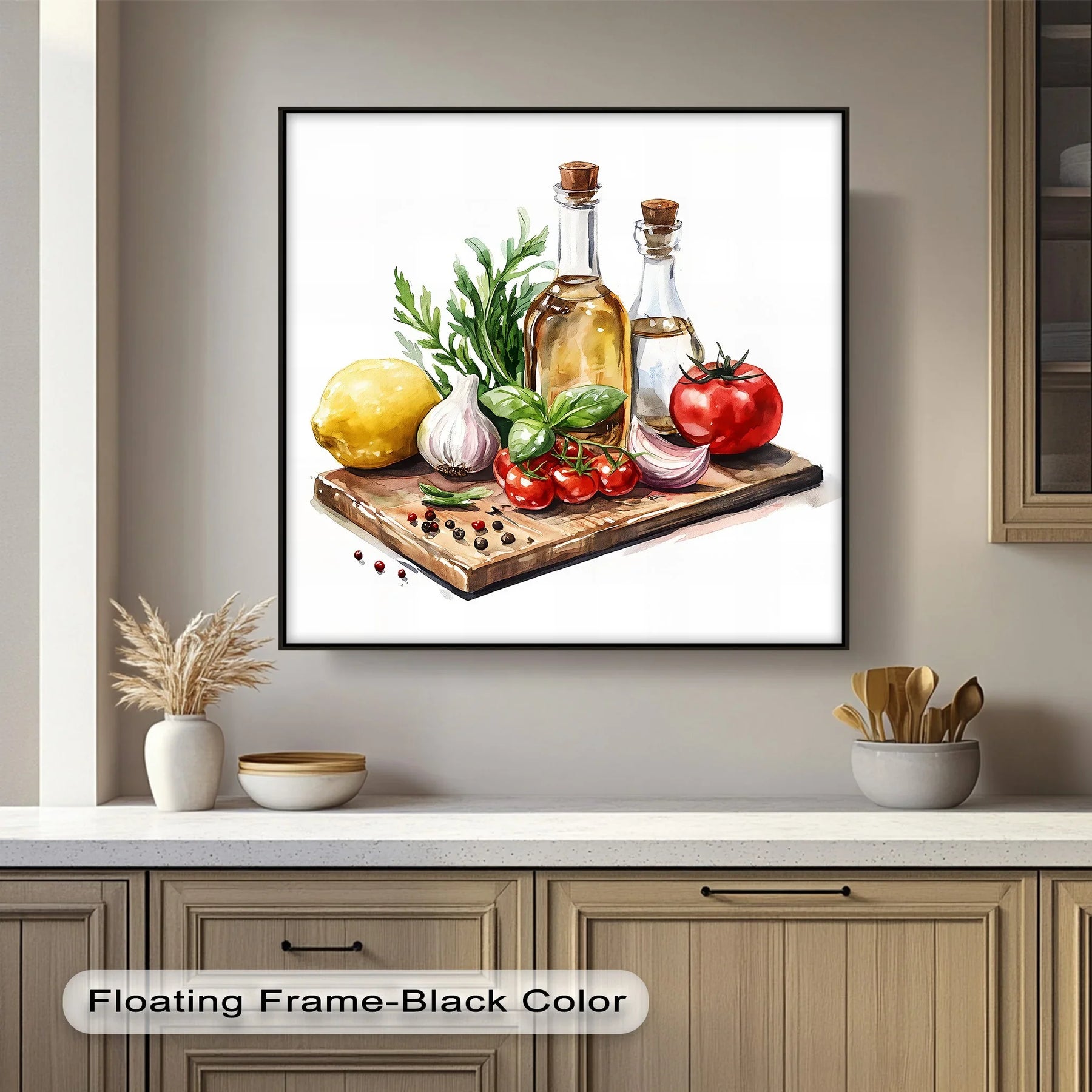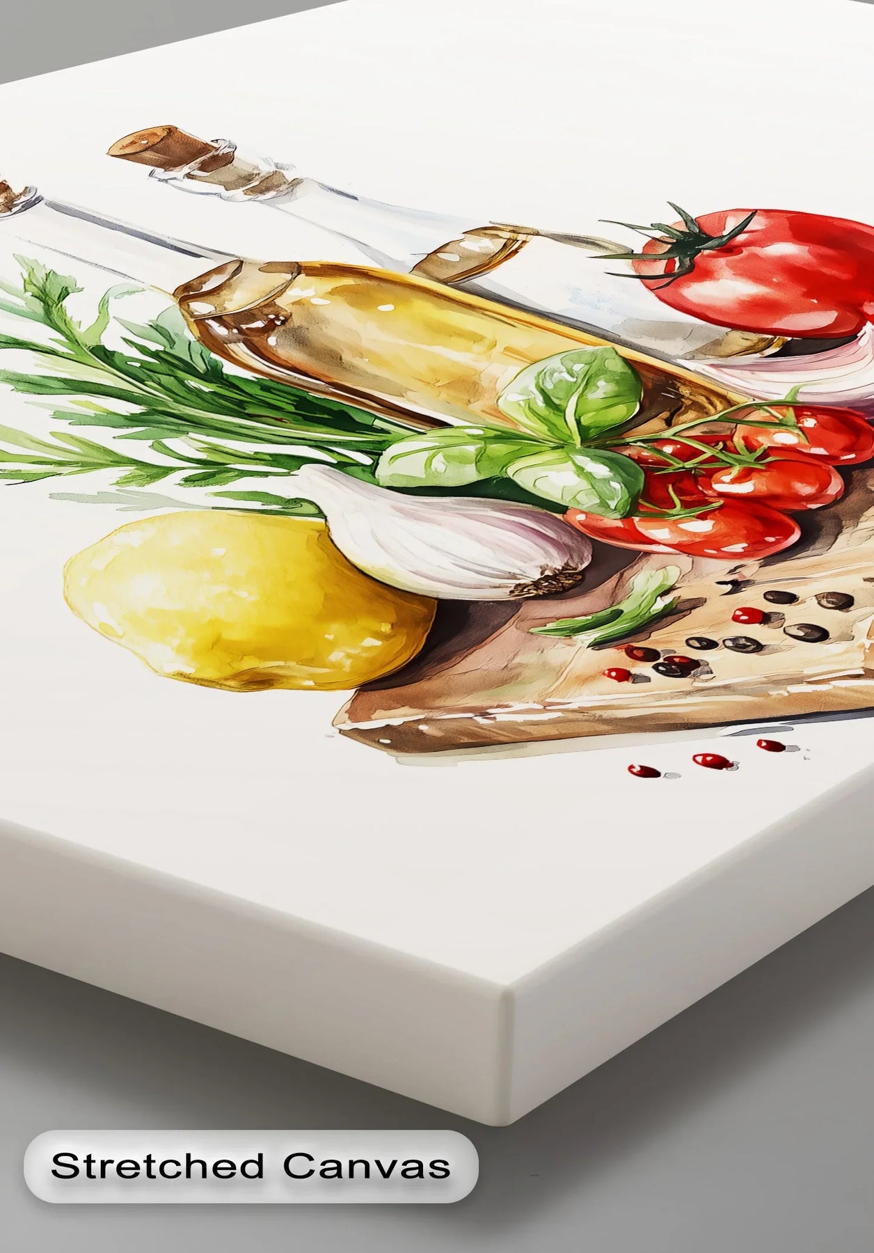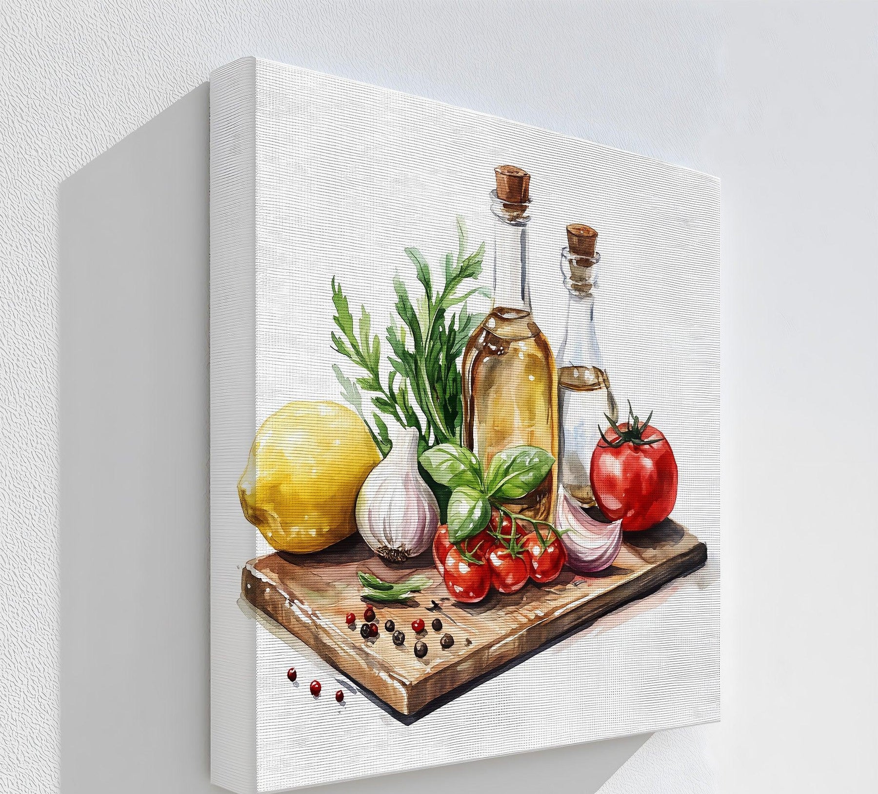 Bring the essence of Mediterranean cooking into your home with this vibrant kitchen canvas print. Featuring a delightful still life of fresh basil, ripe tomatoes, garlic, lemon, herbs, peppercorns, and bottles of golden olive oil and vinegar, this artwork radiates freshness and simplicity. Set against a bright, minimalist backdrop, it adds a refreshing and organic touch to kitchen or dining decor—perfect for lovers of natural cooking and rustic charm.