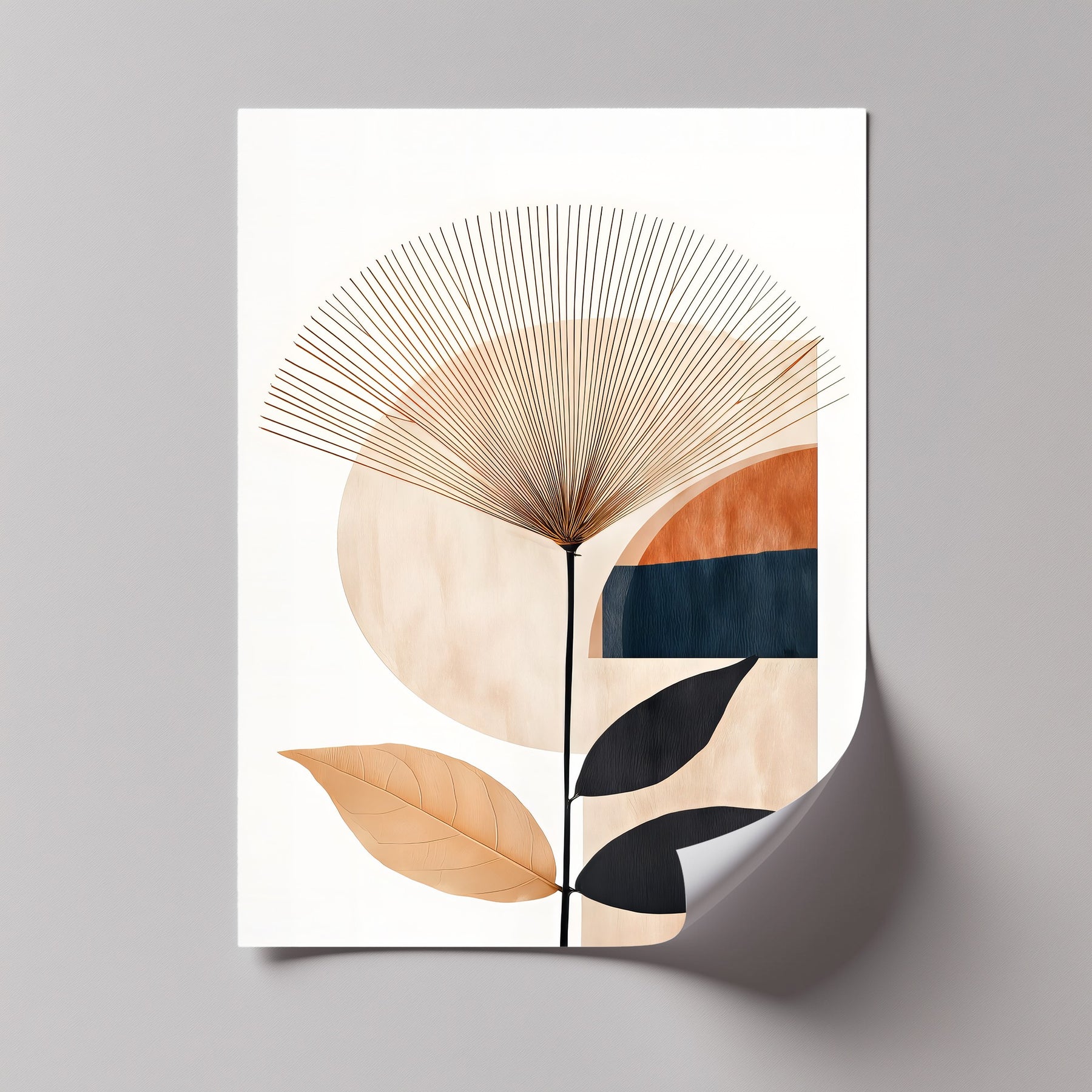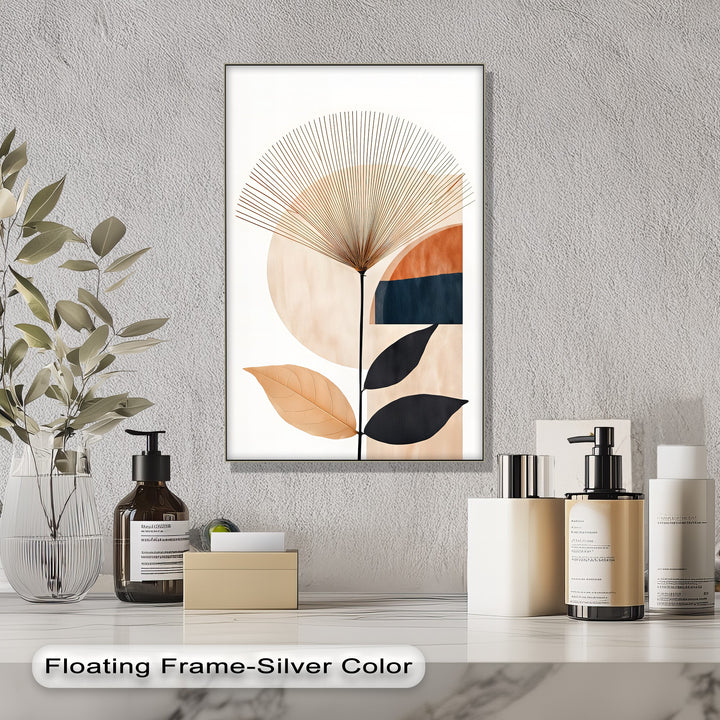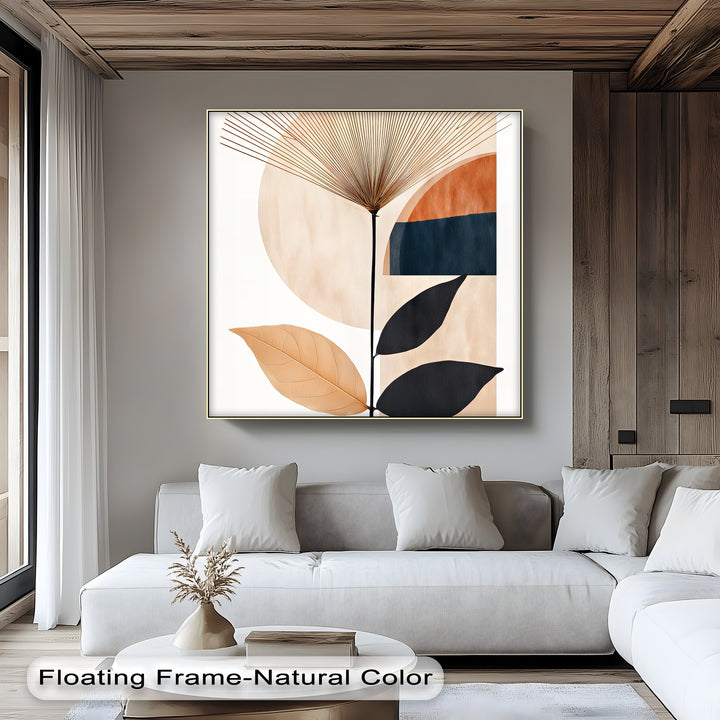 Bring radiant balance into your home with Sunburst Harmony, a striking abstract canvas wall art that blends natural botanical elegance with bold geometric design. Featuring a sunburst pattern rising above circular and linear forms in earthy beige, terracotta, and deep charcoal tones, this artwork creates a sense of movement and serenity.