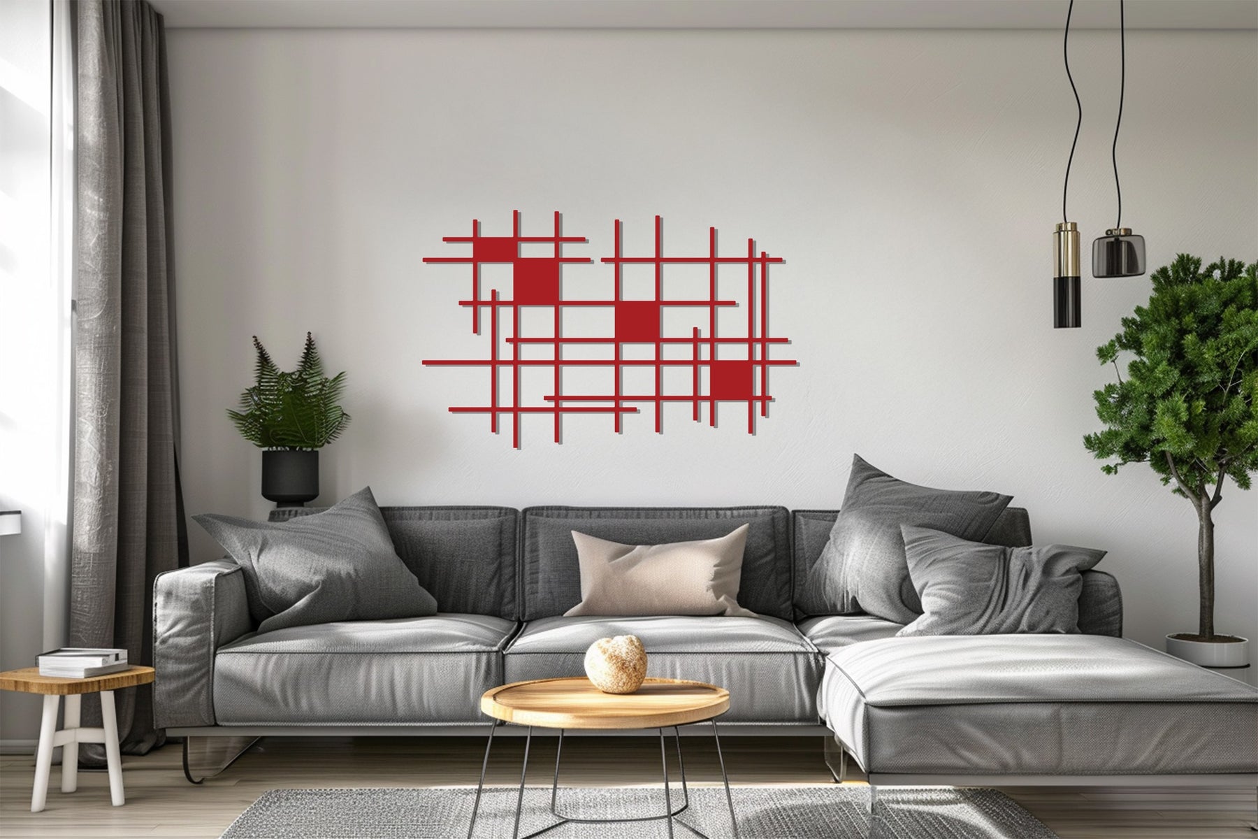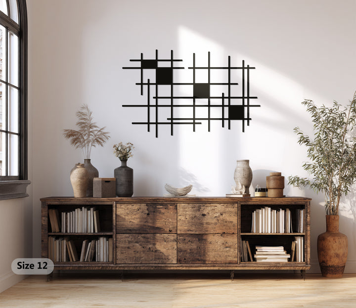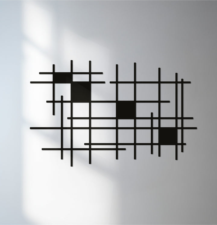 Bring contemporary elegance into your home with this Geometric Grid Metal Wall Art. Featuring an abstract grid pattern with intersecting lines and bold black accents, this piece captures the essence of modern minimalism. Perfect for living rooms, offices, or hallways, it enhances your walls with a stylish and architectural aesthetic. Its versatile design makes it a standout piece that complements both modern and industrial interiors.