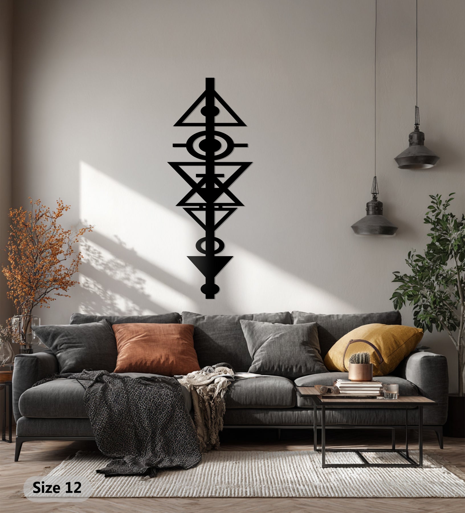 Bring striking symbolism and modern artistry into your home with this geometric tribal metal wall art. Featuring bold intersecting triangles, circles, and linear forms, this piece embodies balance, strength, and harmony. Its abstract tribal-inspired design makes it a versatile decor element, perfect for both contemporary and bohemian interiors.