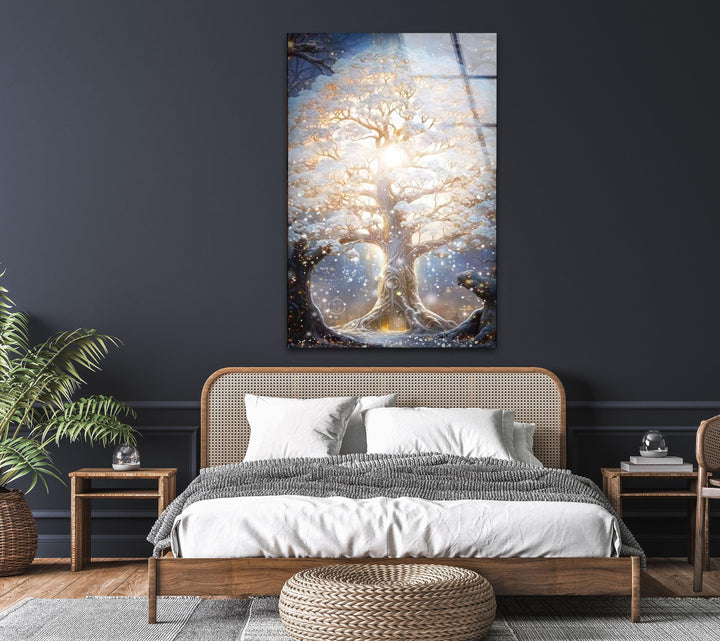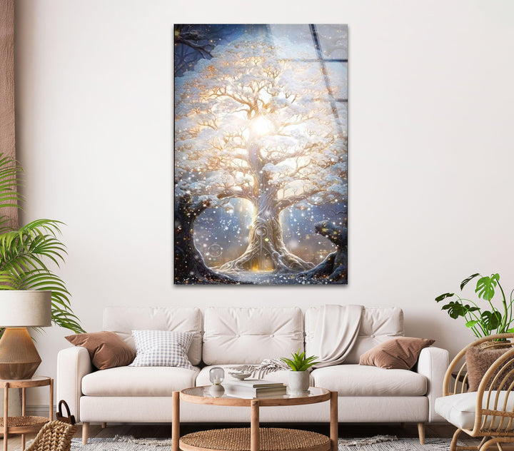Illuminate Your Space with the Glowing Blossom Oak Tree Glass Wall Art