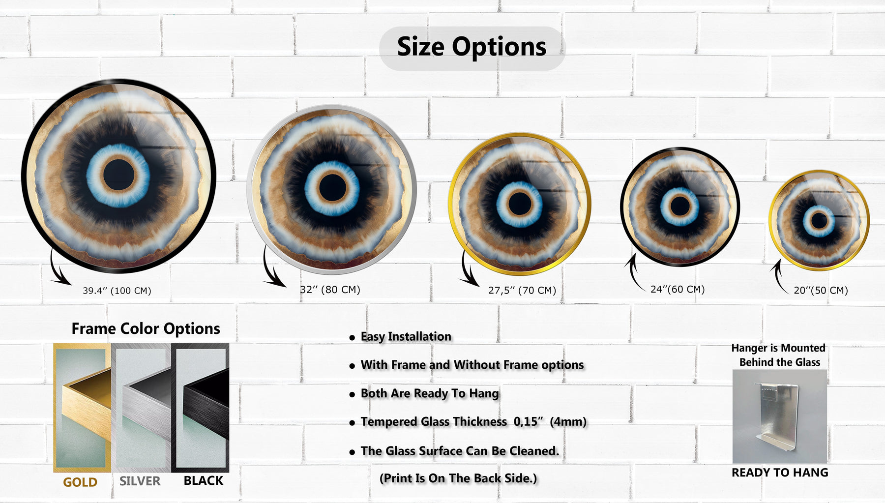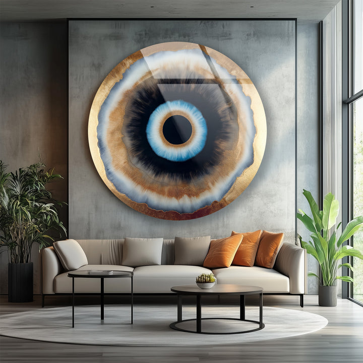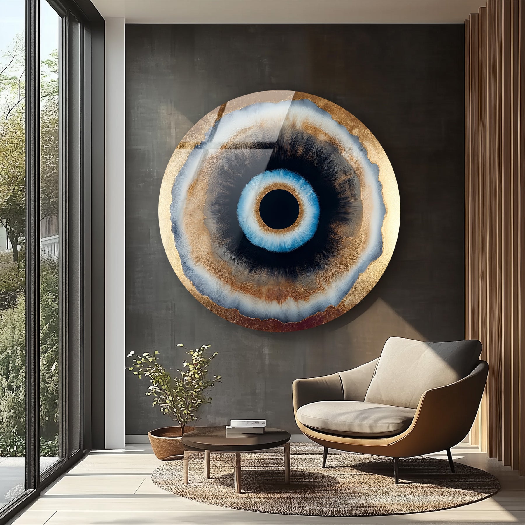 Immerse yourself in the mystique of the Golden Aura Eye – Modern Abstract Round Glass Wall Art, a mesmerizing fusion of elegance, depth, and symbolism. The central eye design, surrounded by natural brown and golden tones, radiates a powerful sense of protection and awareness. Hints of sky blue bring balance and serenity, while the circular gradient evokes the timeless beauty of agate stone formations.