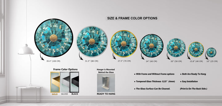Perfect for modern interiors, this round glass wall art adds sophistication and visual depth to your living room, bedroom, hallway, or office. Its reflective glass surface enhances natural light while the warm golden center brings a sense of energy and harmony. The design symbolizes balance and renewal — the golden core representing life and warmth, while the turquoise rings evoke calm seas and serenity.