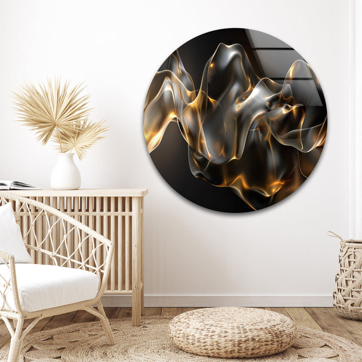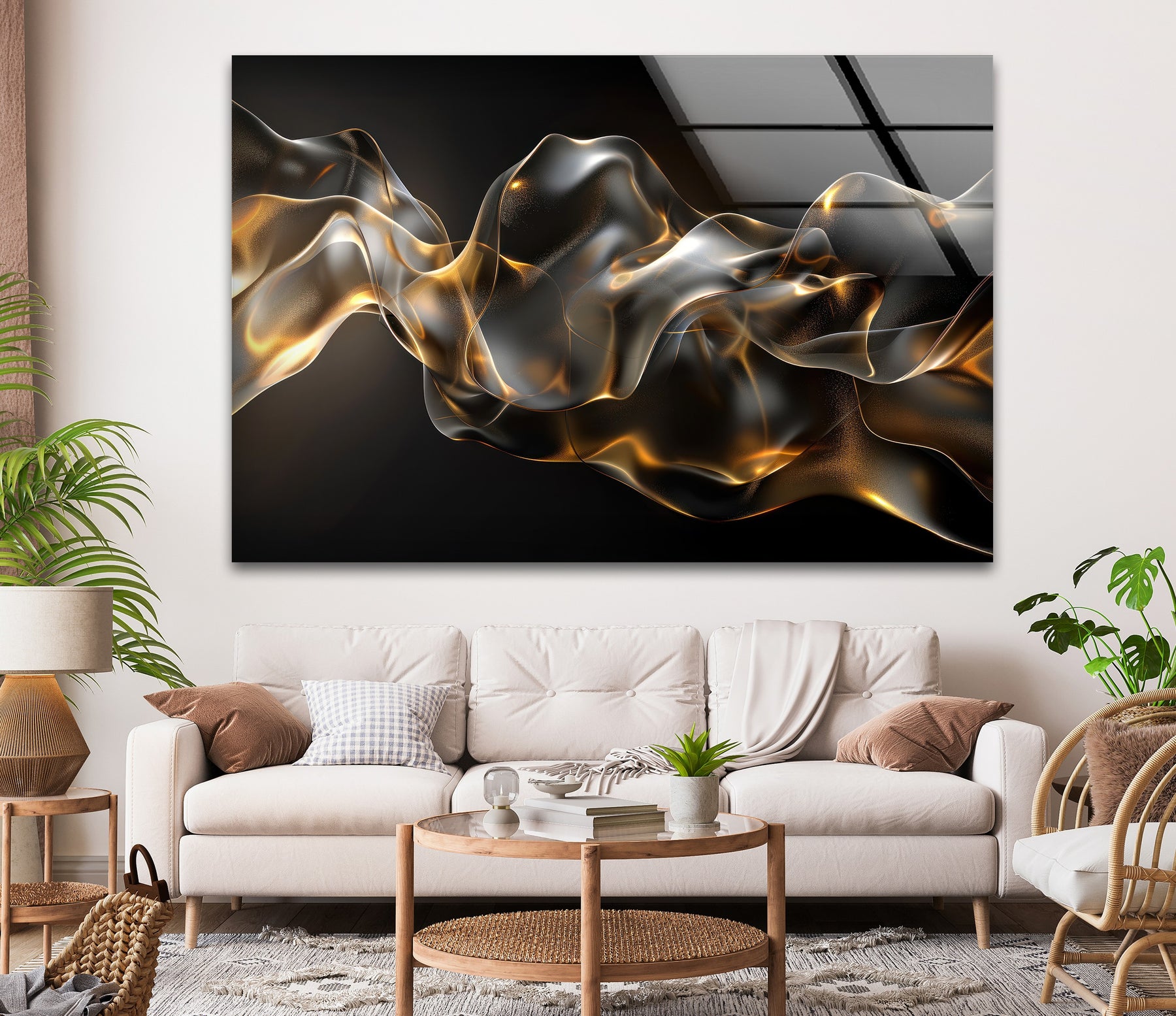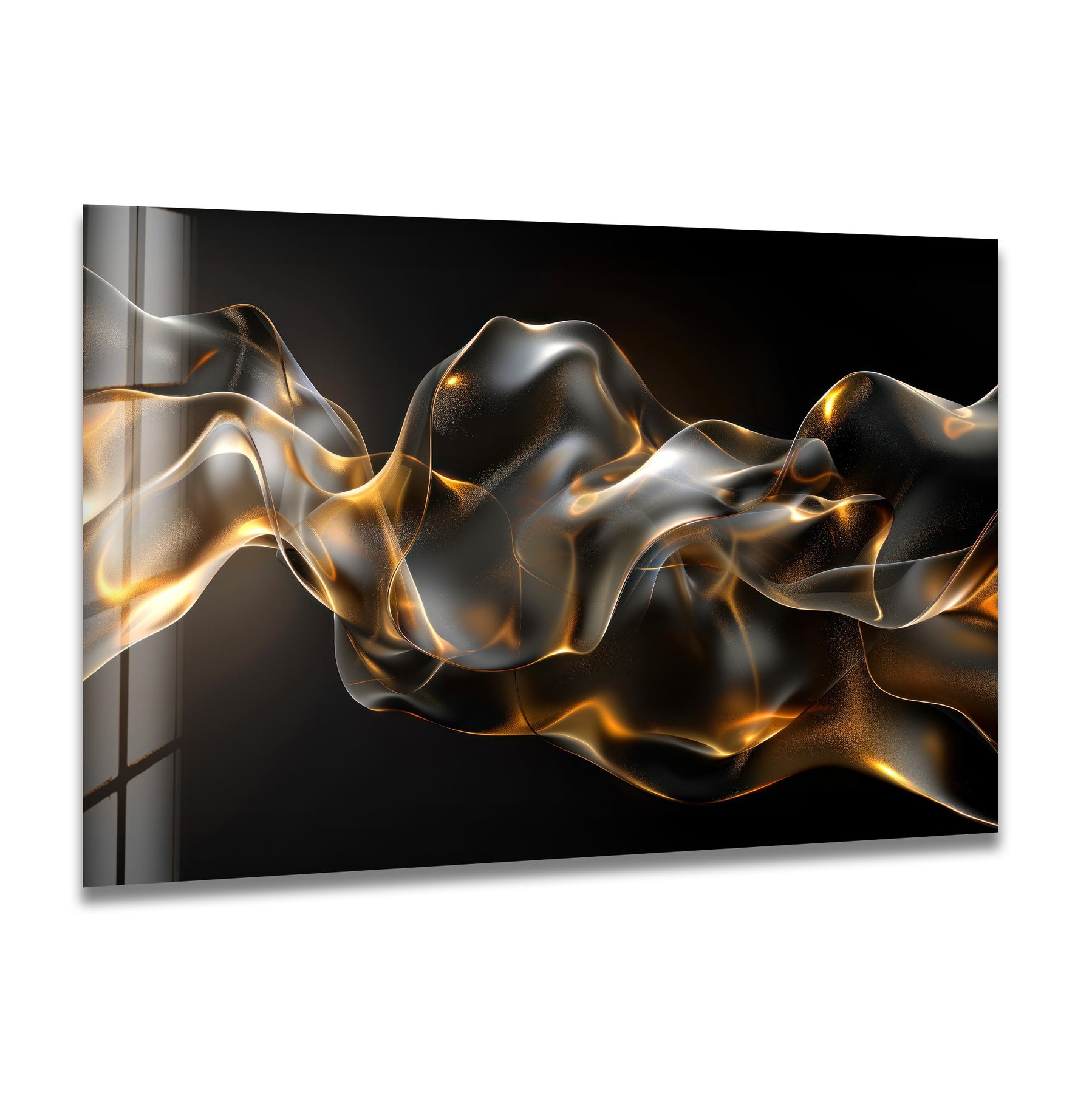 Golden Ember Veil – Abstract Smoke Wave Glass Wall Art