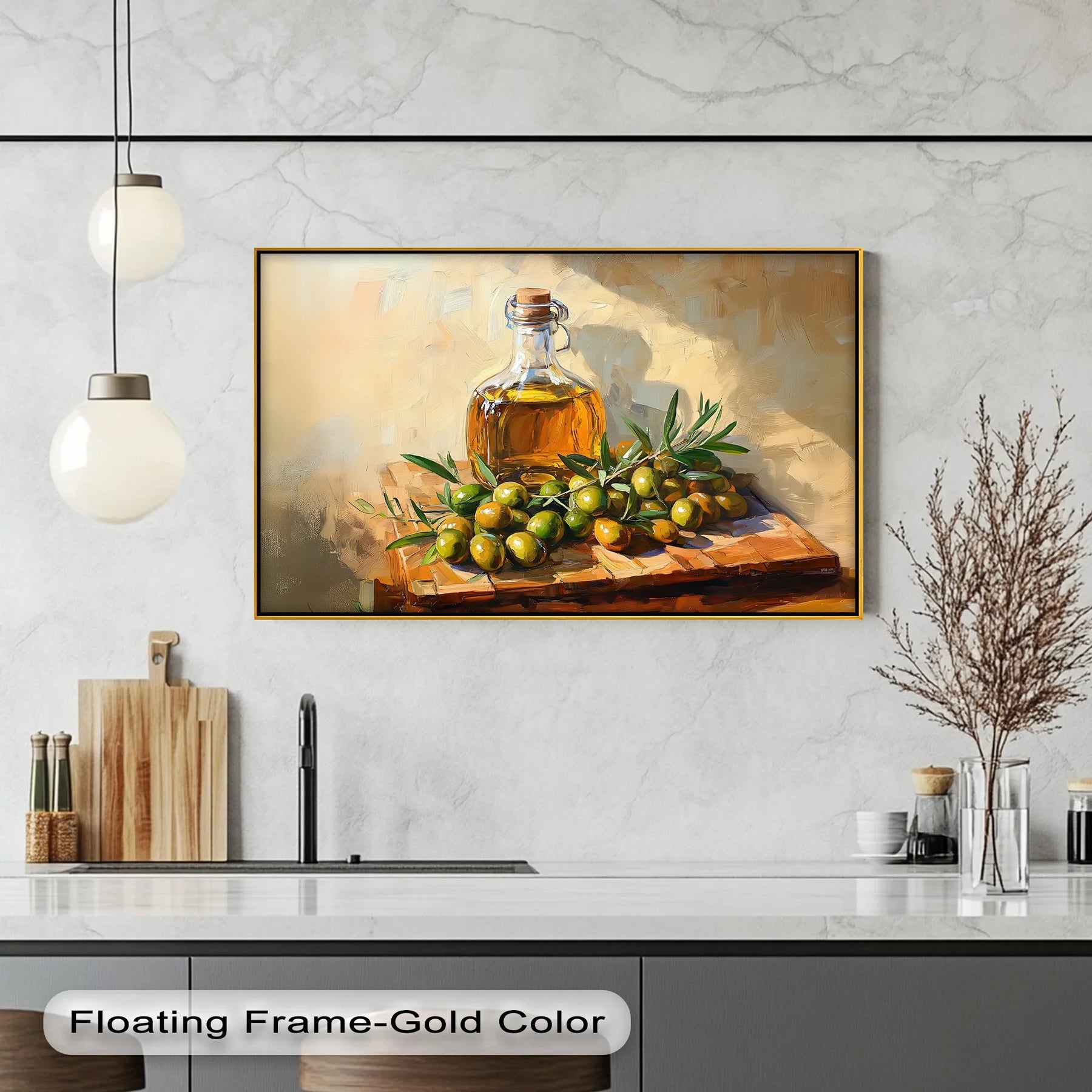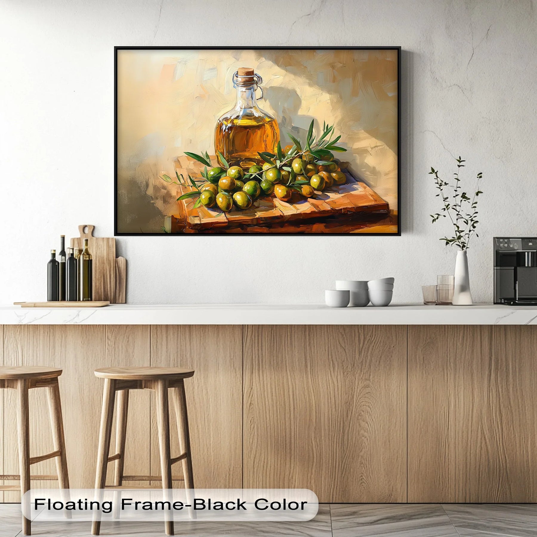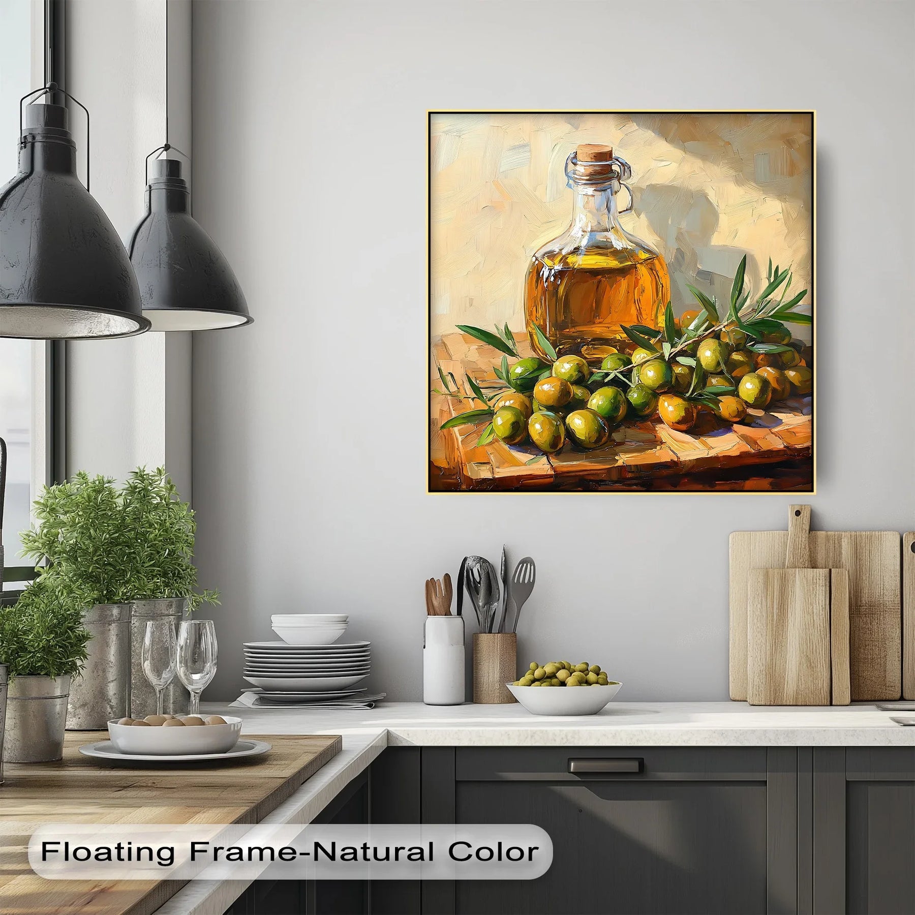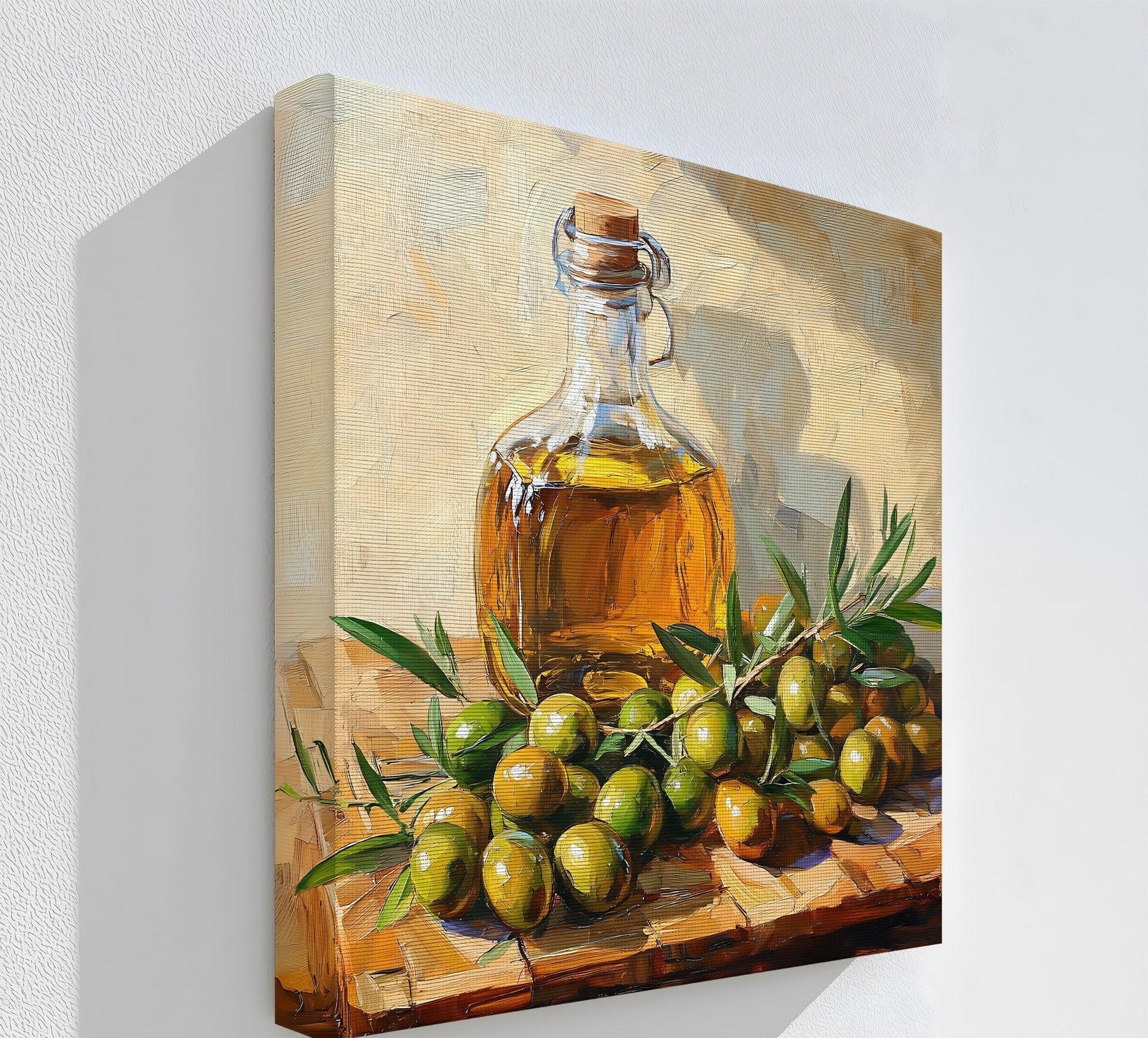 Celebrate the rustic beauty of Mediterranean tradition with this rich, textured canvas print featuring a bottle of golden olive oil surrounded by ripe, glistening olives and lush green leaves. The earthy tones and bold brush strokes evoke warmth and authenticity, making this piece a perfect fit for kitchens, dining rooms, or farmhouse-inspired interiors. It brings the essence of natural flavors and sun-kissed groves right into your home.