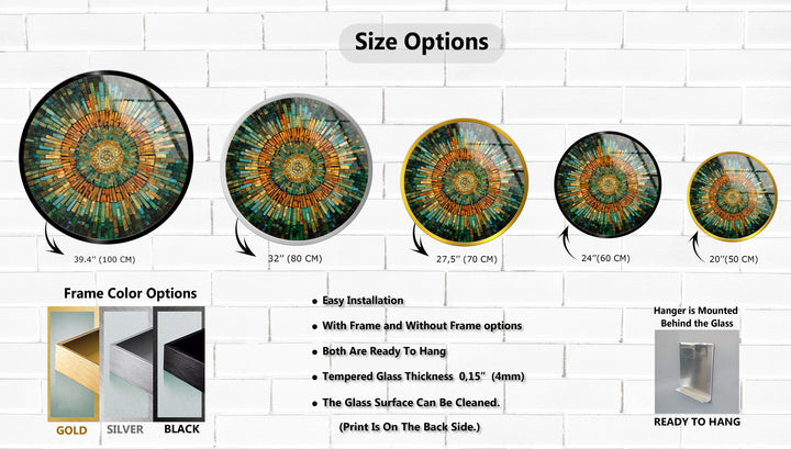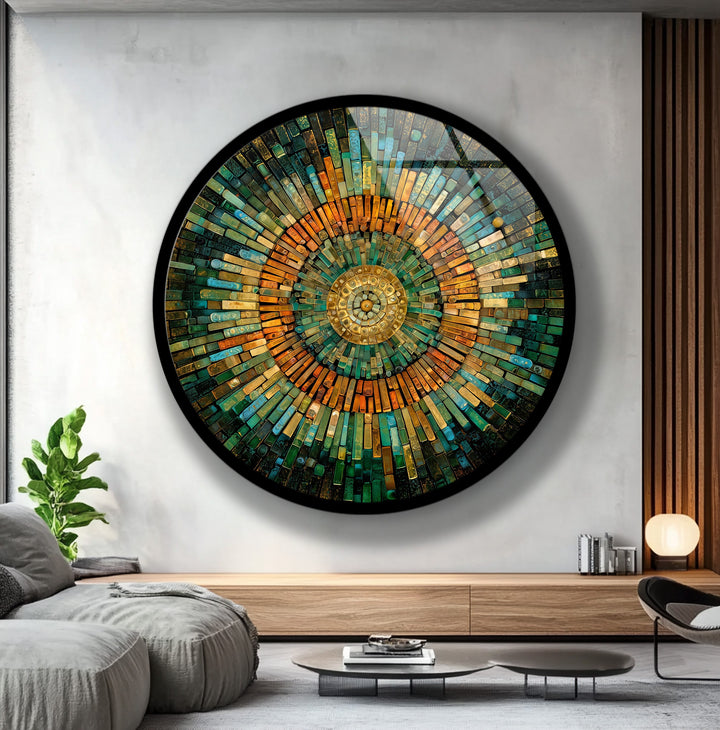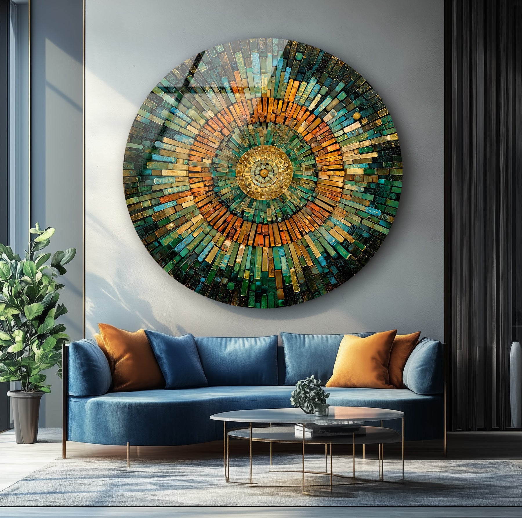 Illuminate your space with the Golden Horizon – Emerald & Amber Mosaic Round Glass Wall Art, a stunning fusion of warmth and elegance. This radiant design features intricate glass tiles in rich shades of turquoise, emerald, and amber — converging toward a luminous golden center that evokes sunlight breaking through a forest canopy. The piece radiates harmony, sophistication, and natural energy, making it a perfect focal point for both modern and bohemian interiors.