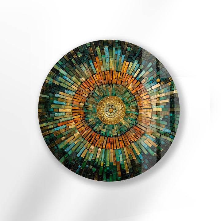 Golden Horizon – Emerald & Amber Mosaic Round Glass Wall Art