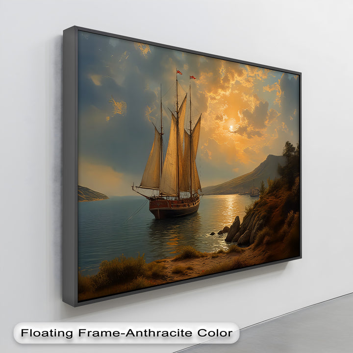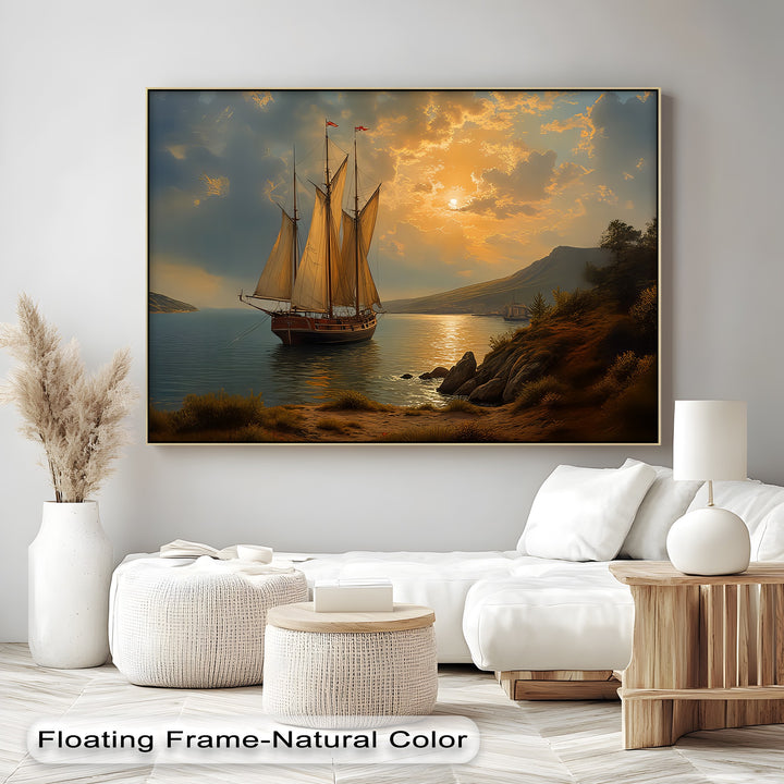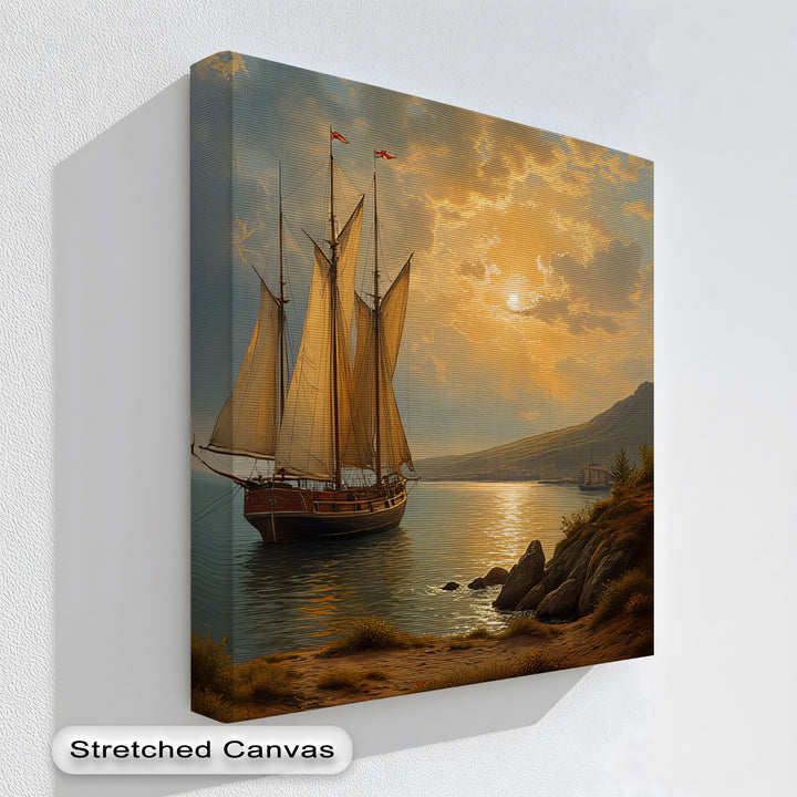 Golden Horizon Voyage – Sailing Ship Sunset Canvas Wall Art | Framed Art