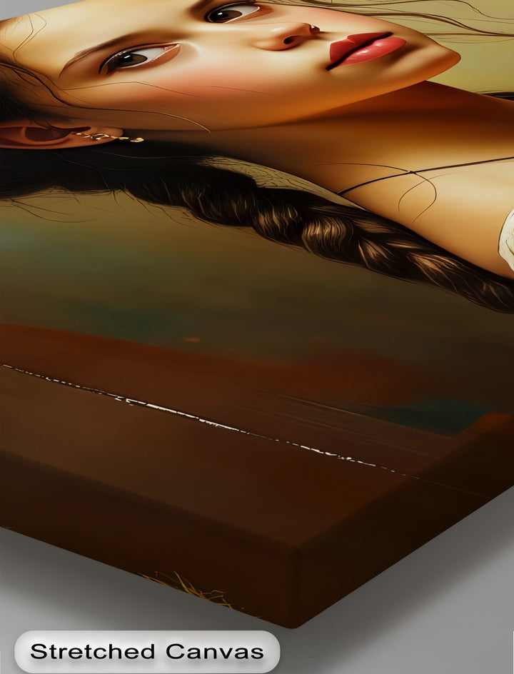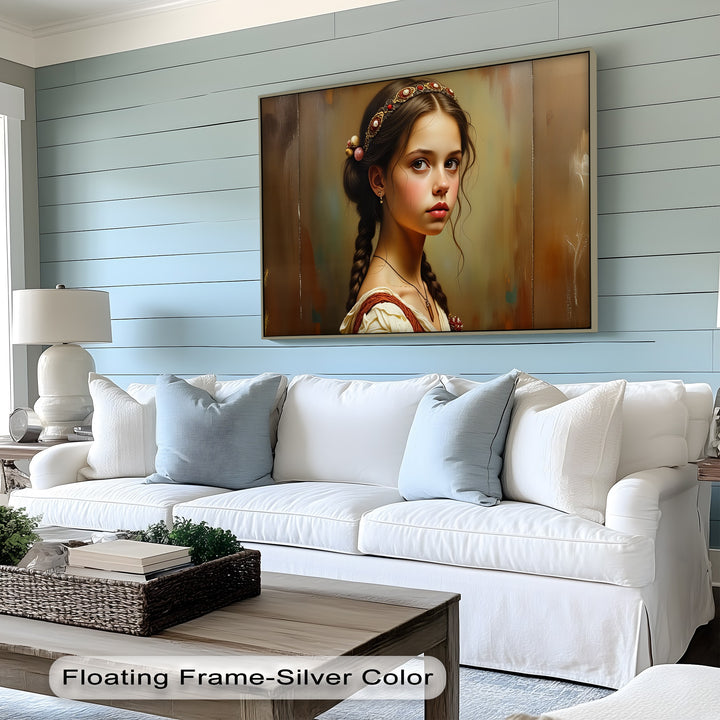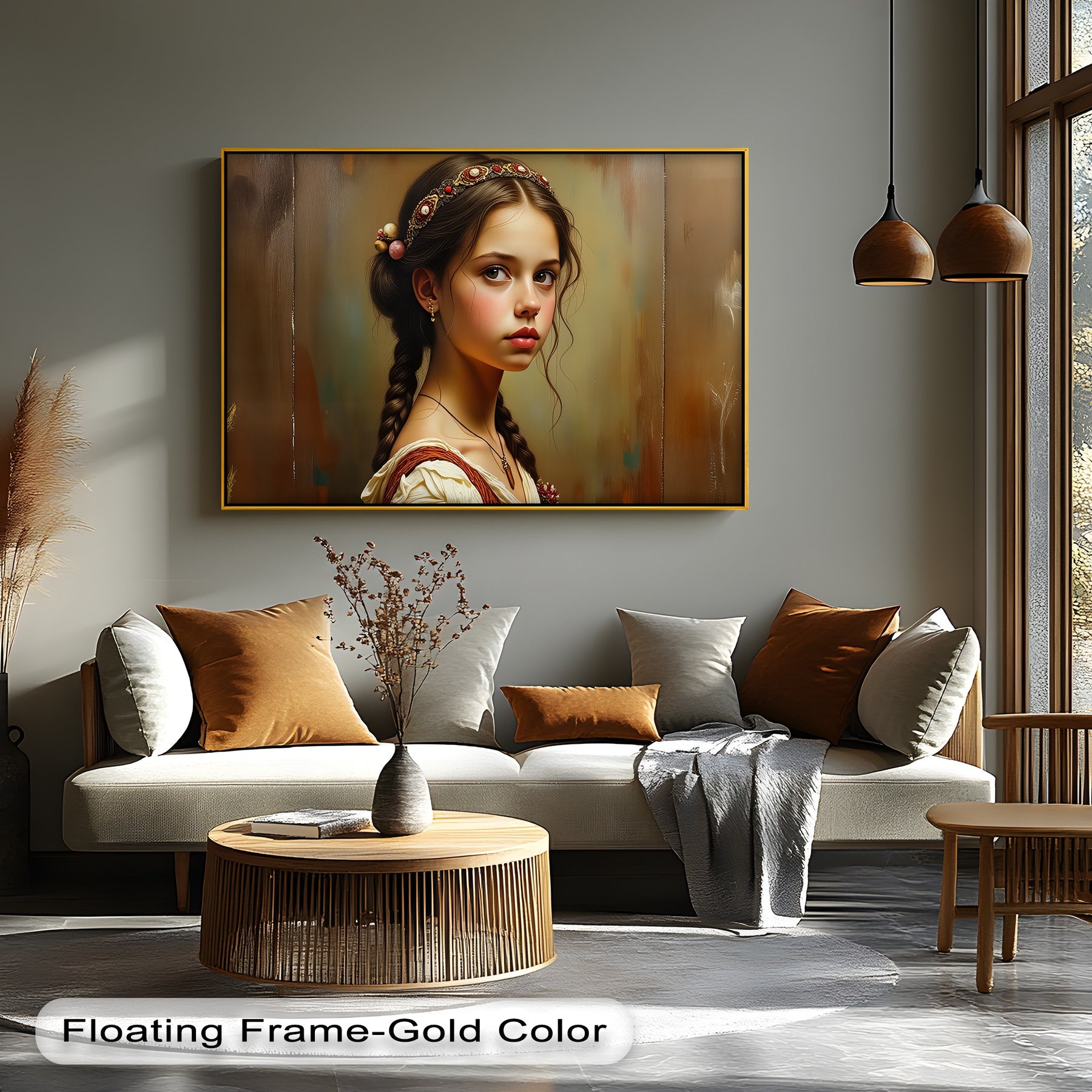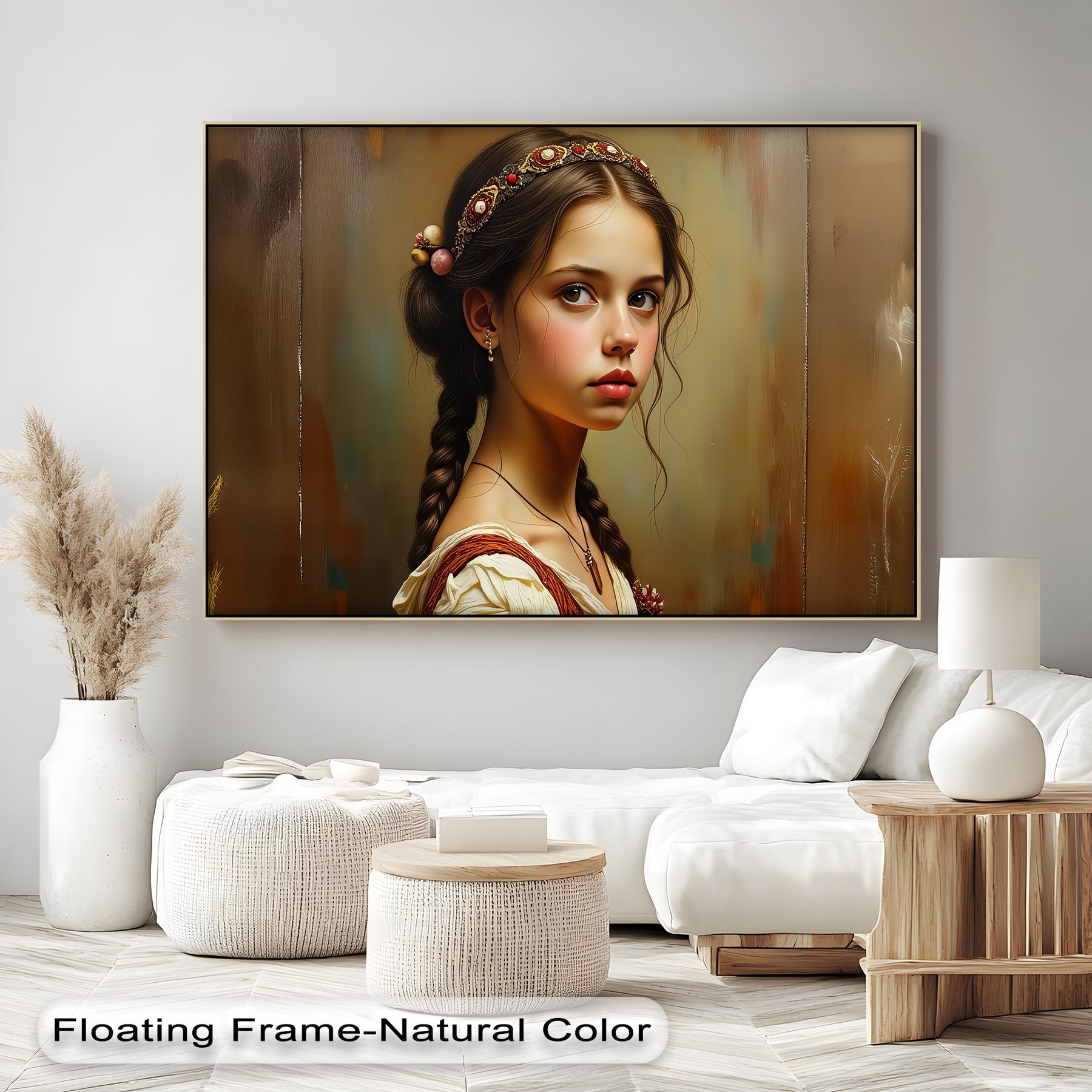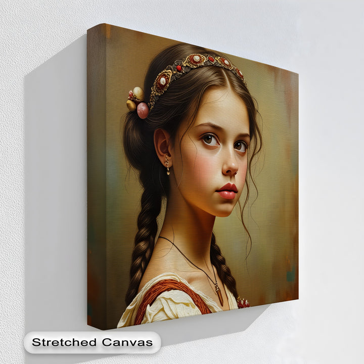 Golden Innocence – Young Girl Portrait Canvas Wall Art portrays a tender and captivating portrait of a young girl with braided hair, radiant eyes, and a crown adorned with gemstones. Her soft expression and delicate features embody purity, grace, and timeless beauty, while the warm tones and fine details create an atmosphere of intimacy and elegance.