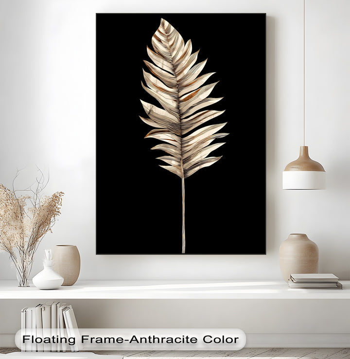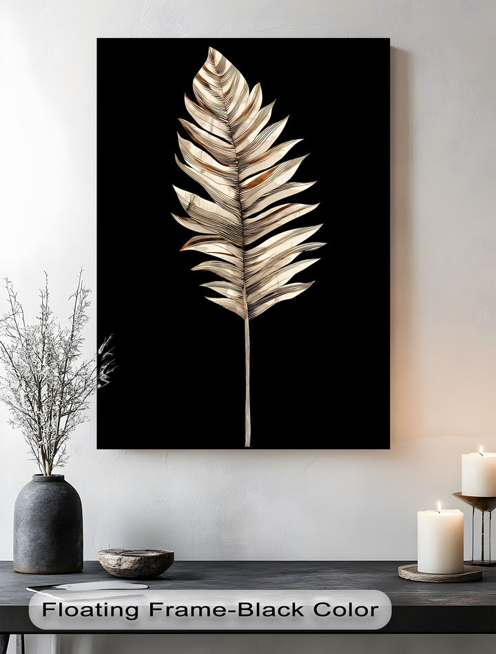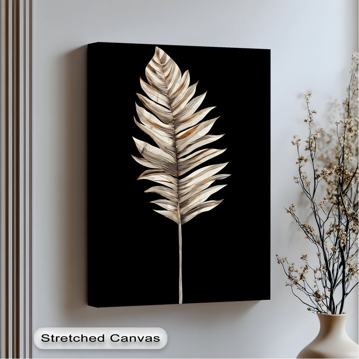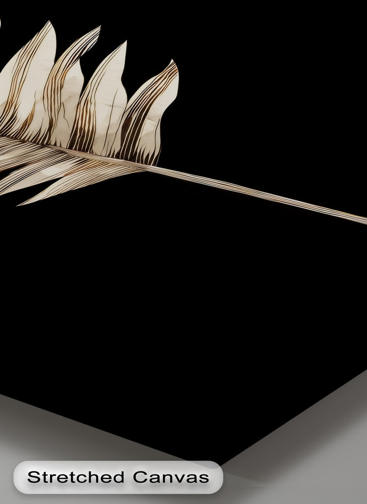 Bring sophistication and natural elegance into your home with Golden Palm, a striking canvas wall art featuring a delicately detailed palm leaf in shimmering golden tones set against a bold black backdrop. The metallic finish and fine linework create a luxurious balance of modern minimalism and organic beauty.