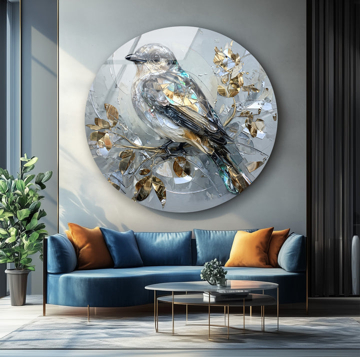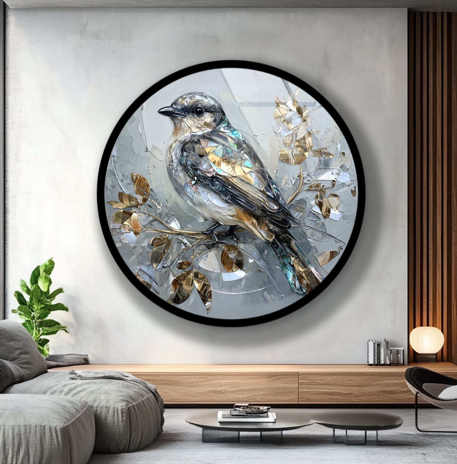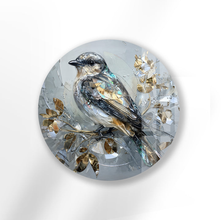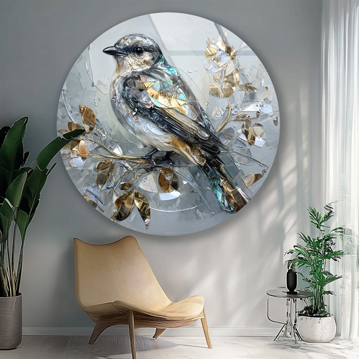 Golden Serenity – Crystal Bird Round Glass Wall Art
