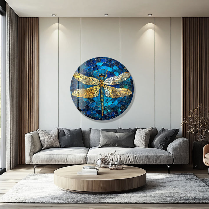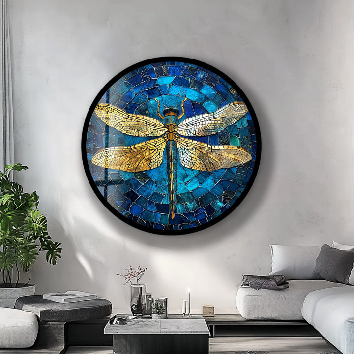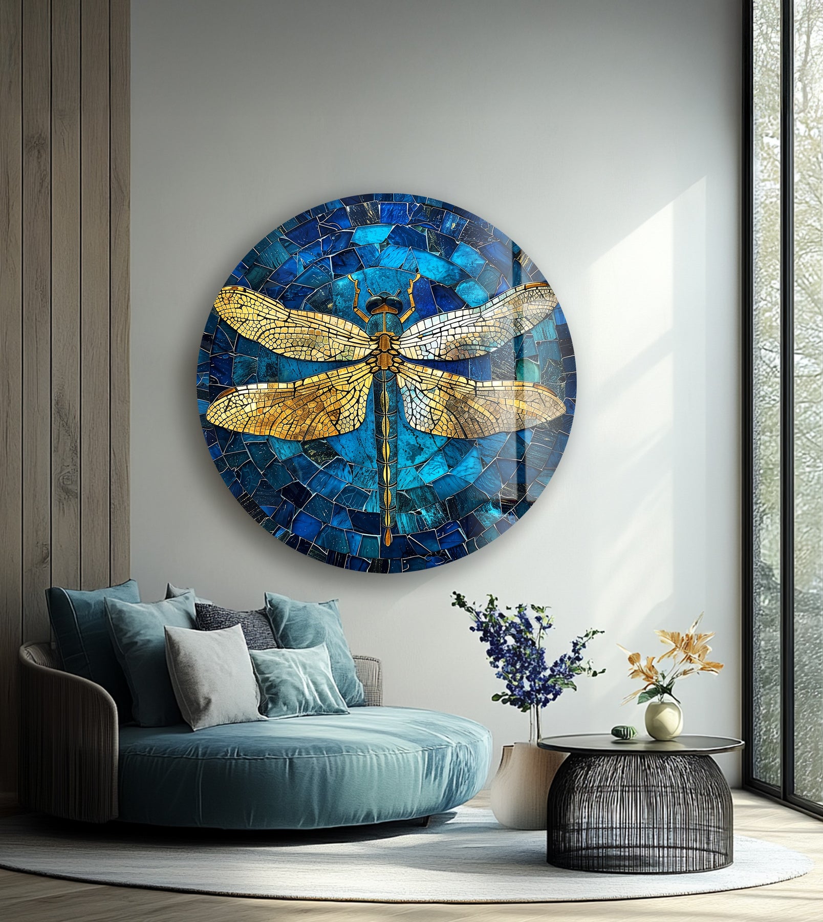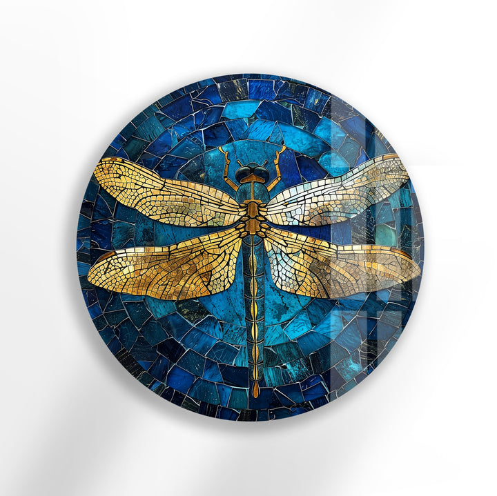 Golden Wings – Dragonfly Mosaic Round Glass Wall Art